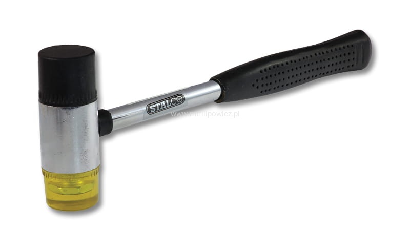 Młotek plastikowo gumowy z metalowym trzonkiem i gumowa rękojeścią.
