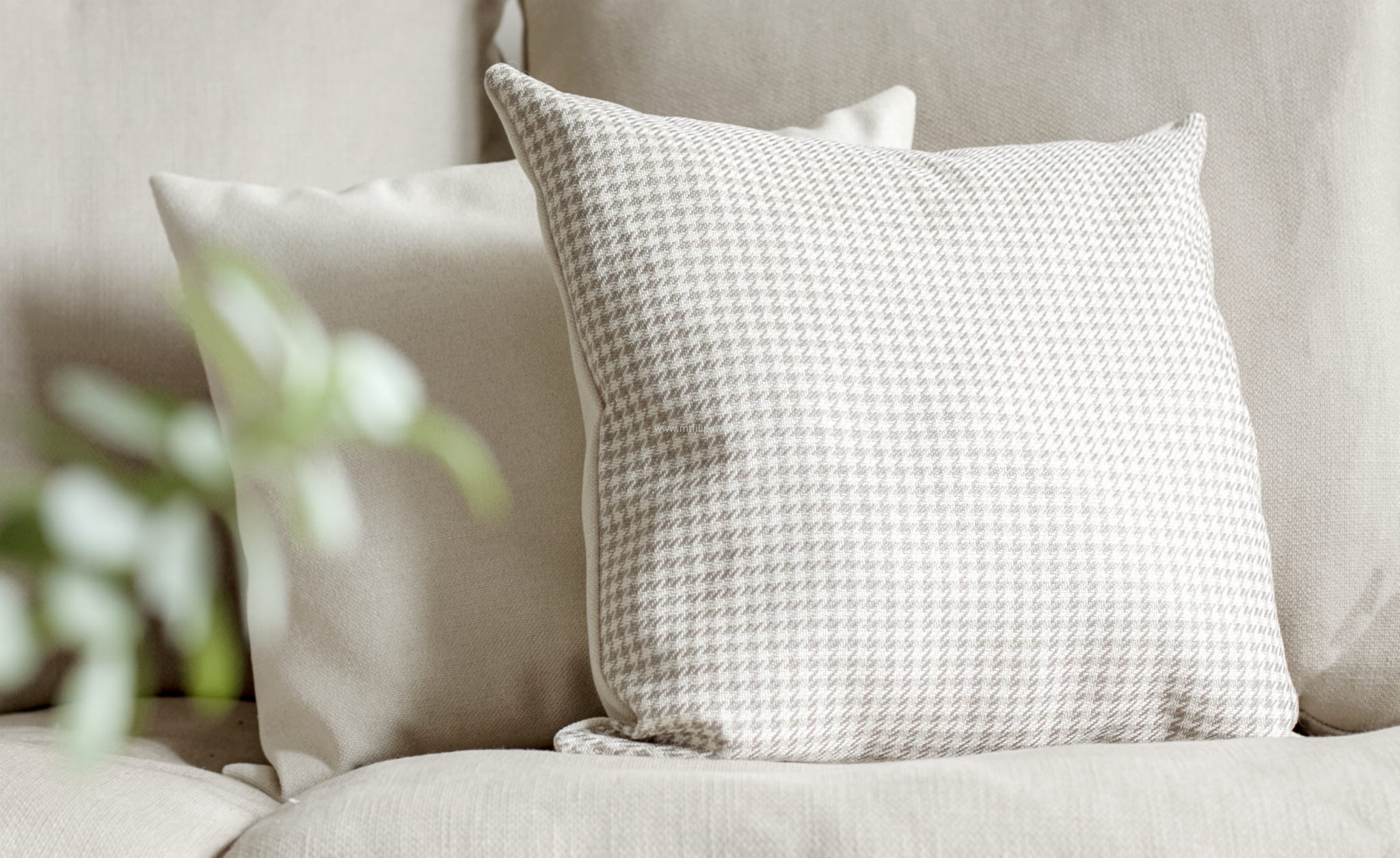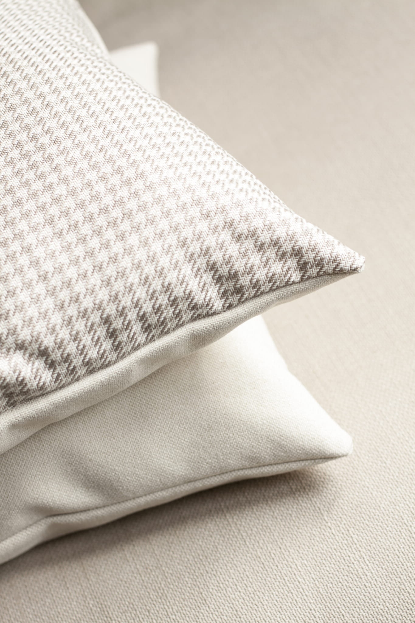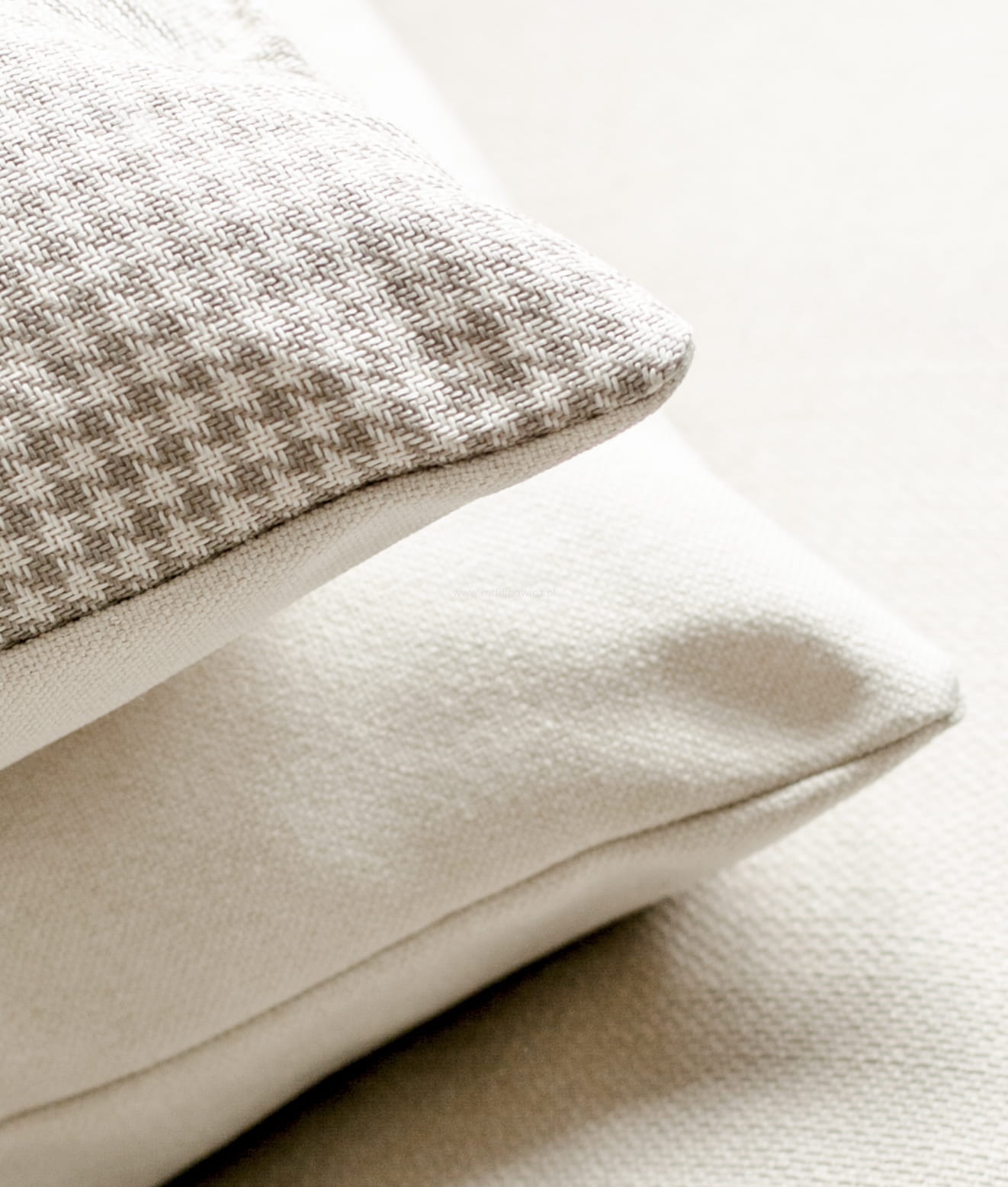 Poduszka dekoracyjna w stonowany i elegancki wzór beżowej pepitki (z łączonych tkanin: przód poduszki Pepitka beżowa oraz tył poduszki Seattle cream). Tkaniny to materiały o strukturze plecionki, imitujące wzór splotu bawełny.