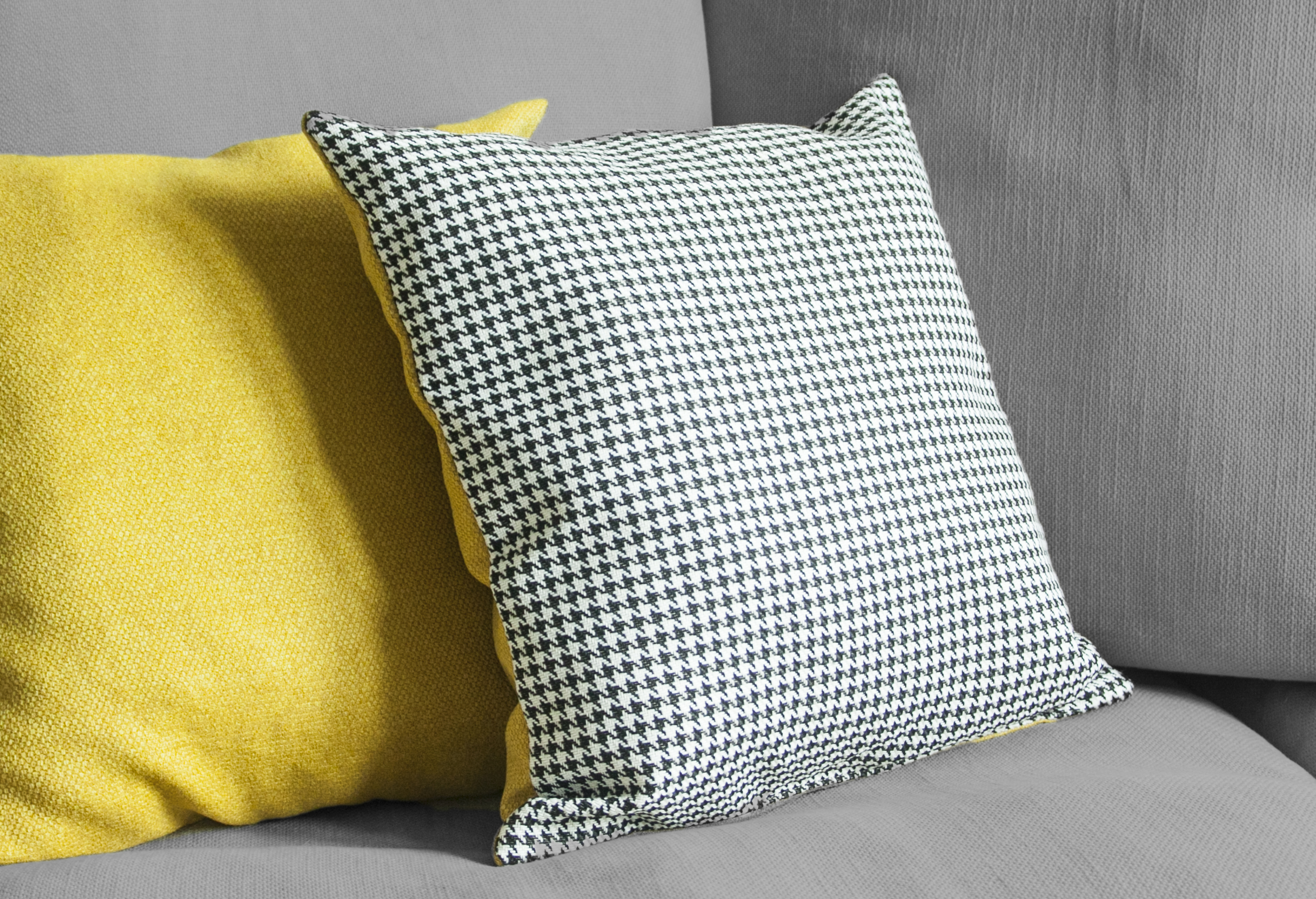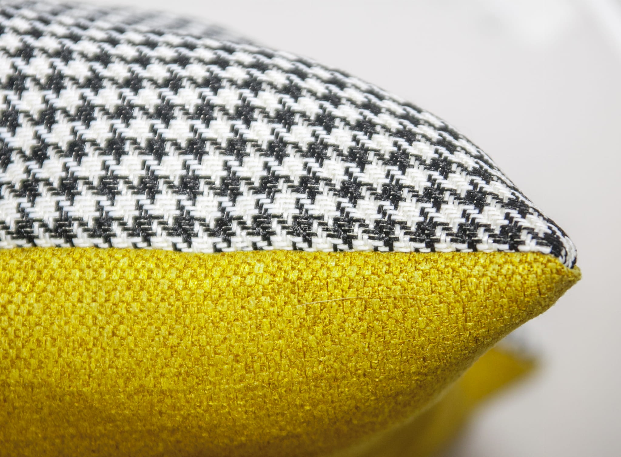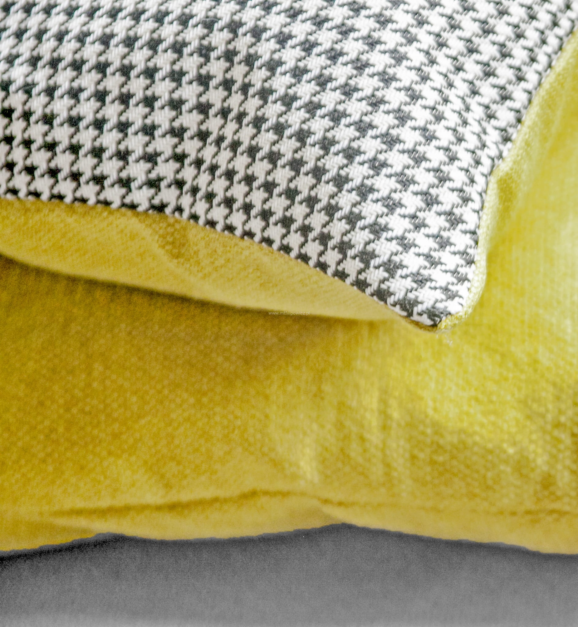 Poduszka dekoracyjna w elegancki wzór czarno-białej pepitki i musztardowego tyłu. (Poduszka z łączonych tkanin: przód poduszki Pepitka czarno-biała oraz tył poduszki musztardowa plecionka). Tkaniny to materiały o strukturze plecionki, imitujące wzór splotu bawełny.