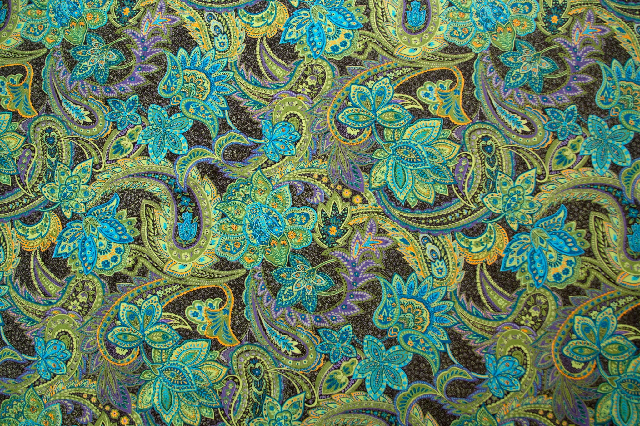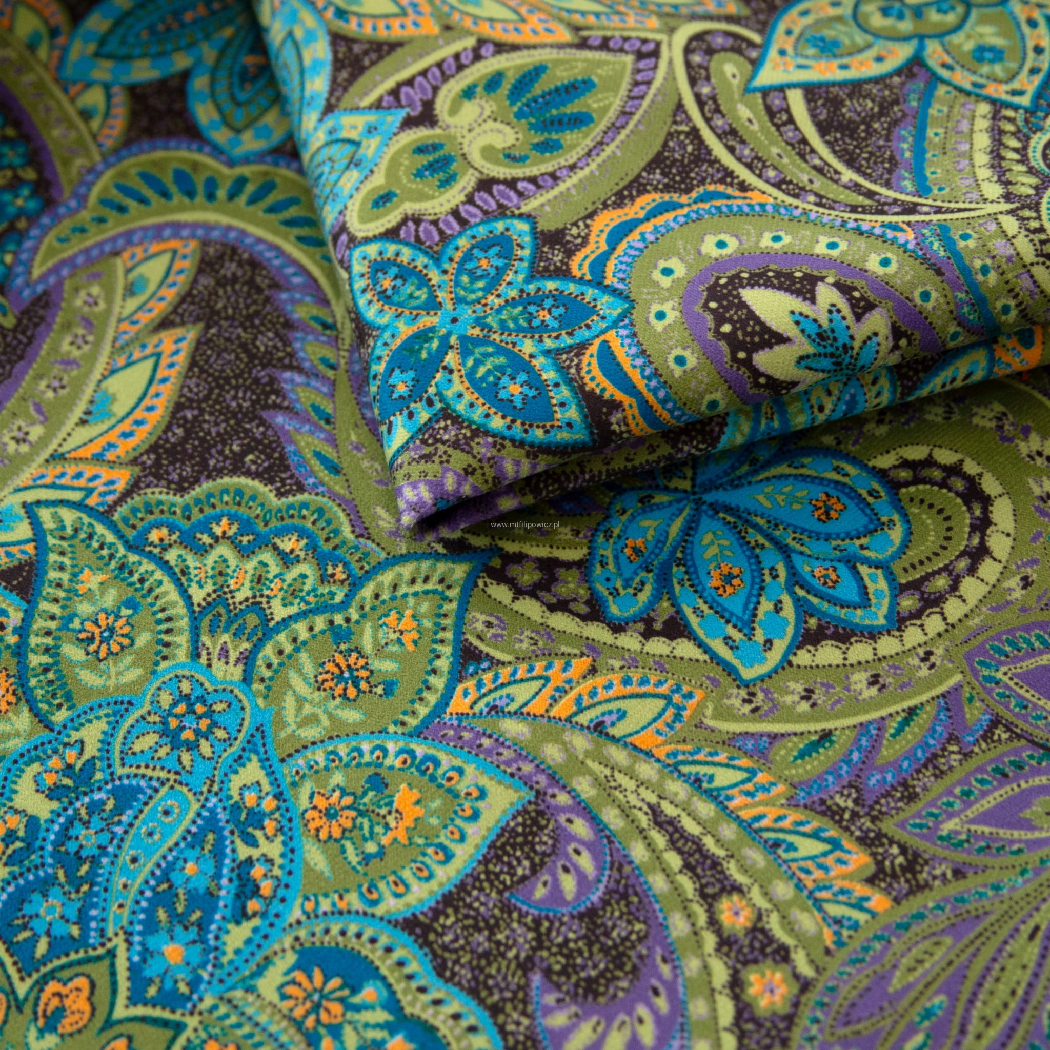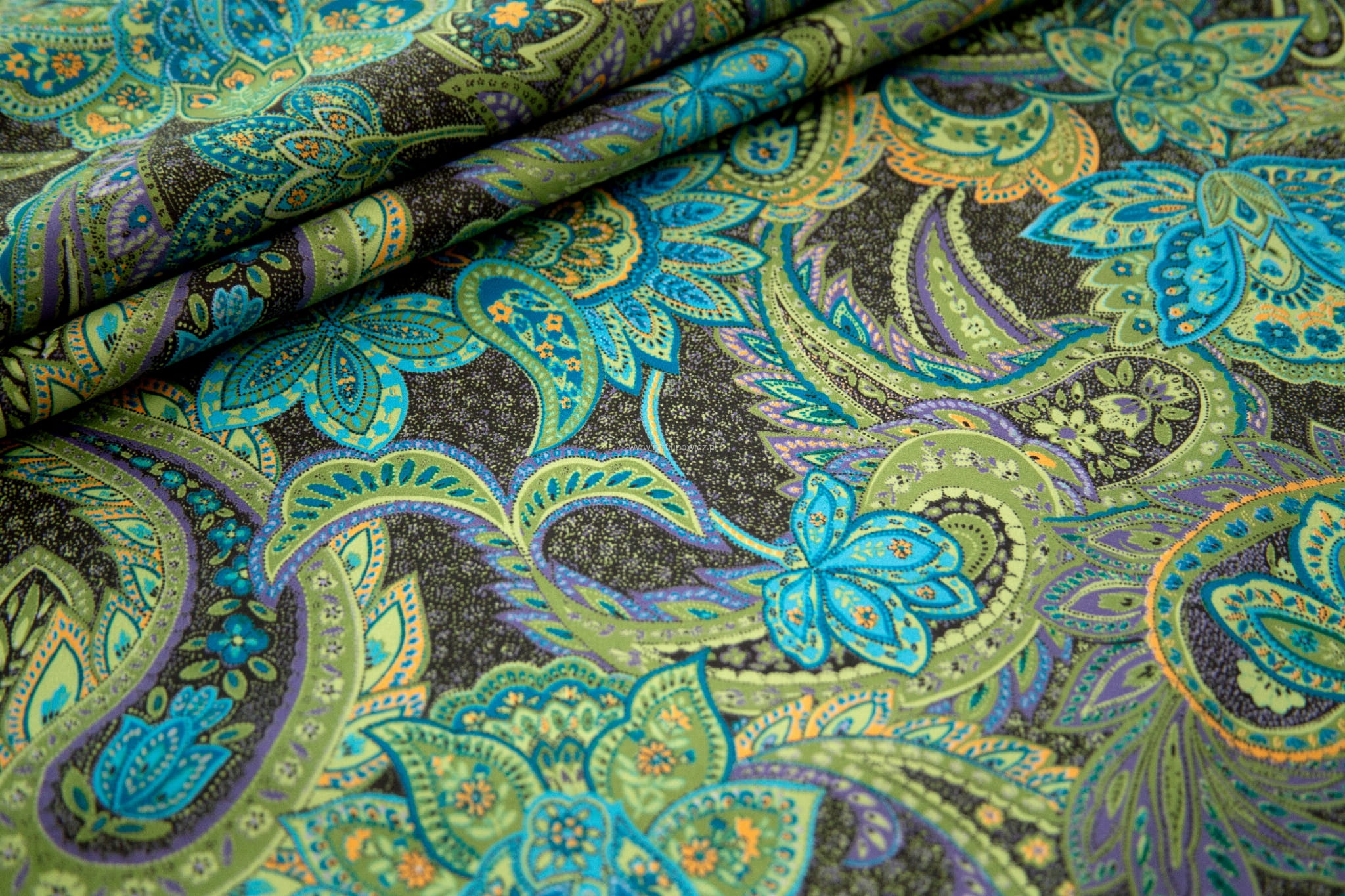 Tkanina tapicerska Alvaro to mocne i nasycone kolory turkusu, zieleni i fioletu z orientalnym, ponadczasowym wzorem paisley.