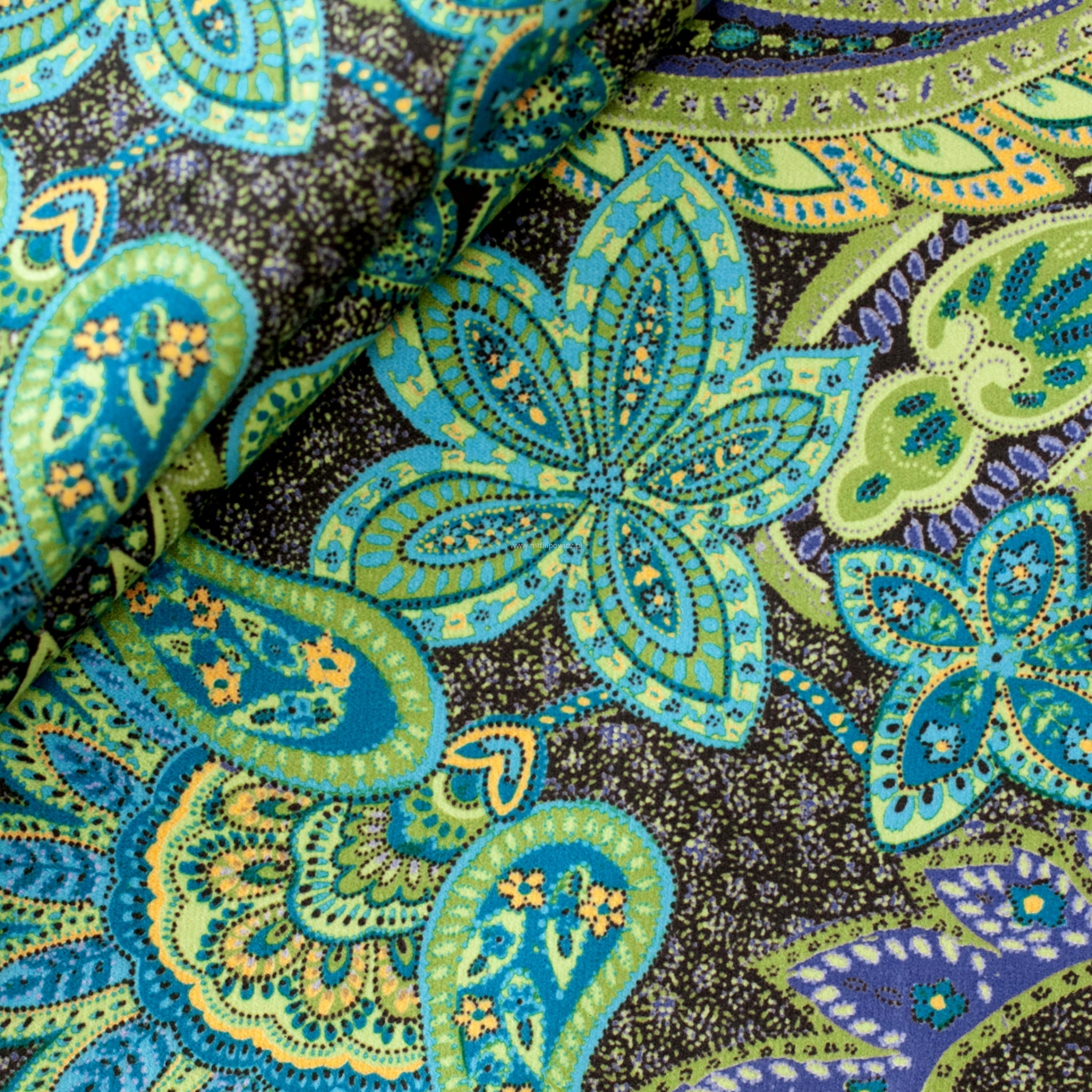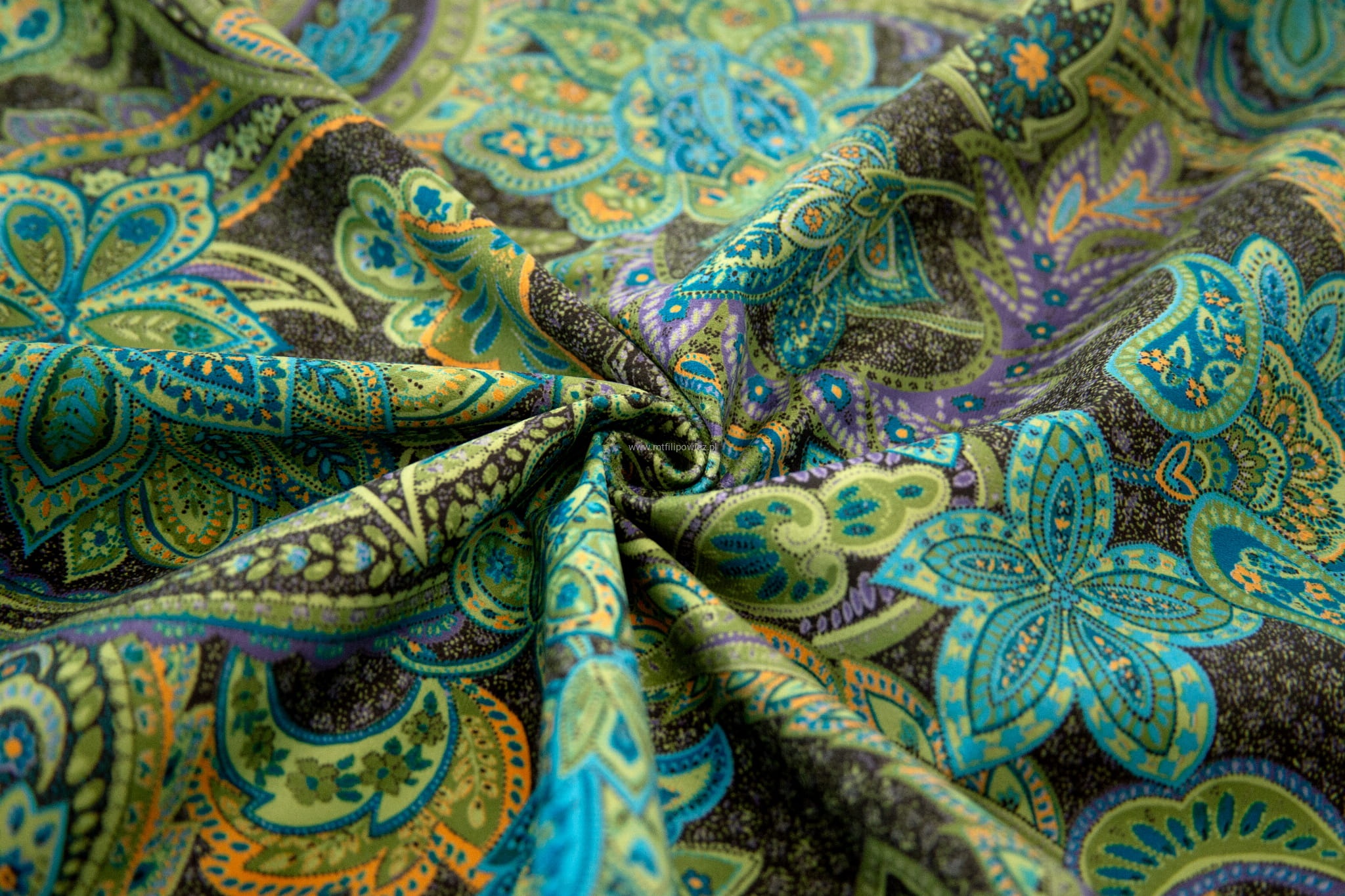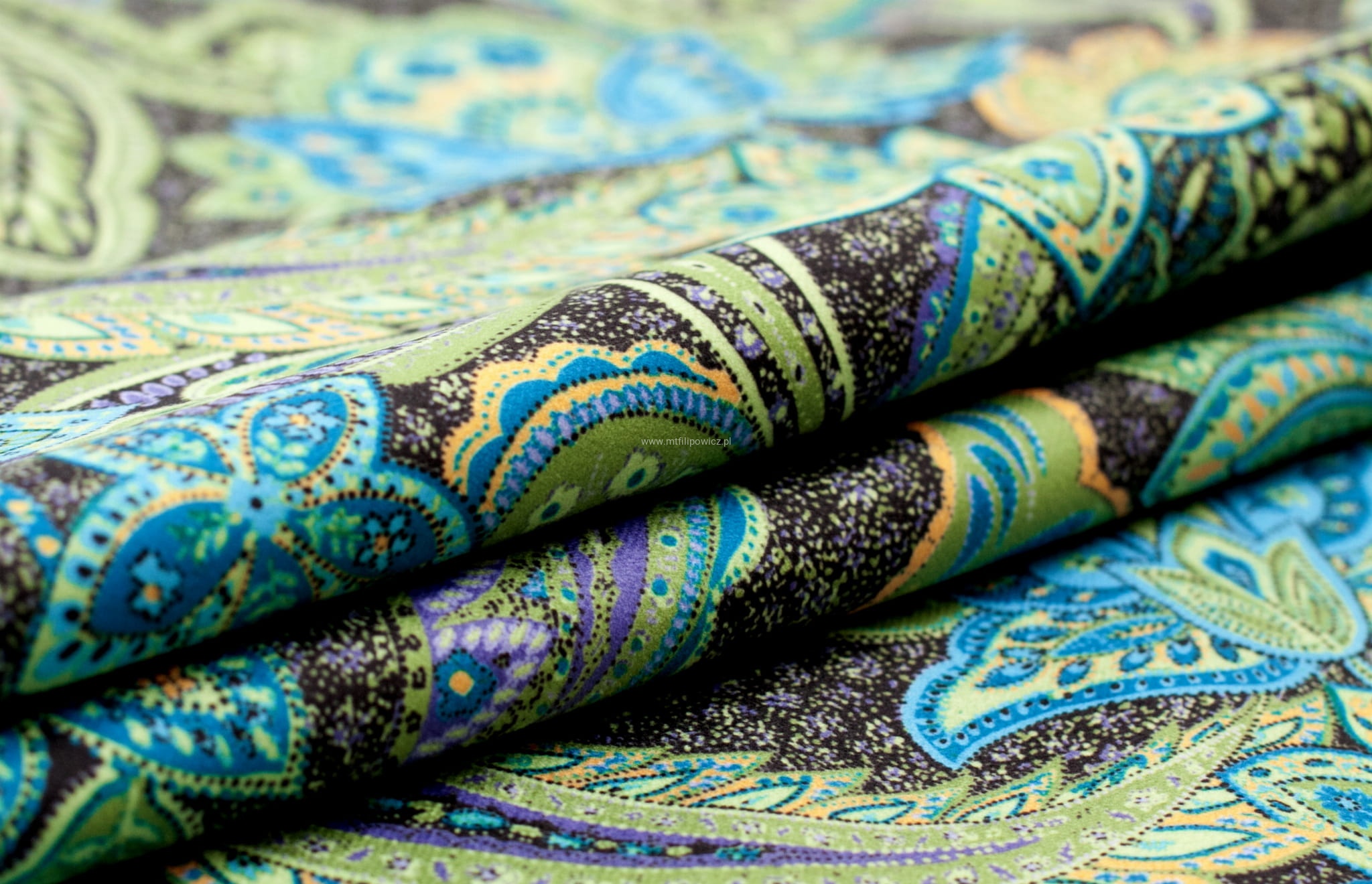 Tkanina tapicerska Alvaro to mocne i nasycone kolory turkusu, zieleni i fioletu z orientalnym, ponadczasowym wzorem paisley.