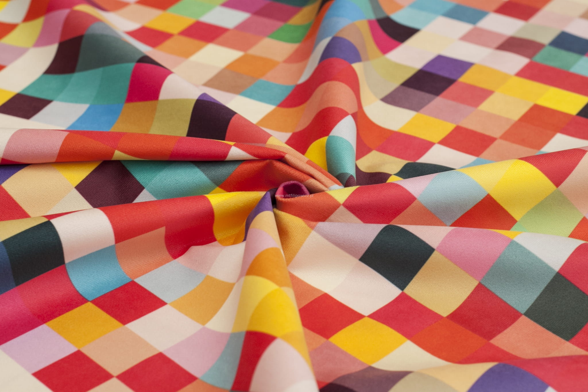 Welurowa tkanina obiciowa w kolorowy wzór, który tworzą małe kolorowe kwadraty w rozmiarze 3cm x 3cm. Mocne kolory i miękkość tkaniny to jej główne atuty.