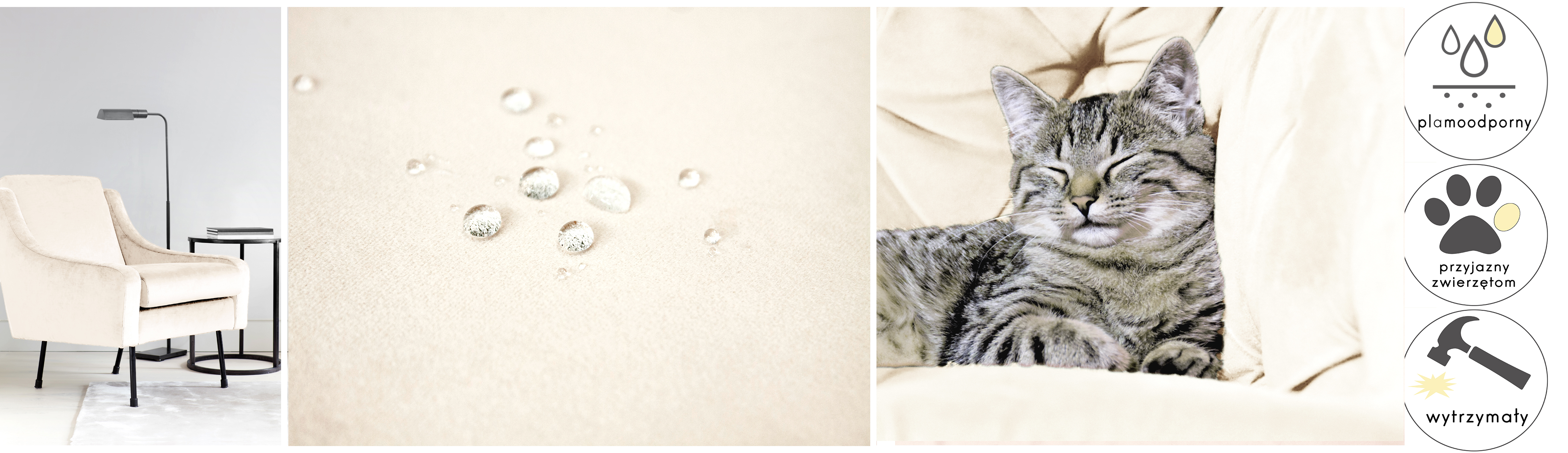 Tkanina Matt Velvet pokryta jest specjalną warstwą ochronną, tworząca hydrofobową powłokę zabezpieczającą przed szybkim przesiąkaniem płynów. Zapobiega to natychmiastowemu absorbowaniu wody przez tkaninę, sprawiając że ciecz skrapla się na powierzchni materiału. Dzięki temu mamy czas na to, aby przy użyciu miękkiej ściereczki bądź ręcznika papierowego, delikatnie odsączyć rozlaną ciecz. Z tkaniny usuniemy również wszystkie inne płyny.