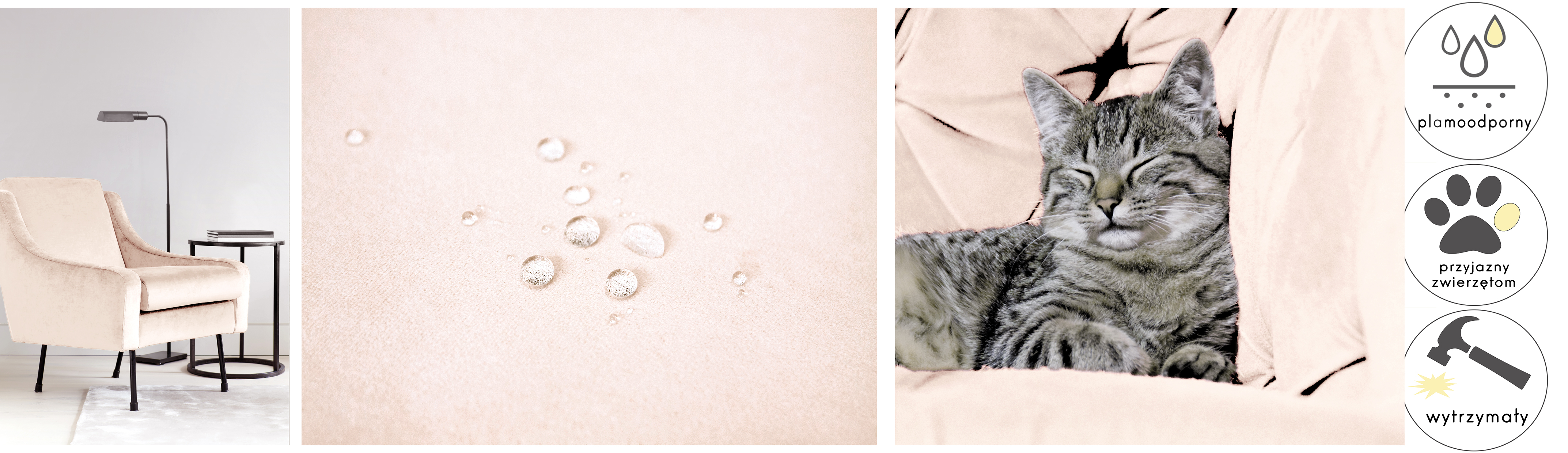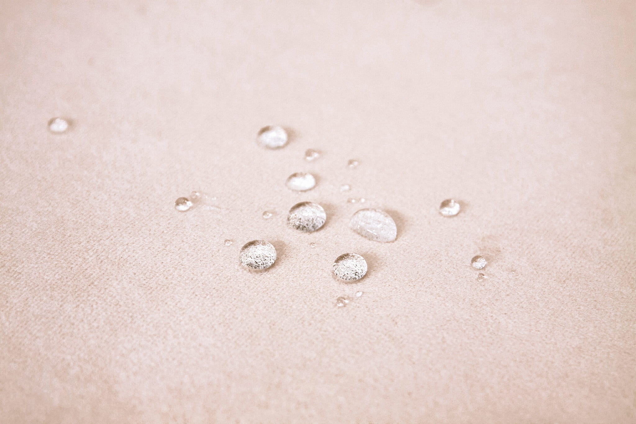 Tkanina Matt Velvet pokryta jest specjalną warstwą ochronną, tworząca hydrofobową powłokę zabezpieczającą przed szybkim przesiąkaniem płynów. Zapobiega to natychmiastowemu absorbowaniu wody przez tkaninę, sprawiając że ciecz skrapla się na powierzchni materiału. Dzięki temu mamy czas na to, aby przy użyciu miękkiej ściereczki bądź ręcznika papierowego, delikatnie odsączyć rozlaną ciecz. Z tkaniny usuniemy również wszystkie inne płyny.