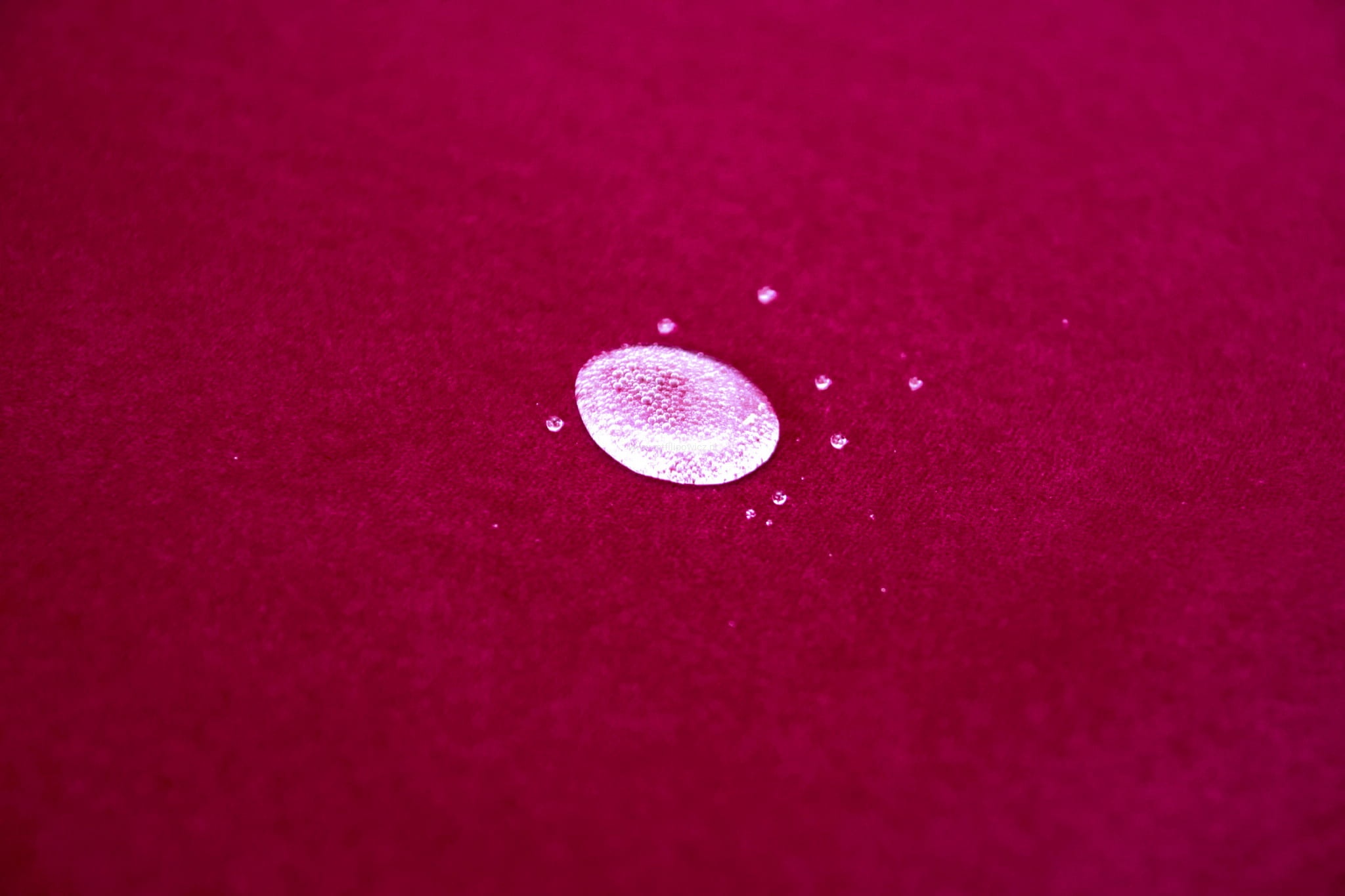 Tkanina Matt Velvet pokryta jest specjalną warstwą ochronną, tworząca hydrofobową powłokę zabezpieczającą przed szybkim przesiąkaniem płynów. Zapobiega to natychmiastowemu absorbowaniu wody przez tkaninę, sprawiając że ciecz skrapla się na powierzchni materiału.