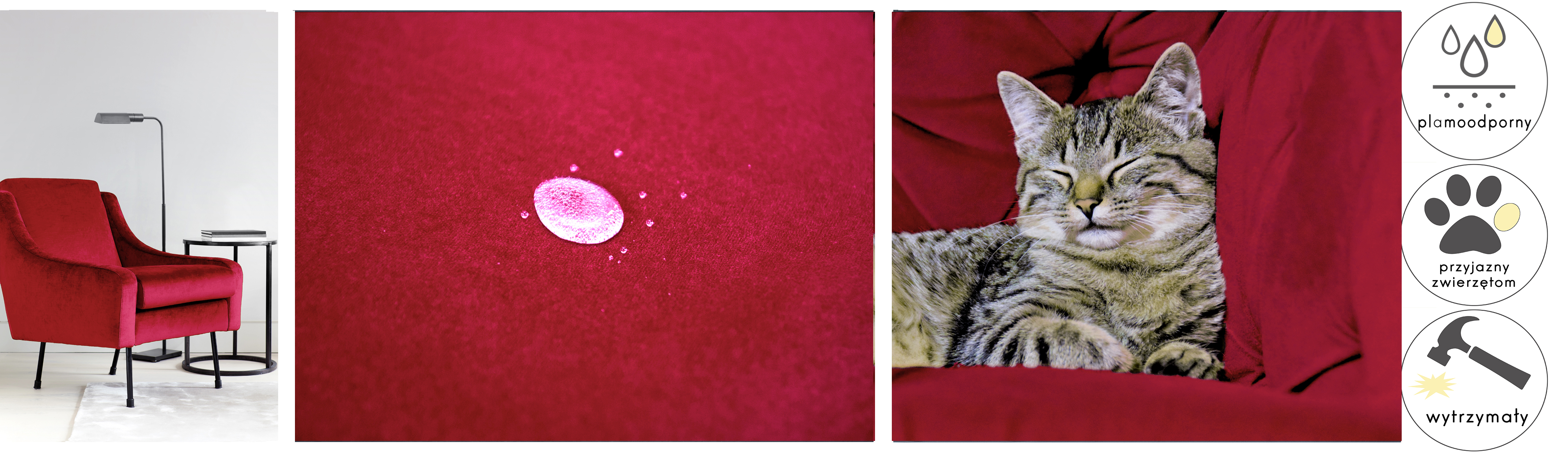 Tkanina bardzo łatwo się czyści przy pomocy wody z mydłem lub płynem do mycia naczyń. Z powierzchni Matt Velvet łatwo wyczyścić różne zabrudzenia w tym również długopis czy rozlane wino.