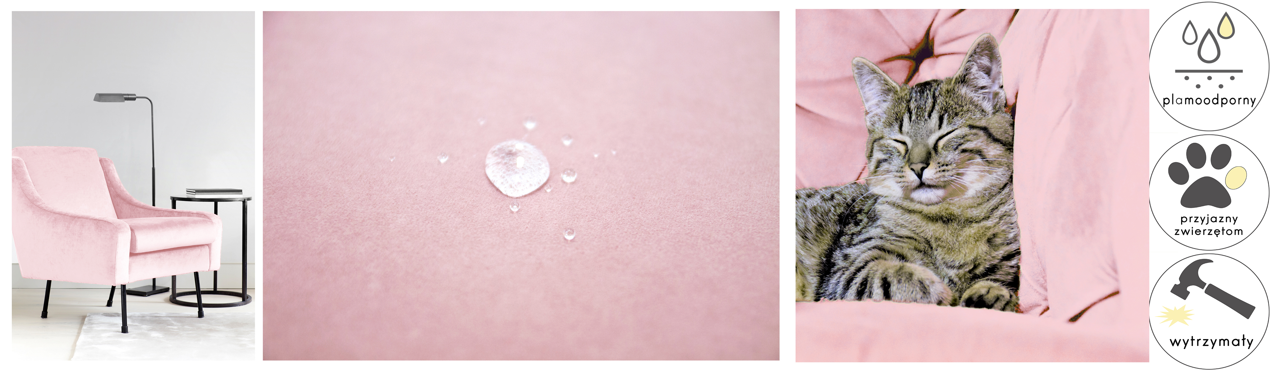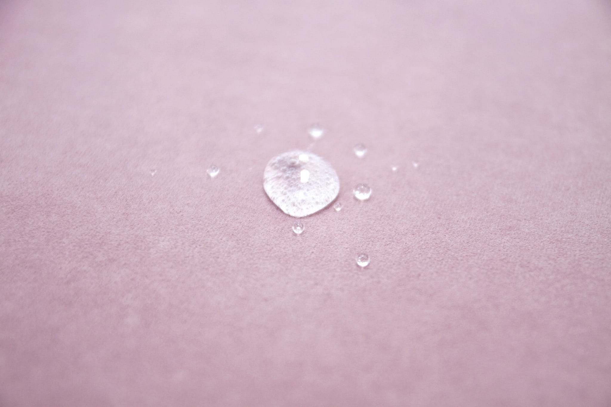 Tkanina Matt Velvet pokryta jest specjalną warstwą ochronną, tworząca hydrofobową powłokę zabezpieczającą przed szybkim przesiąkaniem płynów. Zapobiega to natychmiastowemu absorbowaniu wody przez tkaninę, sprawiając że ciecz skrapla się na powierzchni materiału. Dzięki temu mamy czas na to, aby przy użyciu miękkiej ściereczki bądź ręcznika papierowego, delikatnie odsączyć rozlaną ciecz. Z tkaniny usuniemy również wszystkie inne płyny.