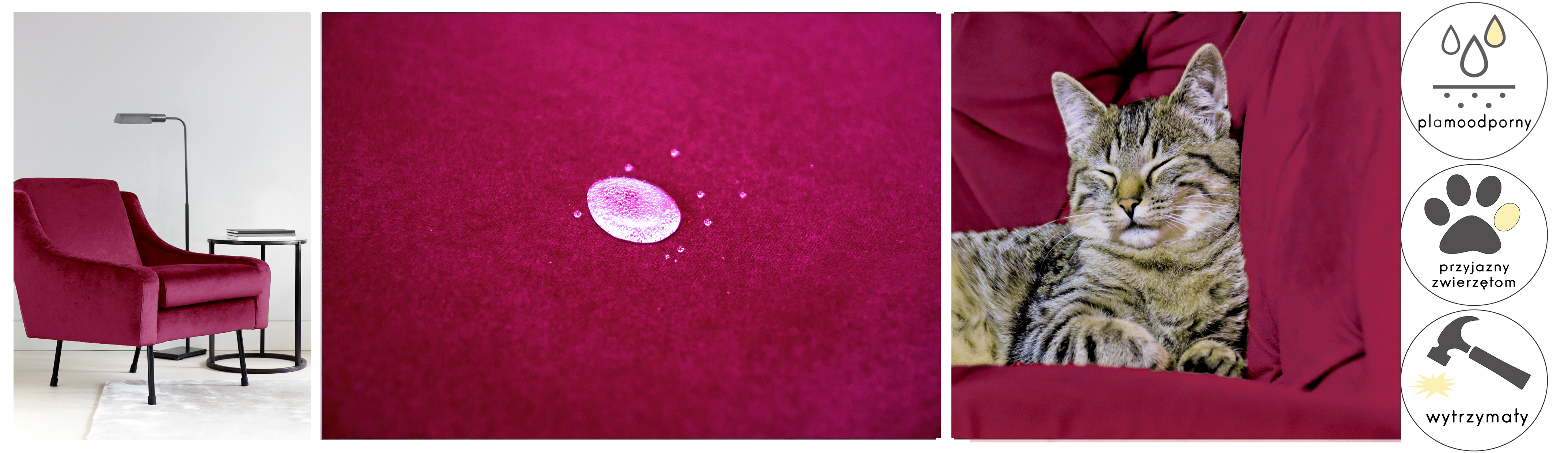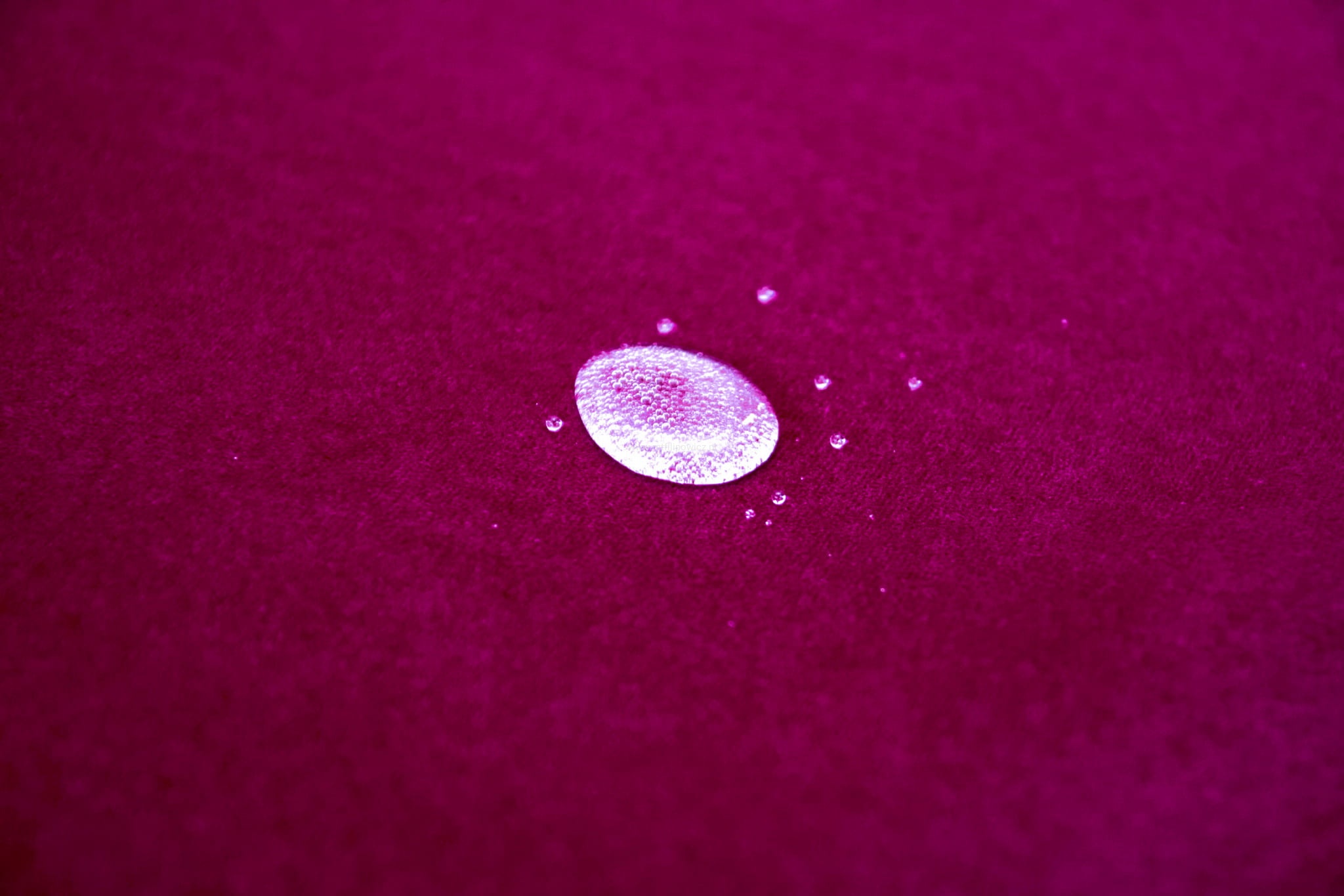 Tkanina Matt Velvet pokryta jest specjalną warstwą ochronną, tworząca hydrofobową powłokę zabezpieczającą przed szybkim przesiąkaniem płynów. Zapobiega to natychmiastowemu absorbowaniu wody przez tkaninę, sprawiając że ciecz skrapla się na powierzchni materiału. Dzięki temu mamy czas na to, aby przy użyciu miękkiej ściereczki bądź ręcznika papierowego, delikatnie odsączyć rozlaną ciecz. Z tkaniny usuniemy również wszystkie inne płyny.