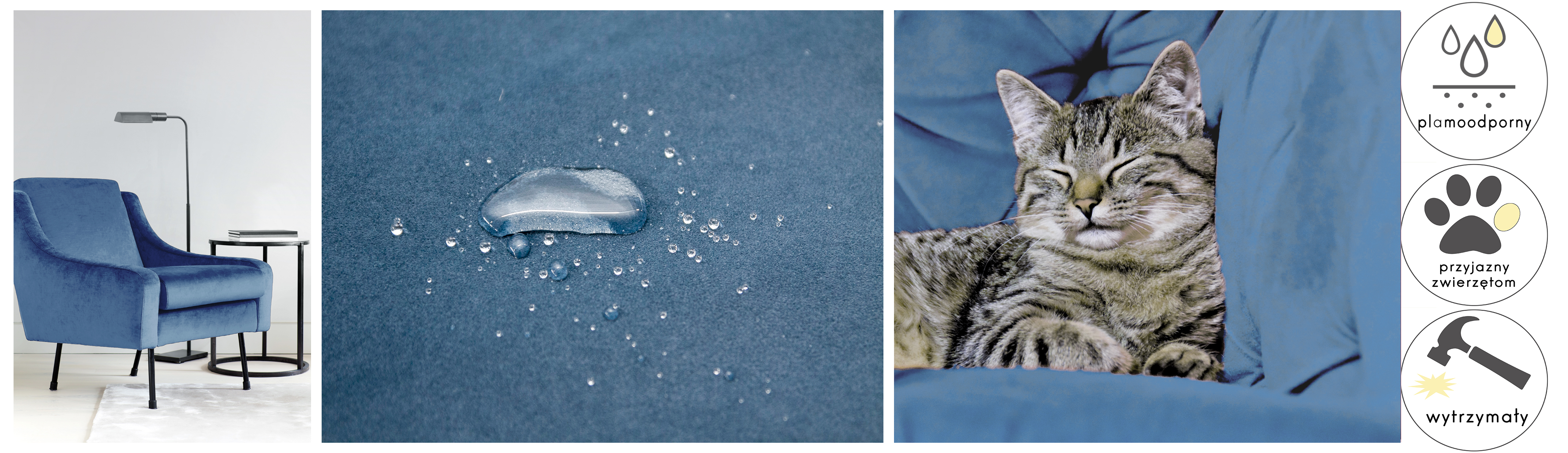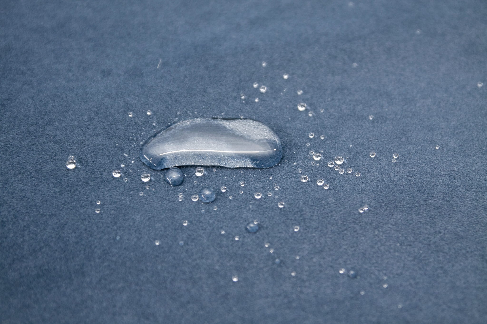 Tkanina Matt Velvet pokryta jest specjalną warstwą ochronną, tworząca hydrofobową powłokę zabezpieczającą przed szybkim przesiąkaniem płynów. Zapobiega to natychmiastowemu absorbowaniu wody przez tkaninę, sprawiając że ciecz skrapla się na powierzchni materiału. Dzięki temu mamy czas na to, aby przy użyciu miękkiej ściereczki bądź ręcznika papierowego, delikatnie odsączyć rozlaną ciecz. Z tkaniny usuniemy również wszystkie inne płyny.