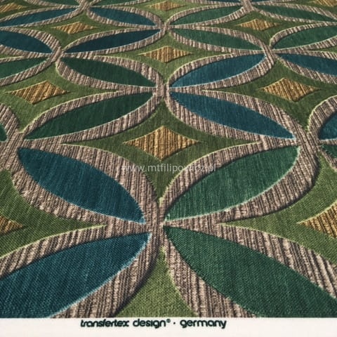 Tkanina obiciowa i dekoracyjna Medalion zielono-turkusowy, o strukturze/splocie przypominającym naturalną bawełnę miłą w dotyku.