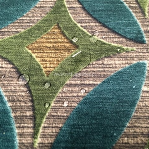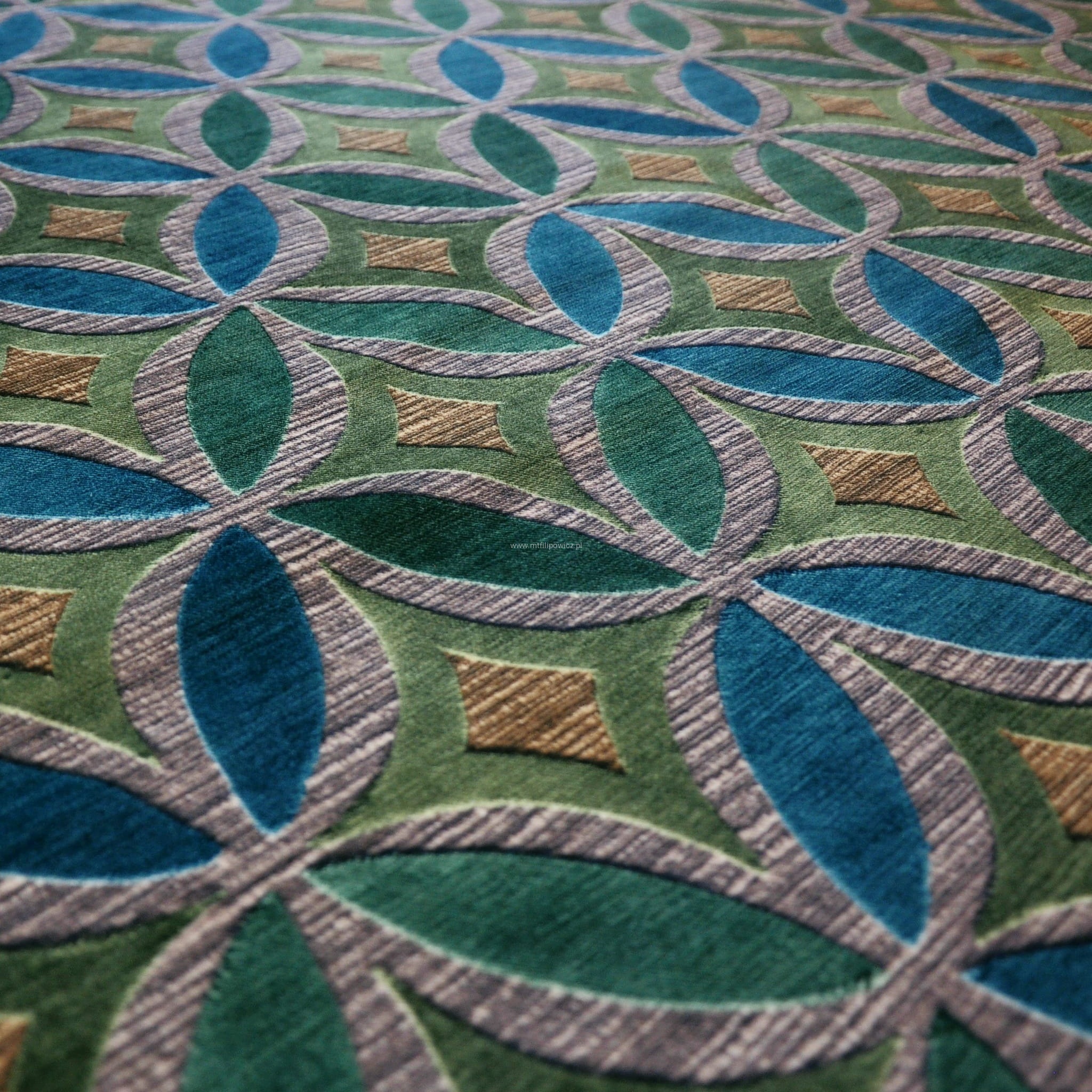 Tkanina Medalion zielono-turkusowy to gruby welur z nadrukowanym wyrazistym wzorem geometrycznym medalionu, miły w dotyku. EASY TO CLEAN. Tkanina zmywalna. WATER REPELLENT. Nie wchłania płynów.