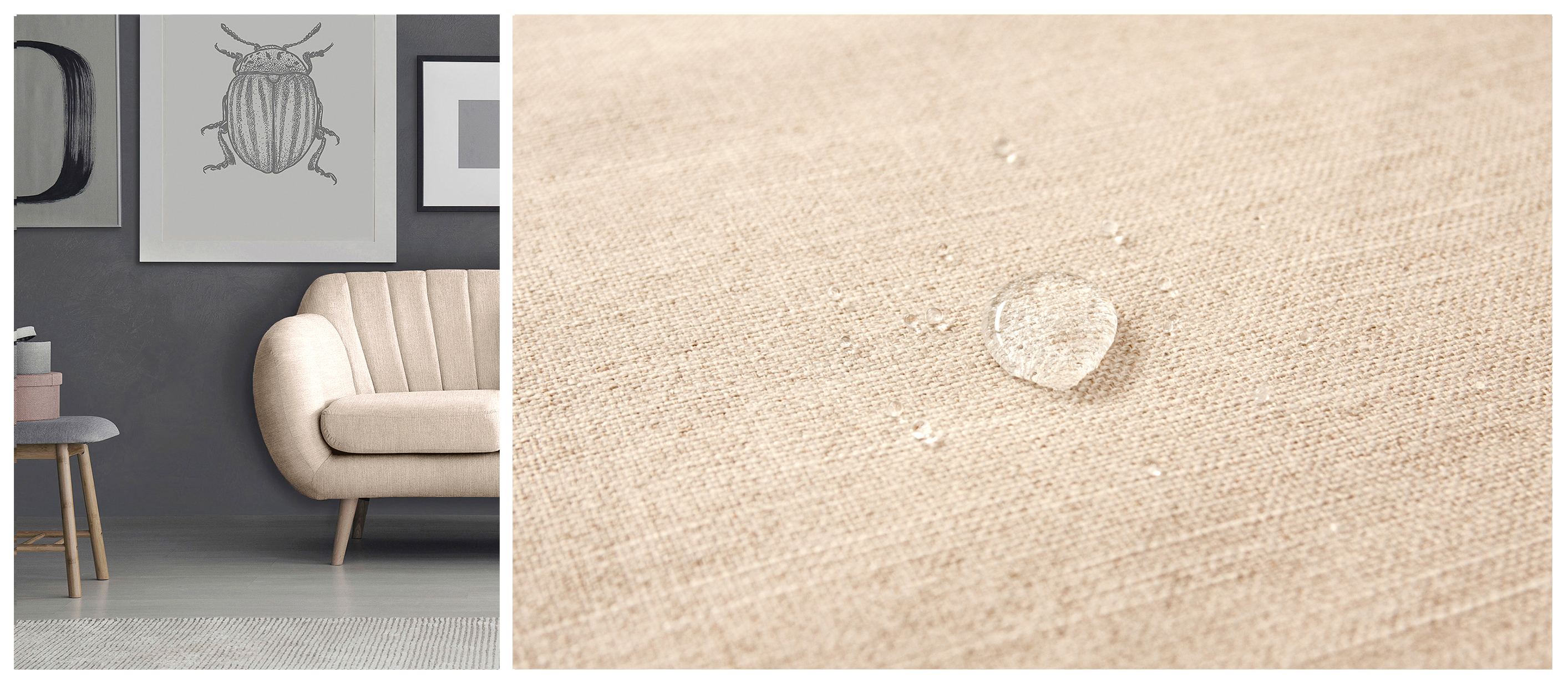 Tkanina MELVA pokryta jest specjalną warstwą ochronną, tworząca hydrofobową powłokę zabezpieczającą przed szybkim przesiąkaniem płynów. Zapobiega to natychmiastowemu absorbowaniu wody przez tkaninę, sprawiając że ciecz skrapla się na powierzchni materiału. Dzięki temu mamy czas na to, aby przy użyciu miękkiej ściereczki bądź ręcznika papierowego, delikatnie odsączyć rozlaną ciecz.