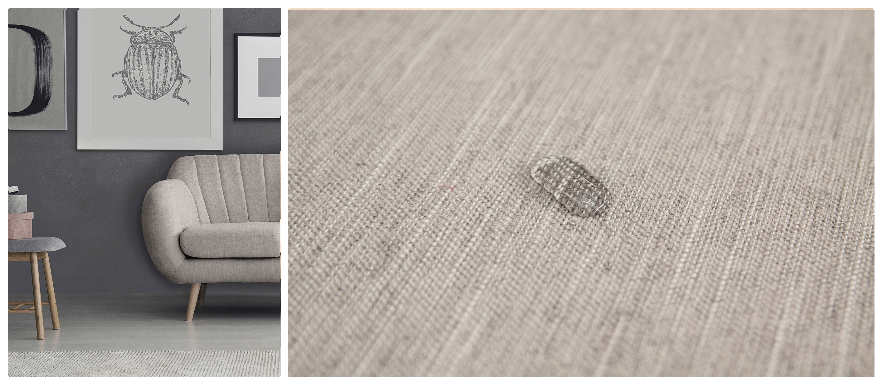 Tkanina MELVA pokryta jest specjalną warstwą ochronną, tworząca hydrofobową powłokę zabezpieczającą przed szybkim przesiąkaniem płynów. Zapobiega to natychmiastowemu absorbowaniu wody przez tkaninę, sprawiając że ciecz skrapla się na powierzchni materiału. Dzięki temu mamy czas na to, aby przy użyciu miękkiej ściereczki bądź ręcznika papierowego, delikatnie odsączyć rozlaną ciecz.