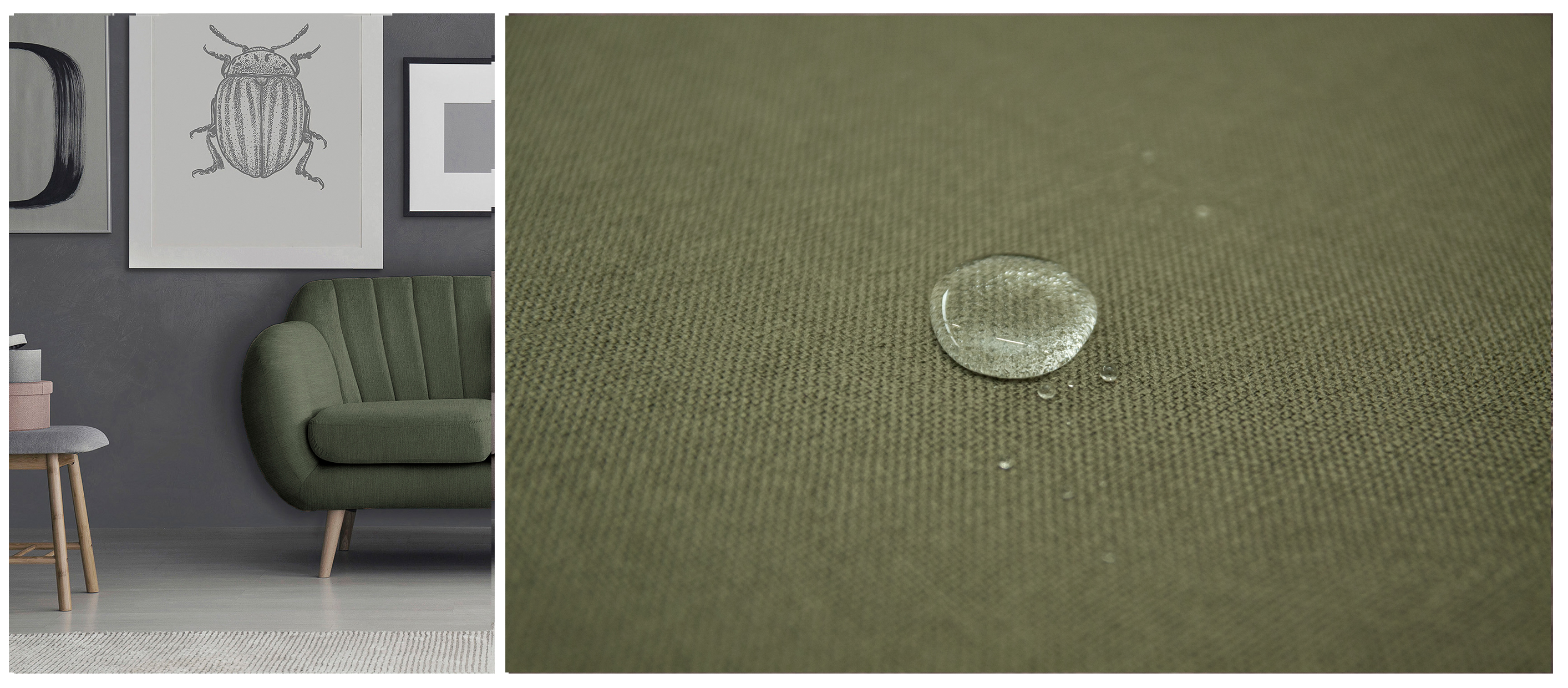 Tkanina MELVA pokryta jest specjalną warstwą ochronną, tworząca hydrofobową powłokę zabezpieczającą przed szybkim przesiąkaniem płynów. Zapobiega to natychmiastowemu absorbowaniu wody przez tkaninę, sprawiając że ciecz skrapla się na powierzchni materiału. Dzięki temu mamy czas na to, aby przy użyciu miękkiej ściereczki bądź ręcznika papierowego, delikatnie odsączyć rozlaną ciecz.