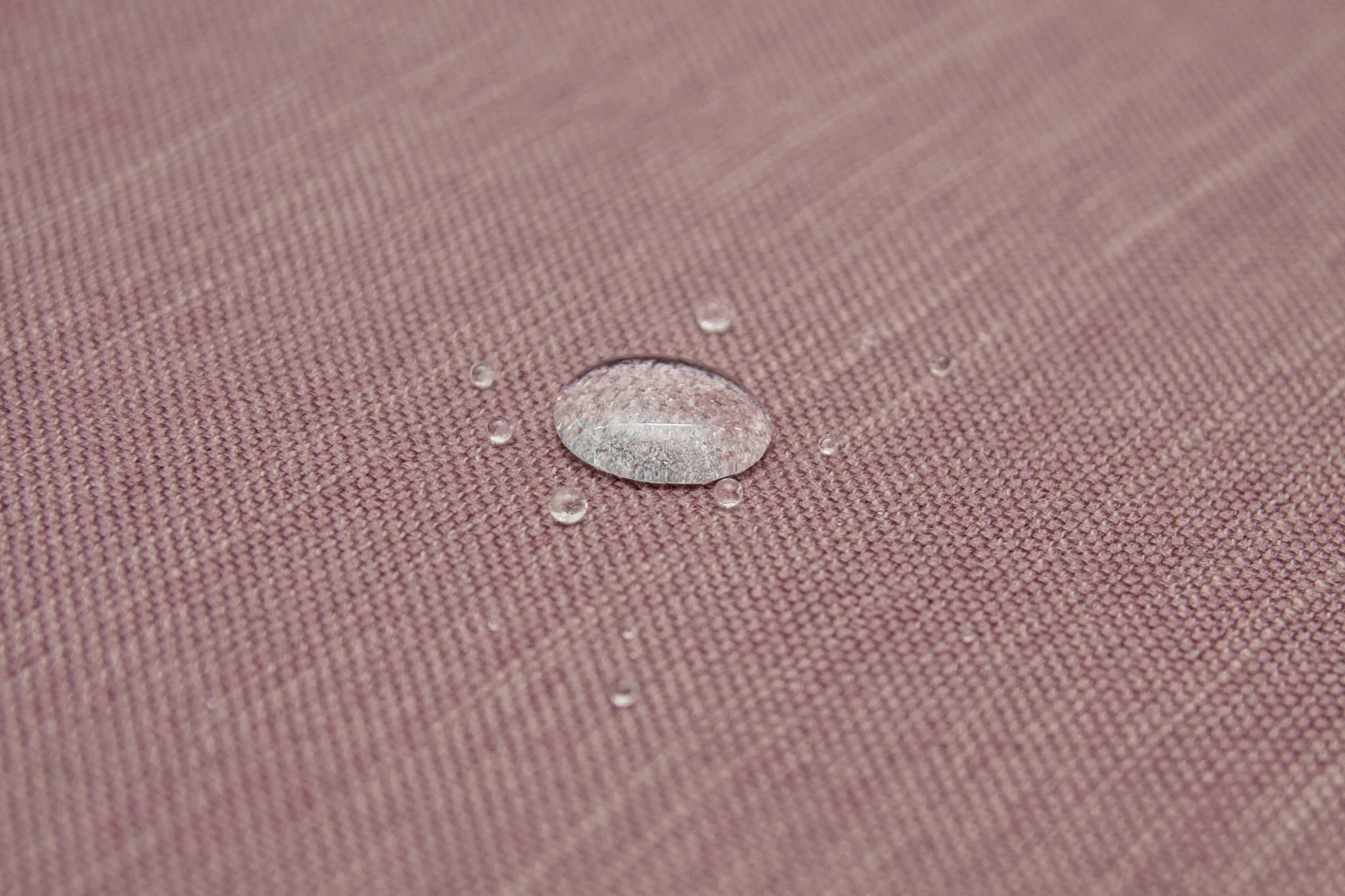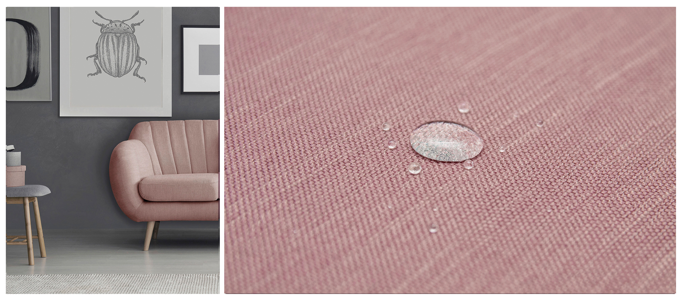 Tkanina MELVA pokryta jest specjalną warstwą ochronną, tworząca hydrofobową powłokę zabezpieczającą przed szybkim przesiąkaniem płynów. Zapobiega to natychmiastowemu absorbowaniu wody przez tkaninę, sprawiając że ciecz skrapla się na powierzchni materiału. Dzięki temu mamy czas na to, aby przy użyciu miękkiej ściereczki bądź ręcznika papierowego, delikatnie odsączyć rozlaną ciecz.