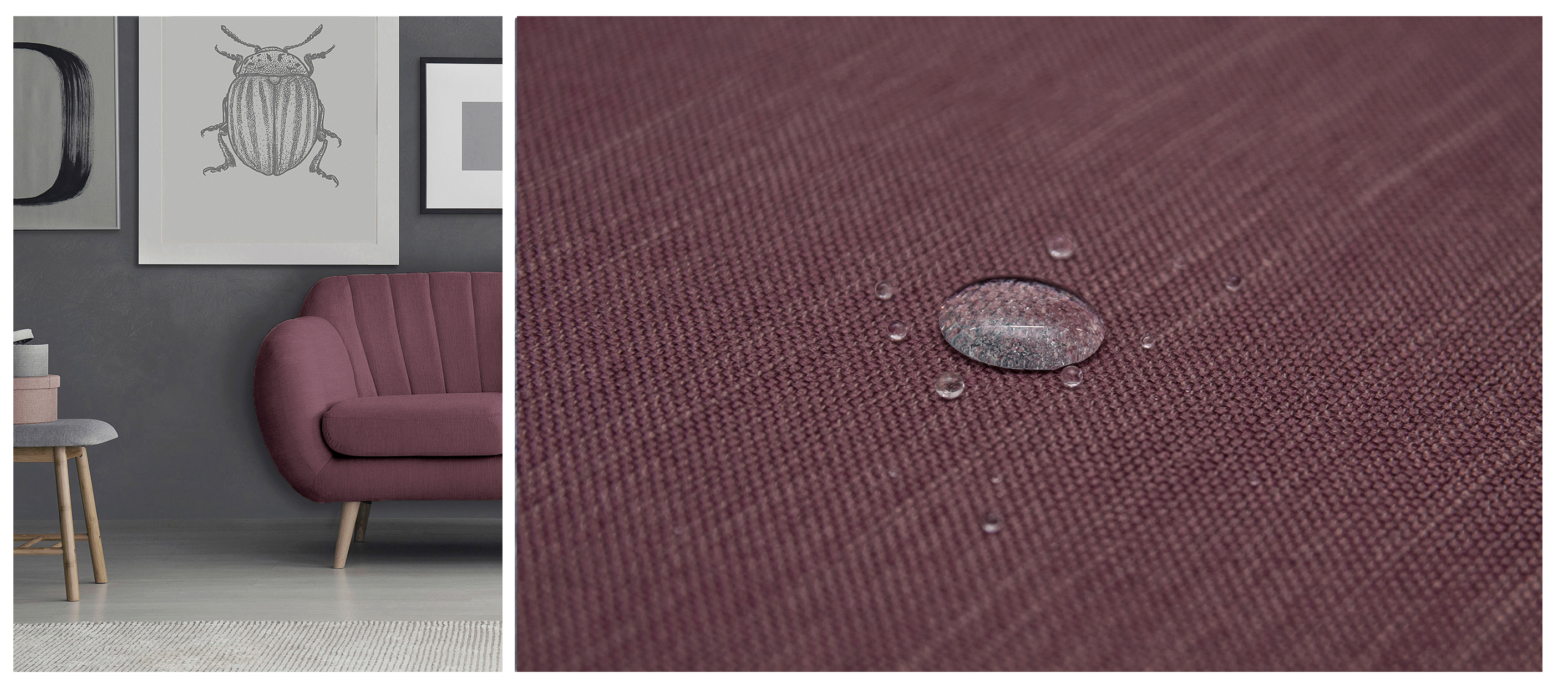Tkanina MELVA pokryta jest specjalną warstwą ochronną, tworząca hydrofobową powłokę zabezpieczającą przed szybkim przesiąkaniem płynów. Zapobiega to natychmiastowemu absorbowaniu wody przez tkaninę, sprawiając że ciecz skrapla się na powierzchni materiału. Dzięki temu mamy czas na to, aby przy użyciu miękkiej ściereczki bądź ręcznika papierowego, delikatnie odsączyć rozlaną ciecz.
