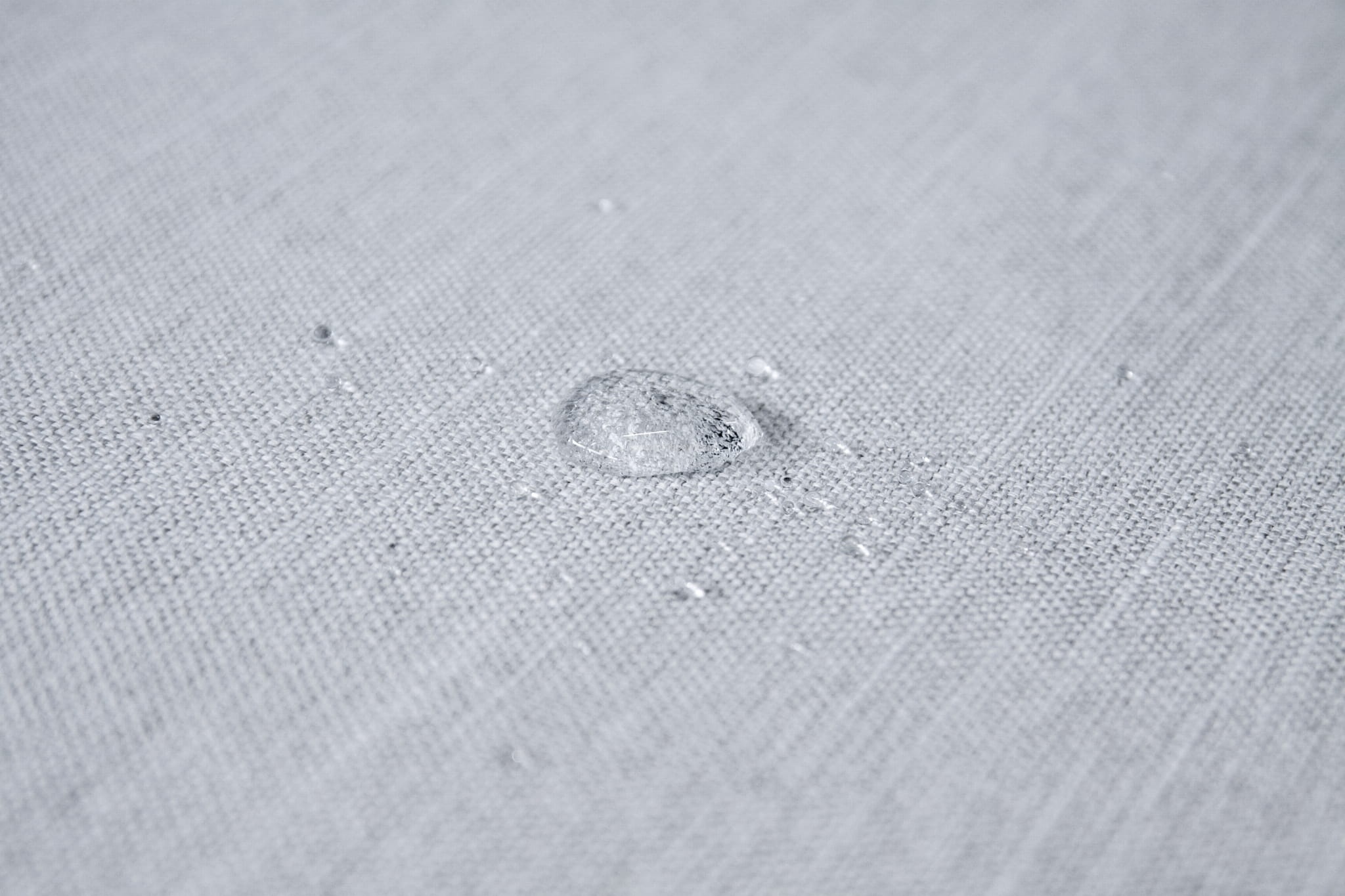 Tkanina MELVA pokryta jest specjalną warstwą ochronną, tworząca hydrofobową powłokę zabezpieczającą przed szybkim przesiąkaniem płynów. Zapobiega to natychmiastowemu absorbowaniu wody przez tkaninę, sprawiając że ciecz skrapla się na powierzchni materiału. Dzięki temu mamy czas na to, aby przy użyciu miękkiej ściereczki bądź ręcznika papierowego, delikatnie odsączyć rozlaną ciecz.