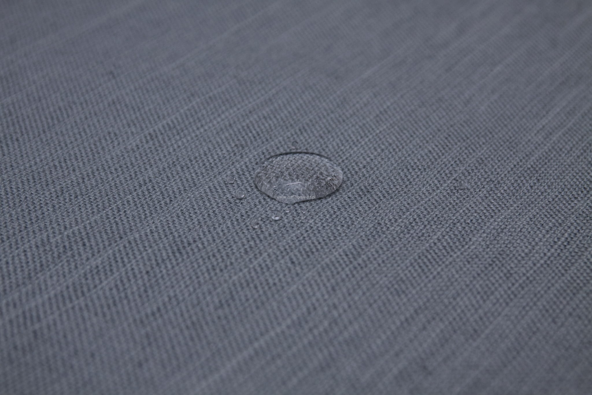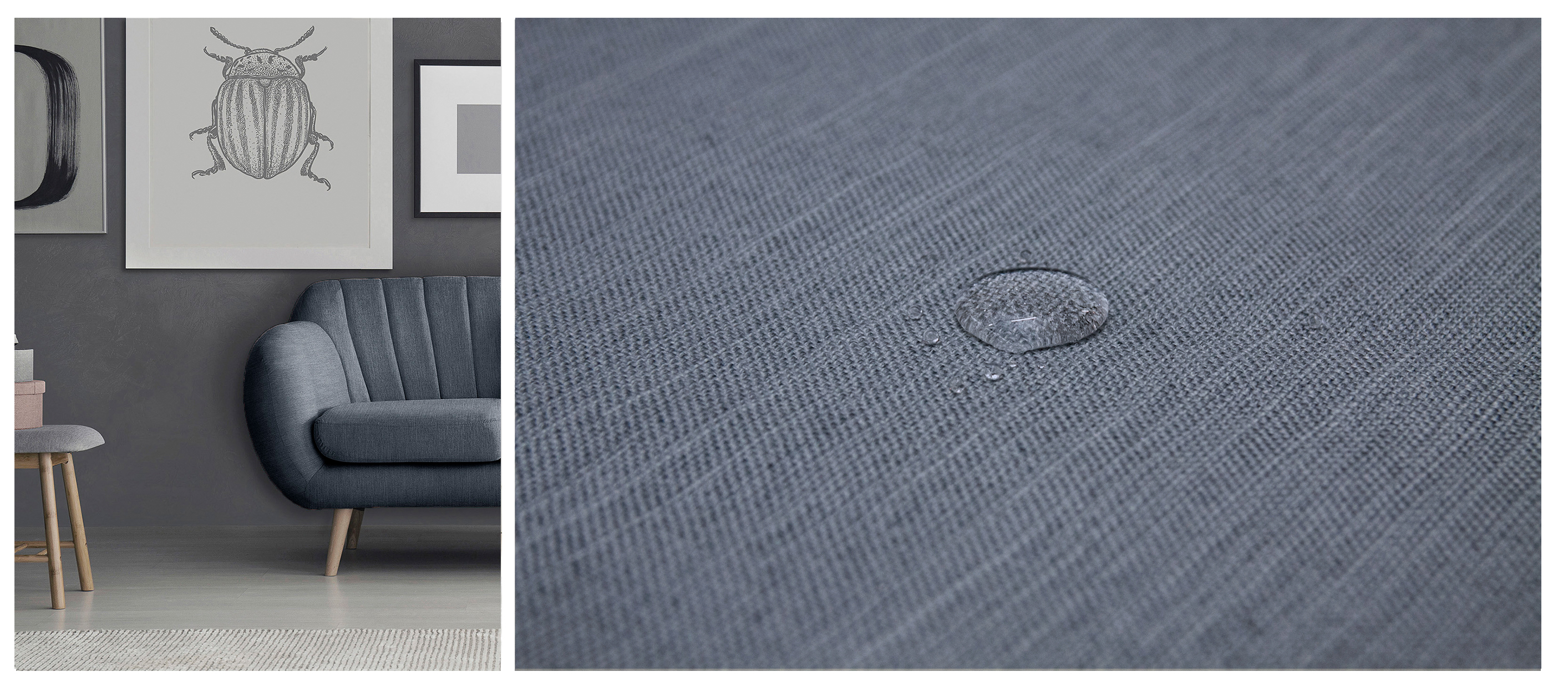 Tkanina MELVA pokryta jest specjalną warstwą ochronną, tworząca hydrofobową powłokę zabezpieczającą przed szybkim przesiąkaniem płynów. Zapobiega to natychmiastowemu absorbowaniu wody przez tkaninę, sprawiając że ciecz skrapla się na powierzchni materiału. Dzięki temu mamy czas na to, aby przy użyciu miękkiej ściereczki bądź ręcznika papierowego, delikatnie odsączyć rozlaną ciecz.