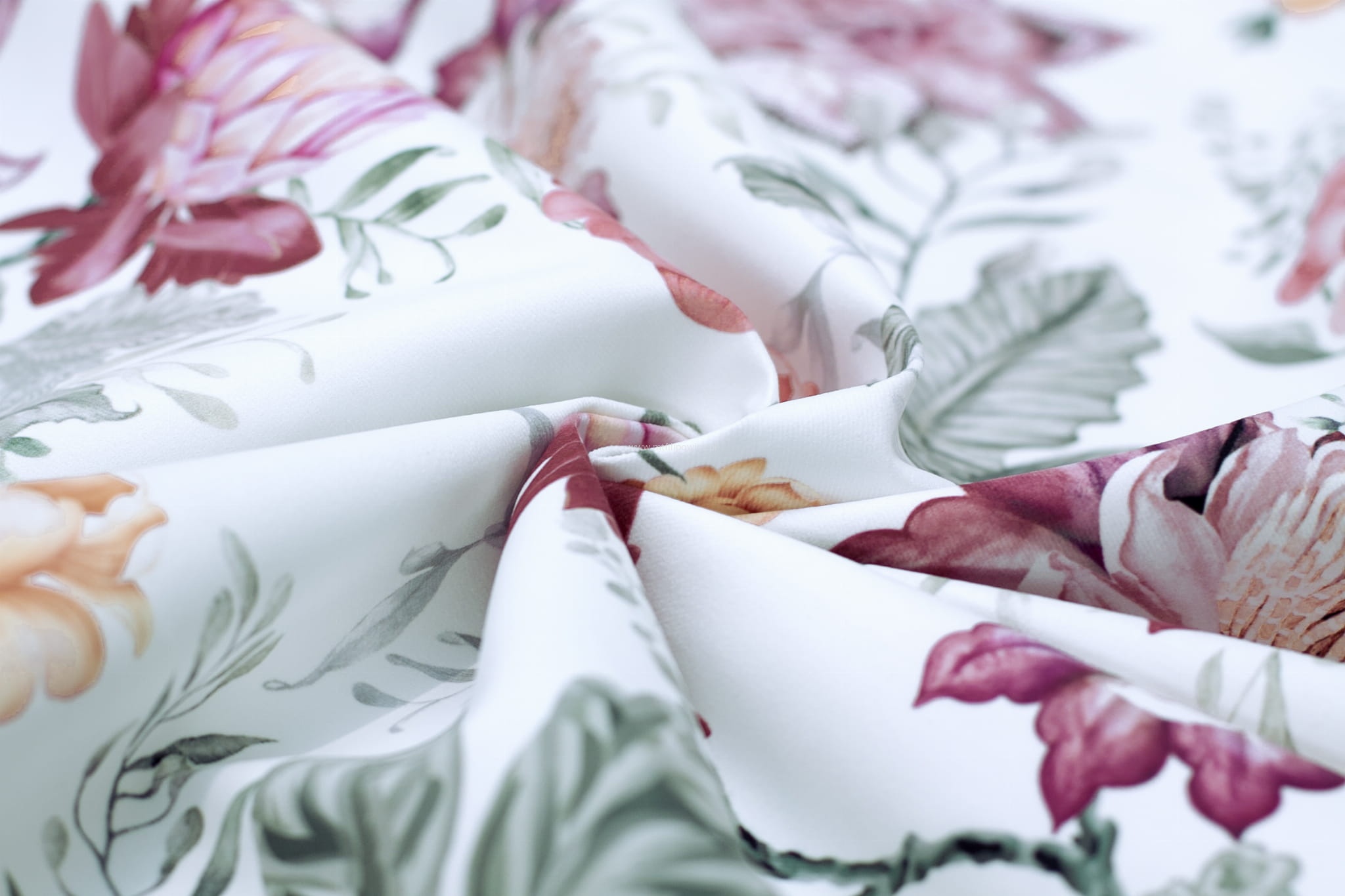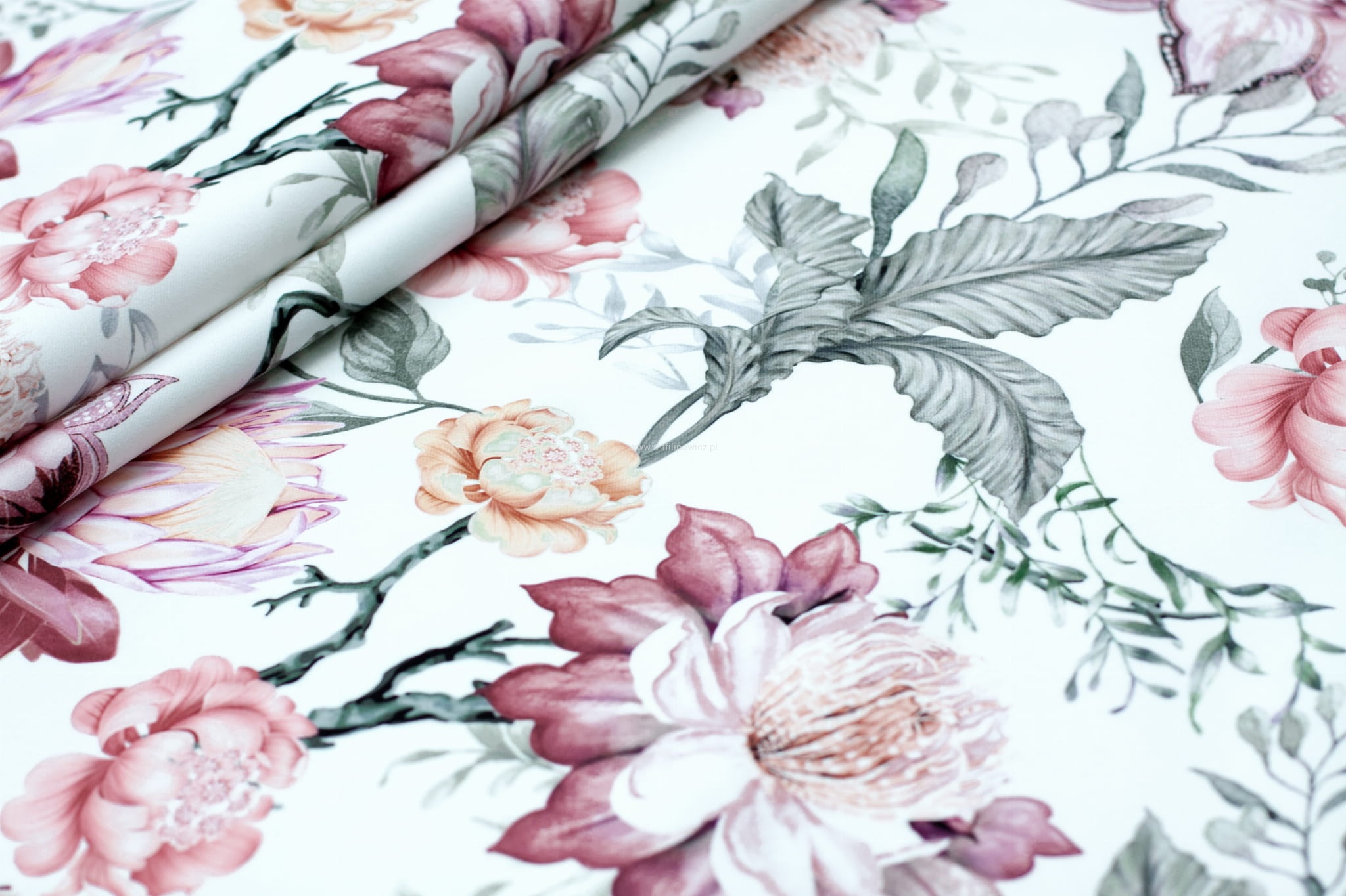 Paradiso to przepiękny welur tapicerski z kolorowym i wyrazistym motywem florystycznym. Kwiaty na białym tle wyglądają jak malowane. Tkanina mocna i wytrzymała (210 000 cykli), jej zaletą jest również miękkość i łatwość w układaniu na meblach.