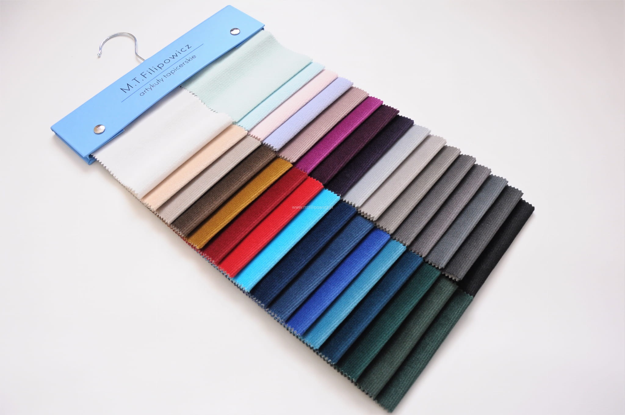 Tkanina bardzo miła w dotyku, lekko połyskująca i trwała - ścieralność Test Martindale 50000, skład 100% PES. Posiada certyfikat Oeko-Tex.