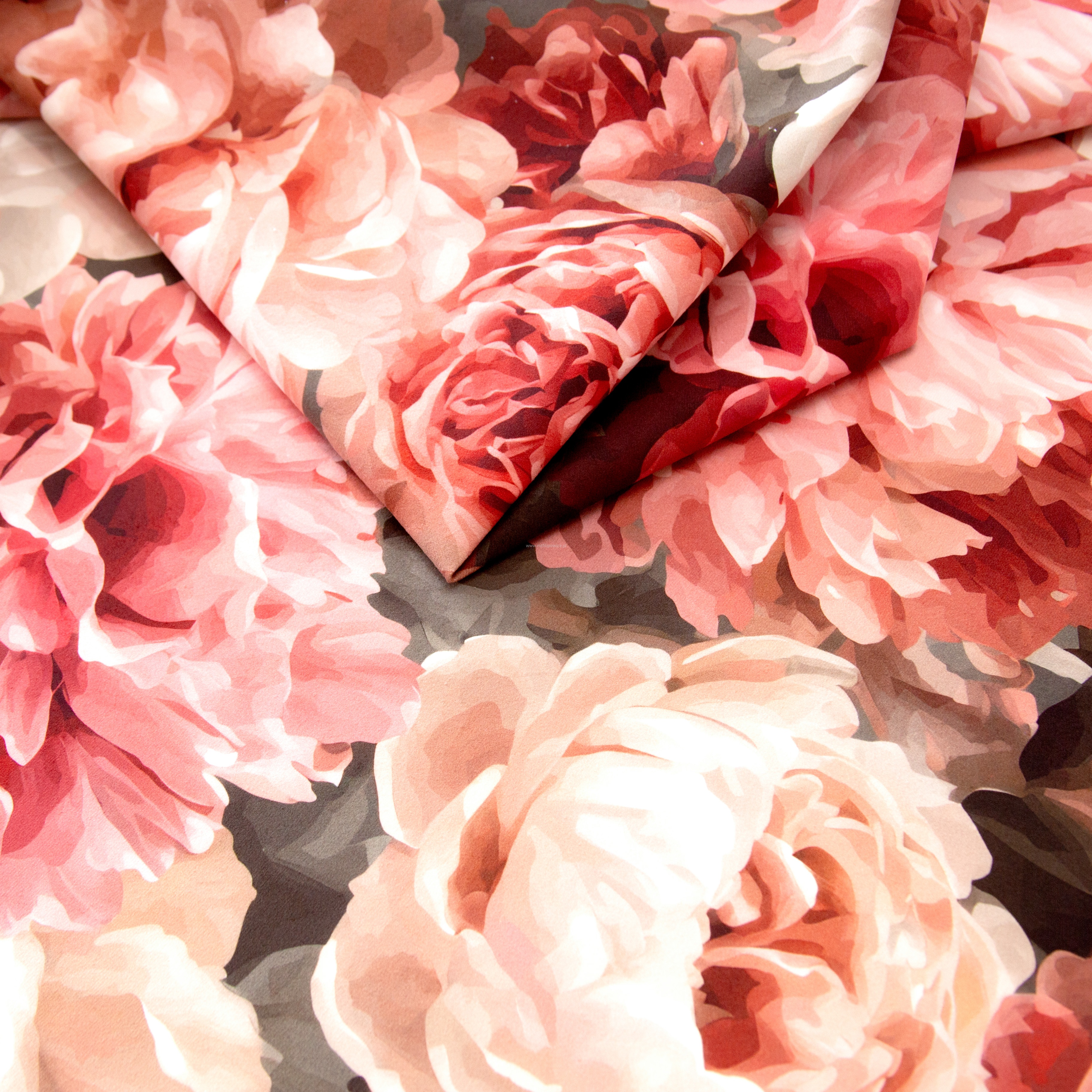 Rose Peony Blush to luksusowa welurowa tkanina tapicerska, która zachwyca bogatym, malarskim motywem róż i piwonii w odcieniach pudrowego różu, kremu i delikatnej moreli, osadzonych na głębokim, przygaszonym tle. Wzór emanuje romantyzmem, elegancją i subtelnym przepychem, tworząc we wnętrzu atmosferę ciepła i wysmakowanego komfortu.
