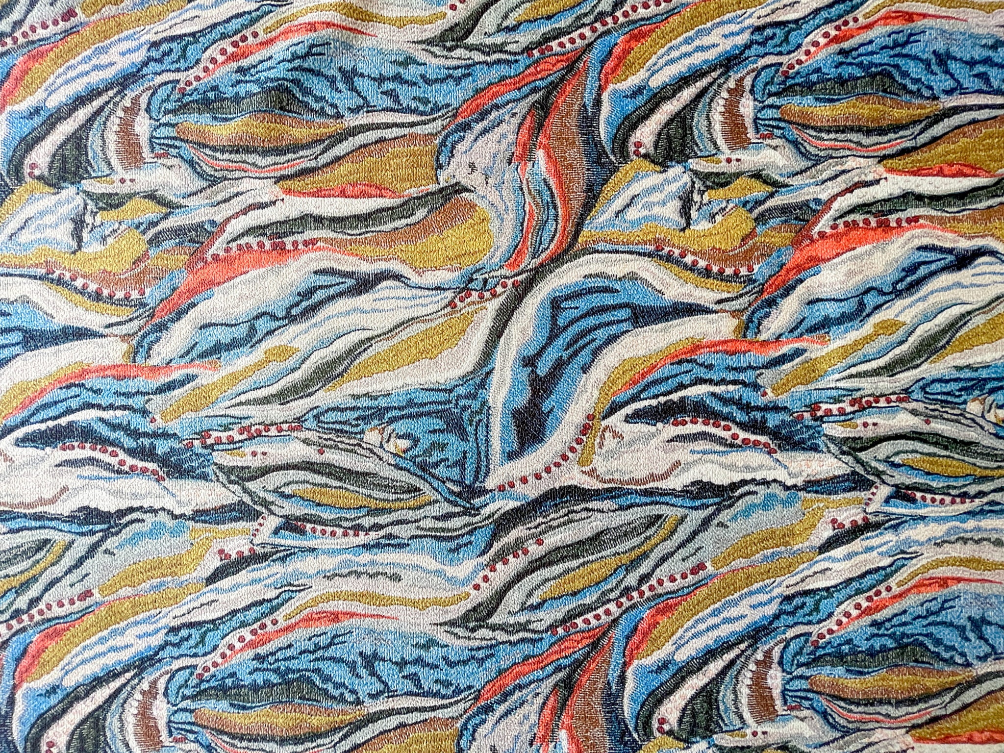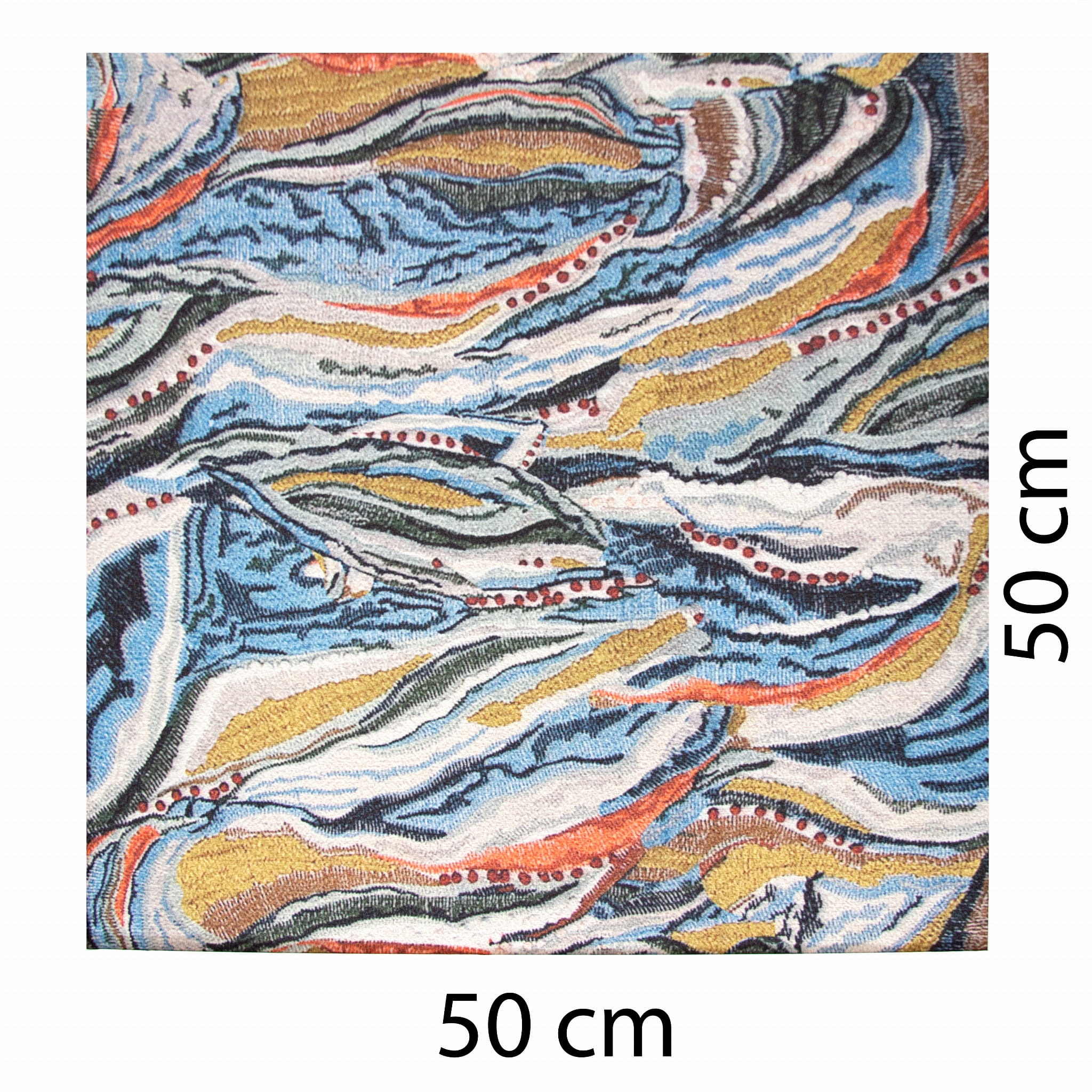 Print to nieregularne kształty w odcieniach niebieskiego, rudego i musztardy na cieniowanym jasno szarym tle.