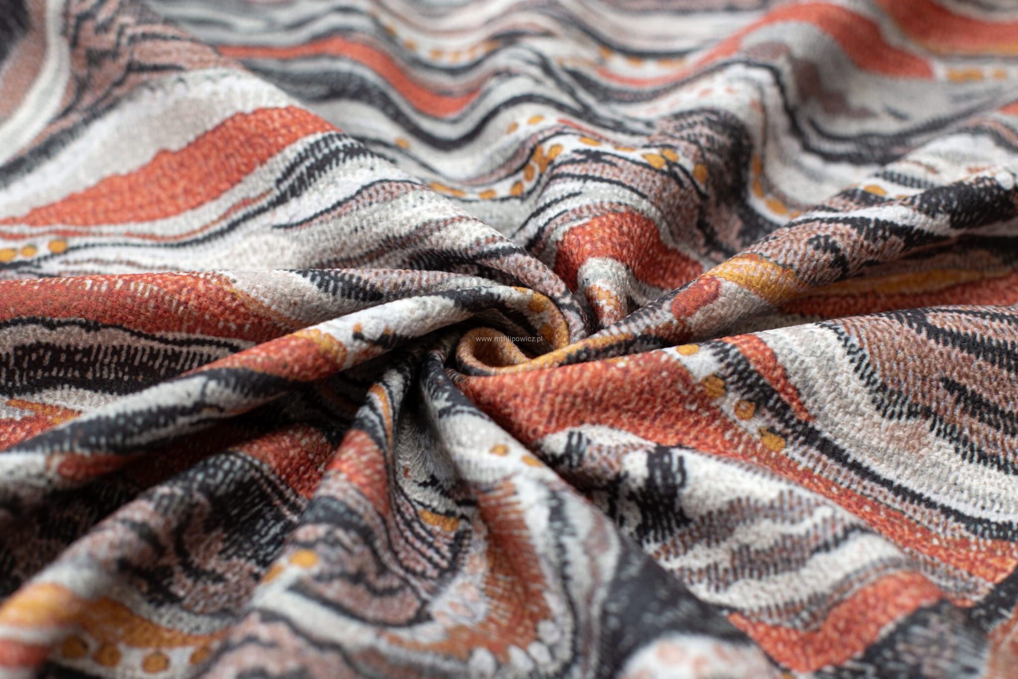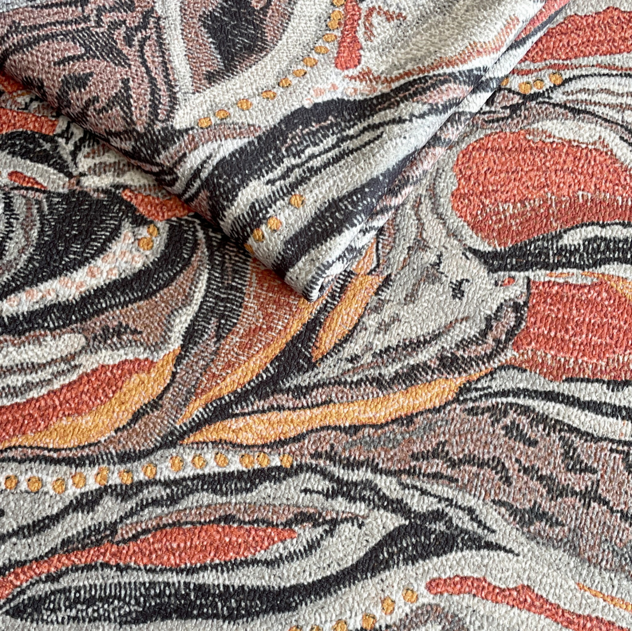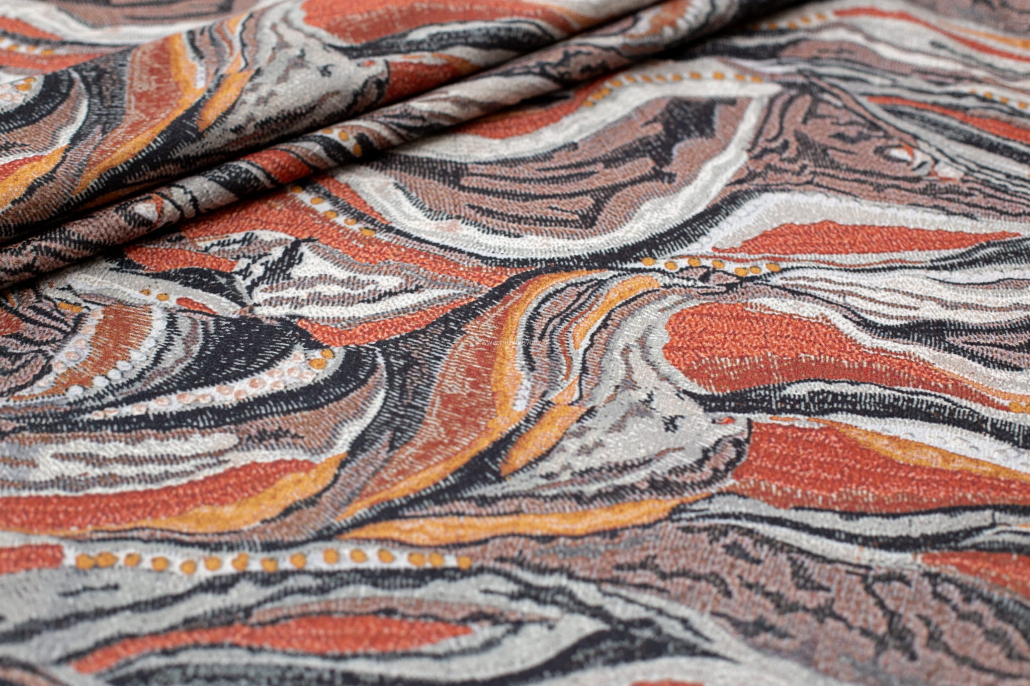 Print to nieregularne kształty w odcieniach niebieskiego, rudego i musztardy na cieniowanym jasno szarym tle.