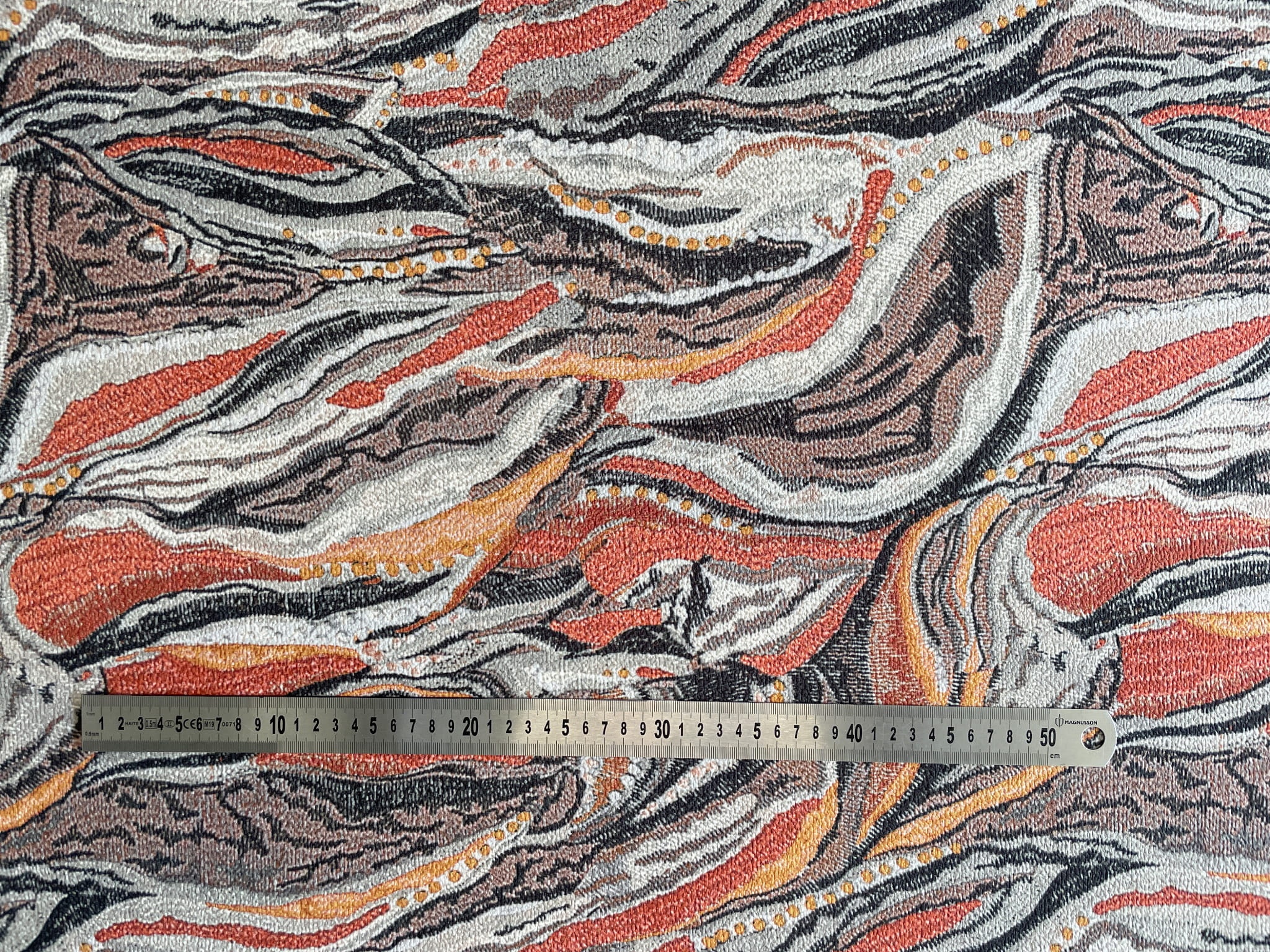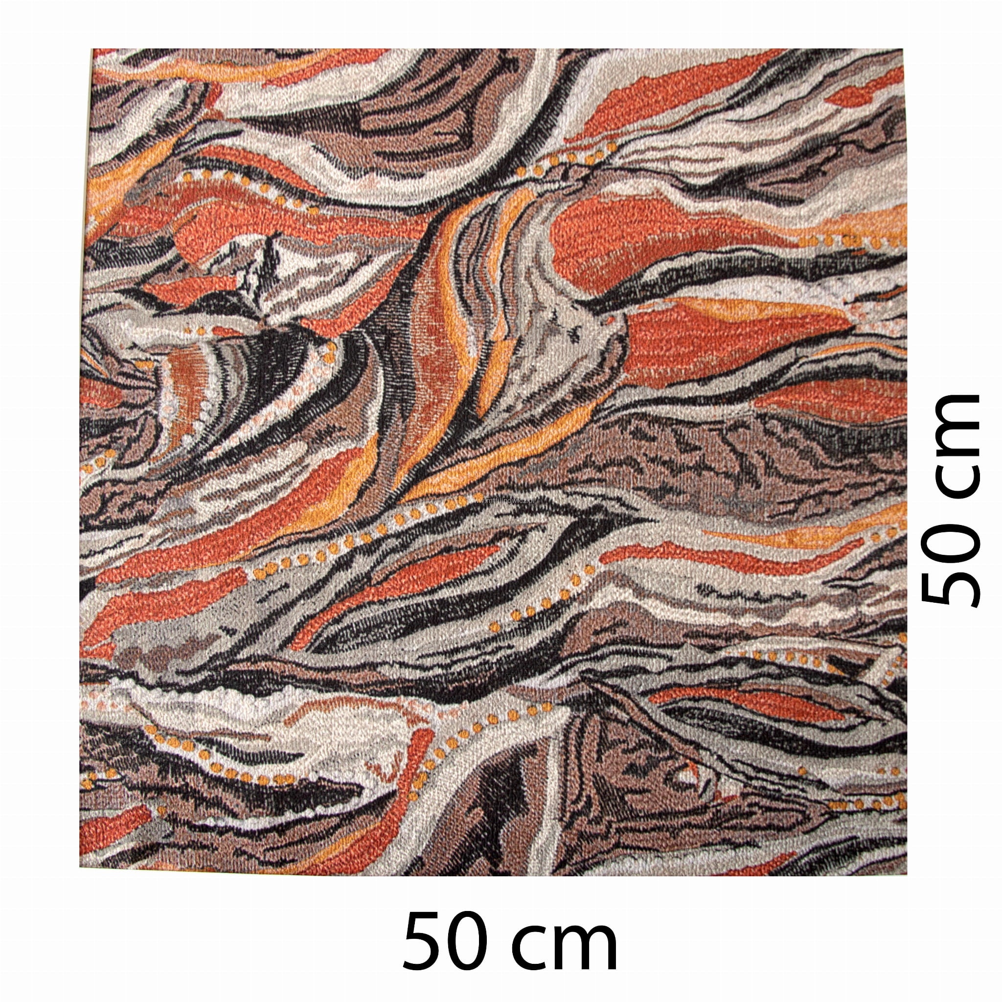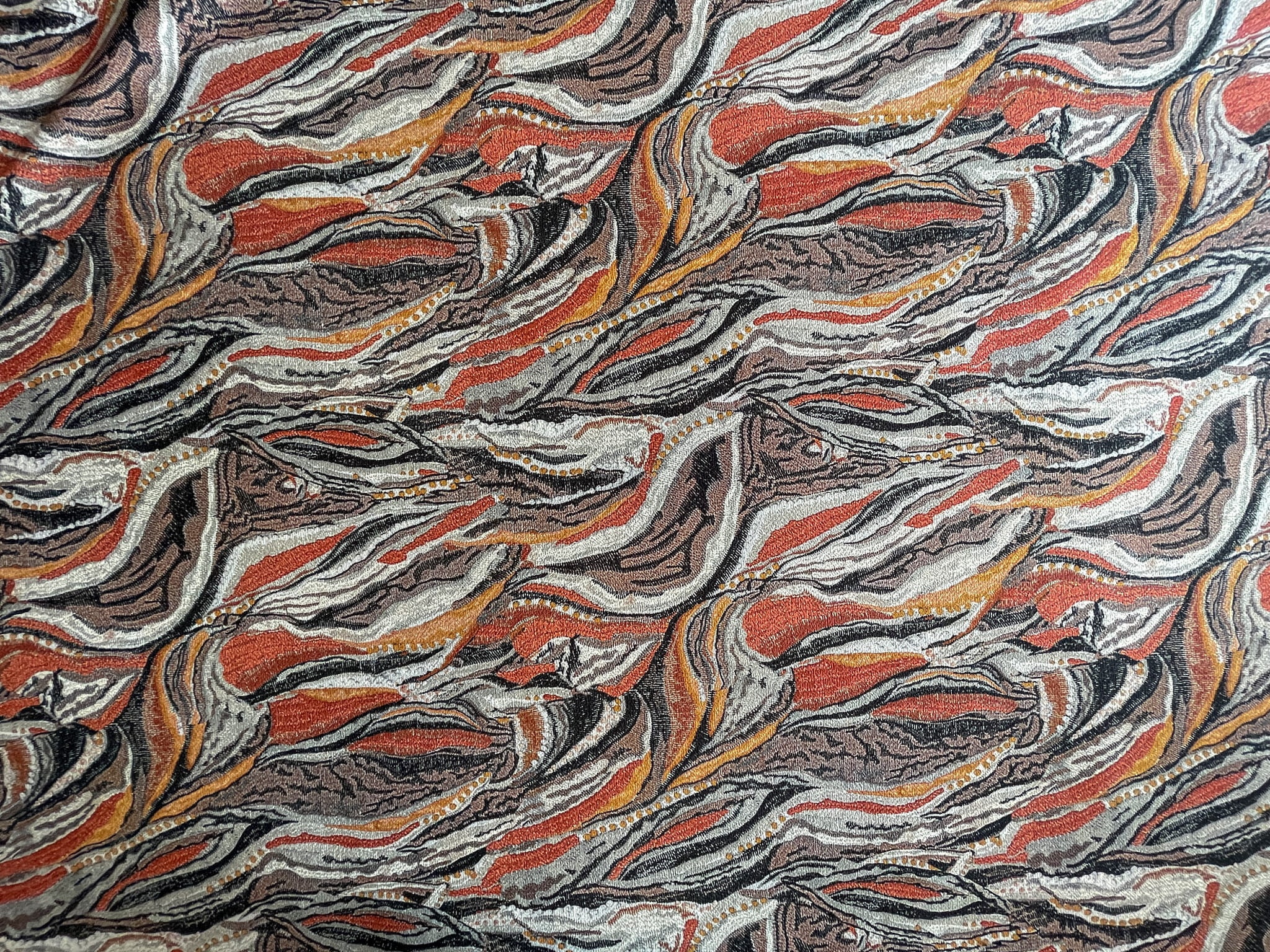 Print to nieregularne kształty w odcieniach niebieskiego, rudego i musztardy na cieniowanym jasno szarym tle.
