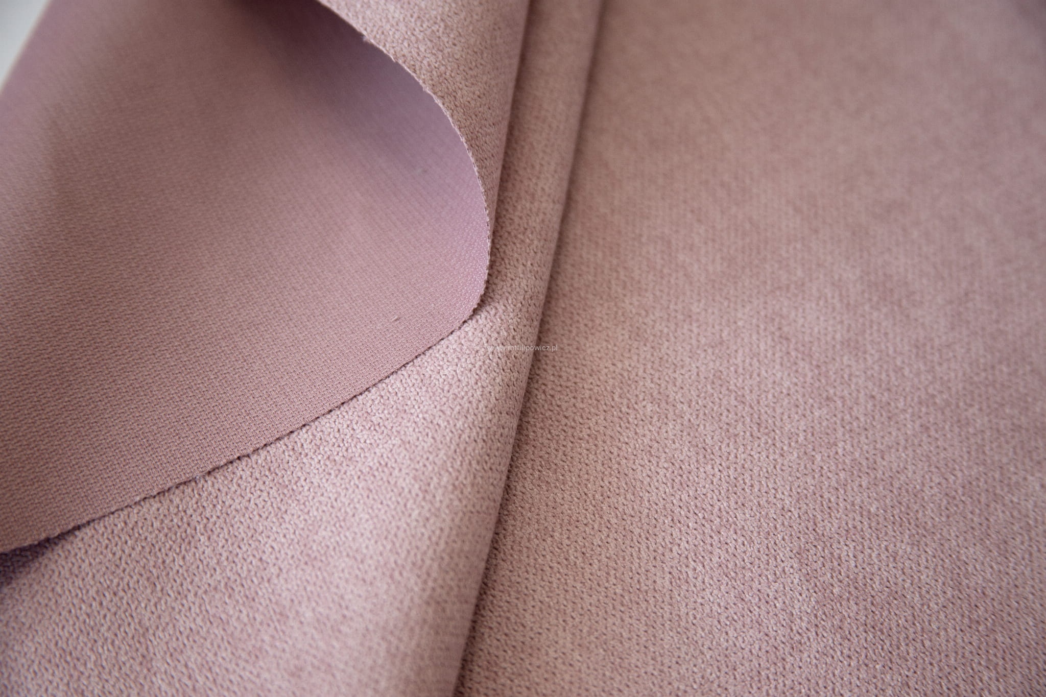 Lewa strona bez białego podkładu w siatkę, dzięki temu materiał może być stosowany na zasłony. Lewa jak i prawa mają prawie identyczny kolor.
