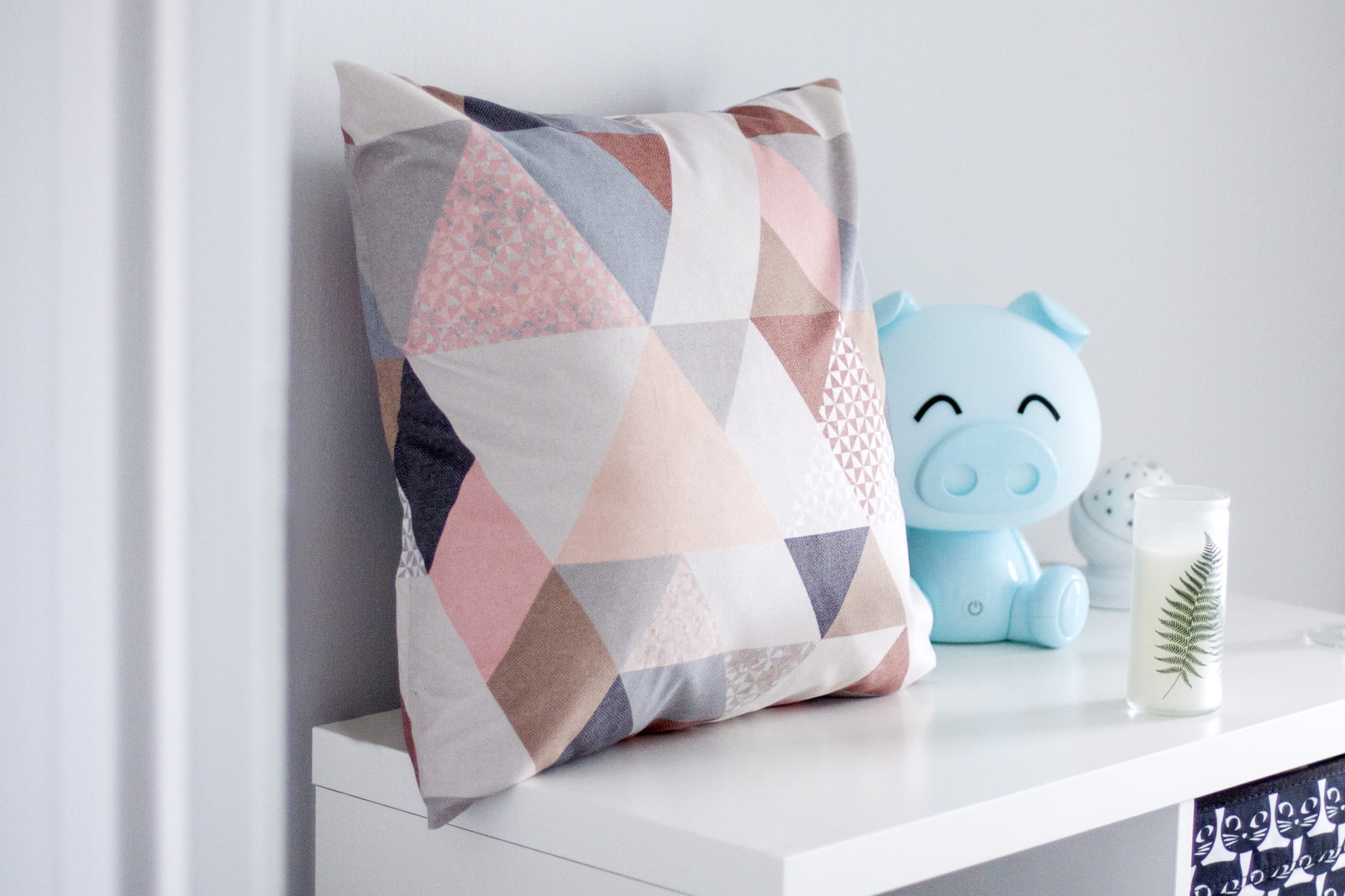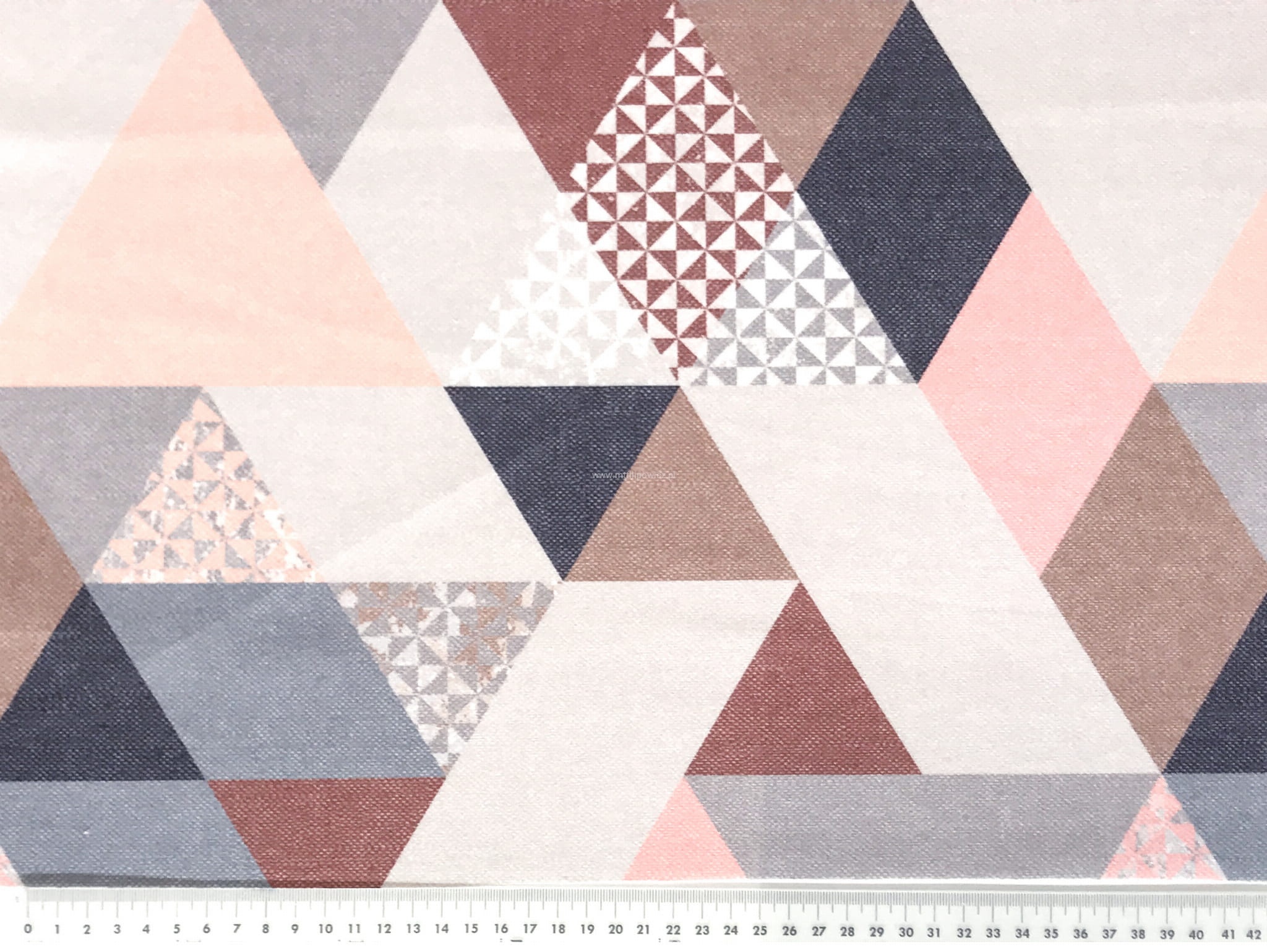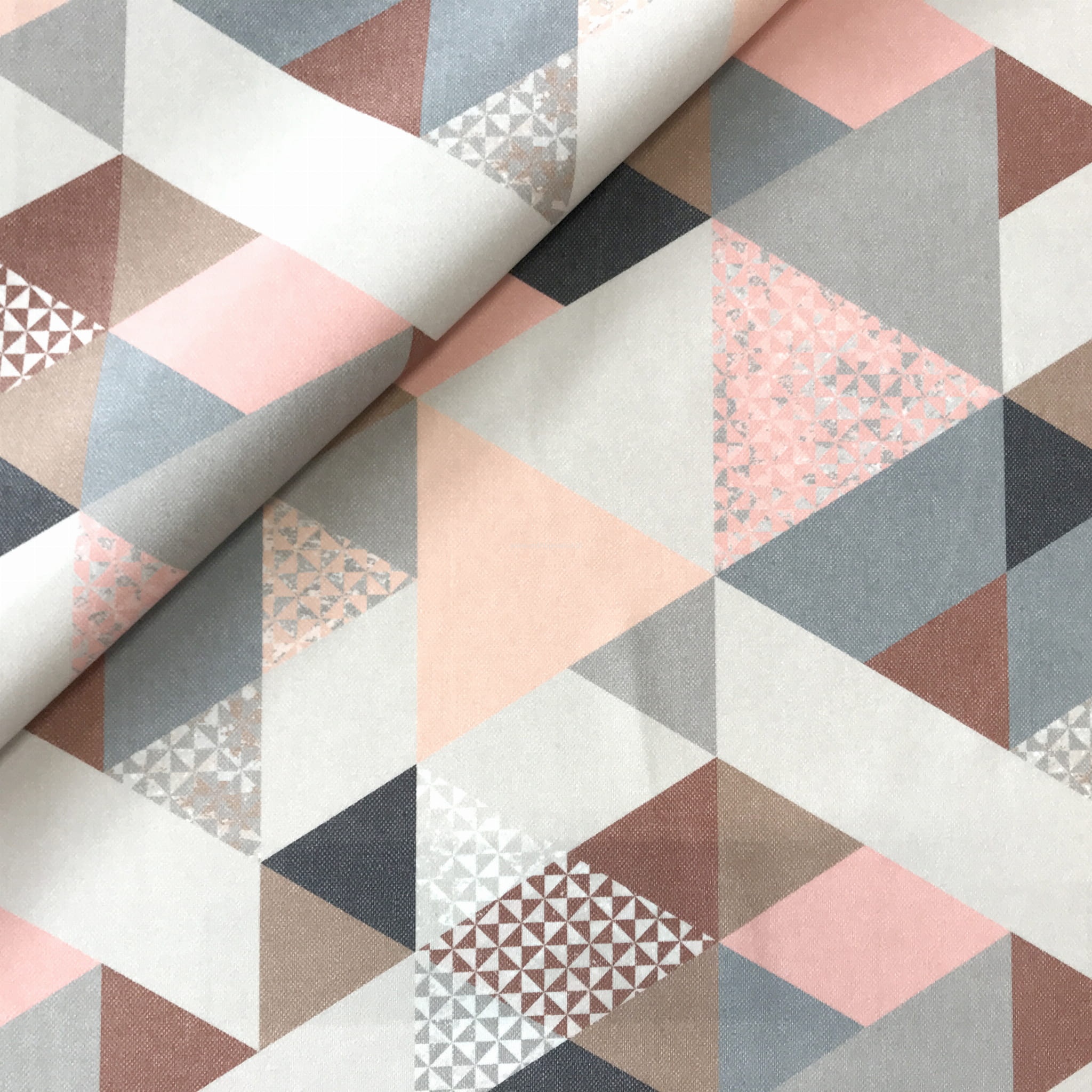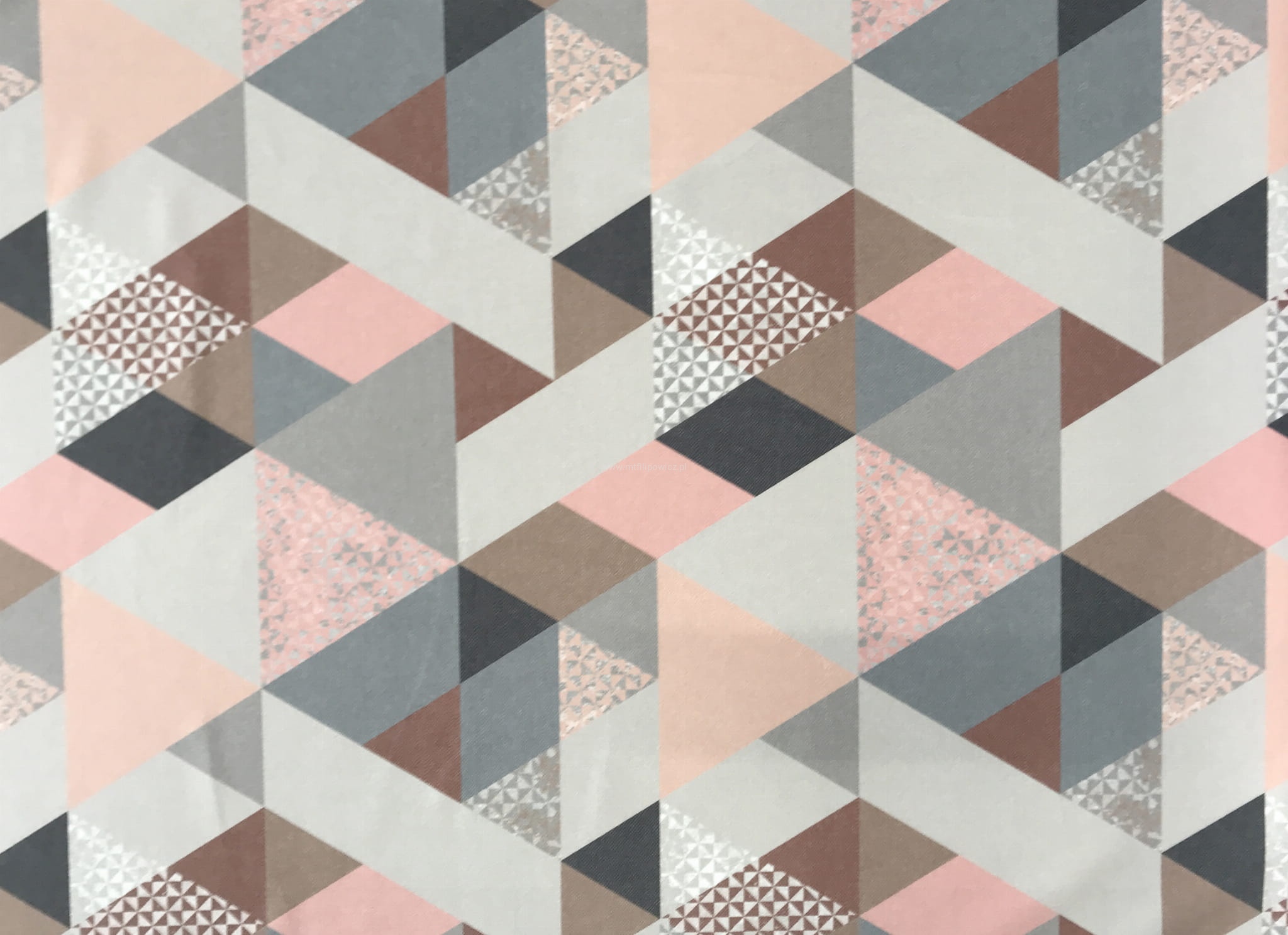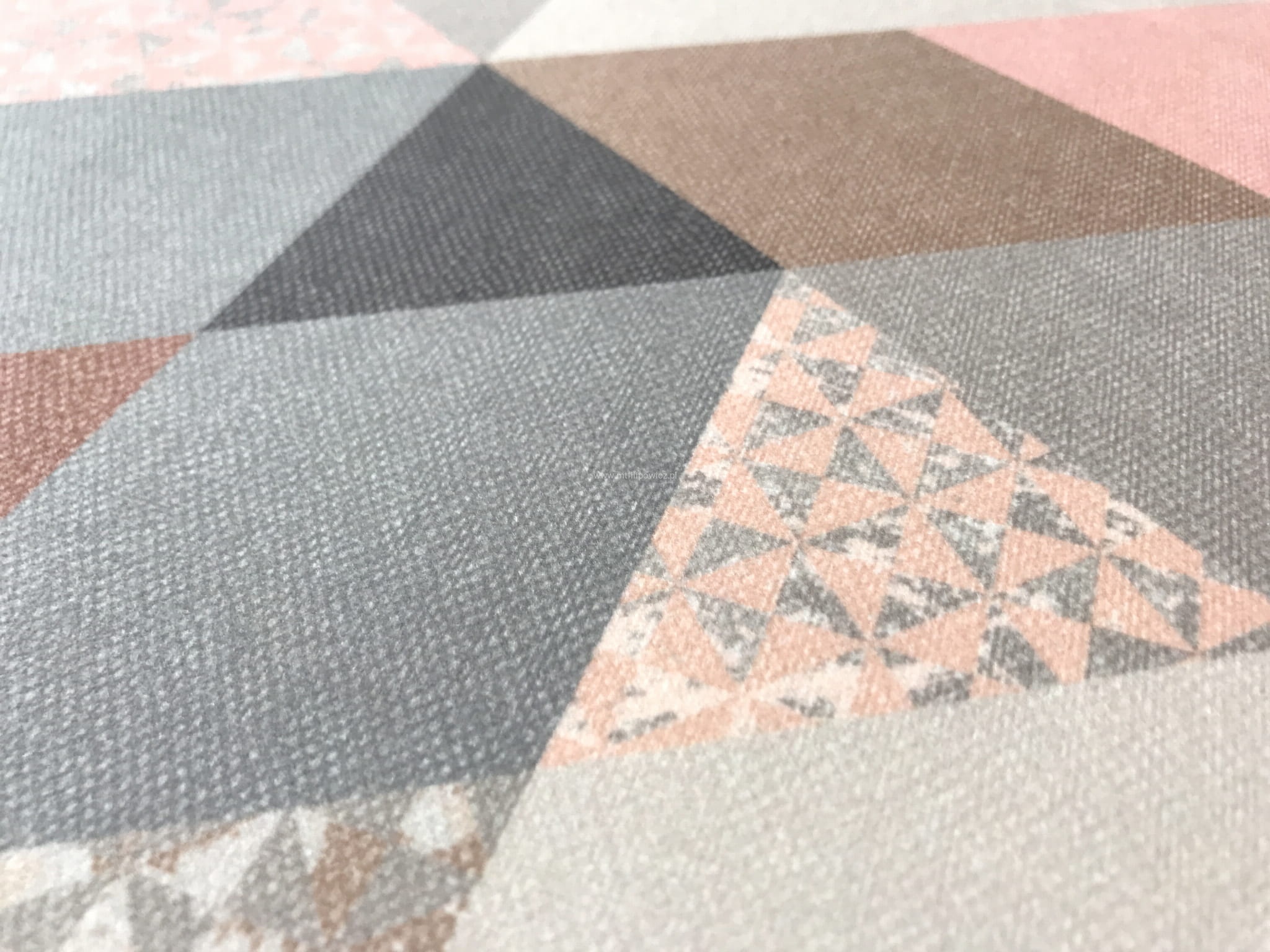 Trójkąty w odcieniach różu, koralu i kilku szarości tworzą bardzo dobre zestawienie pasujące do wielu aranżacji.
