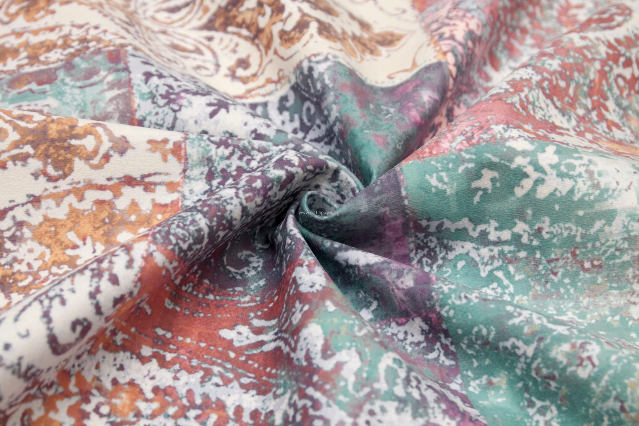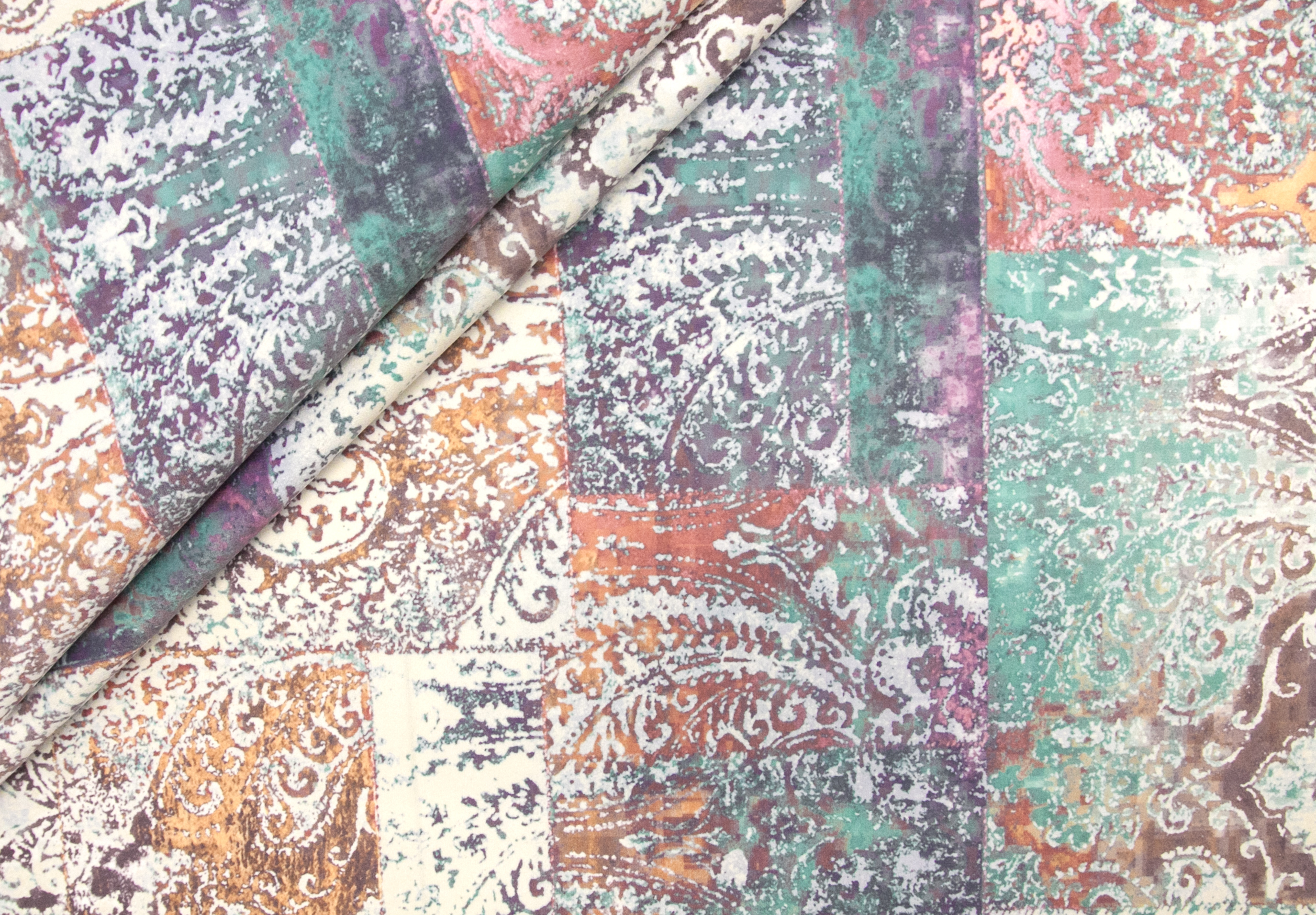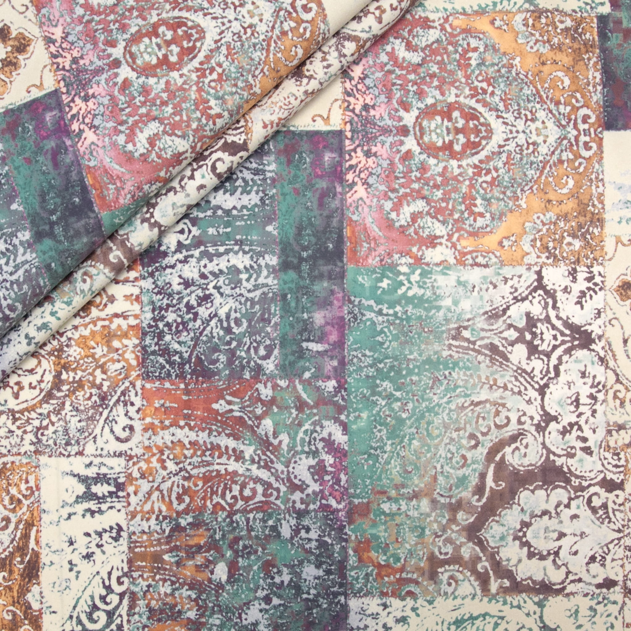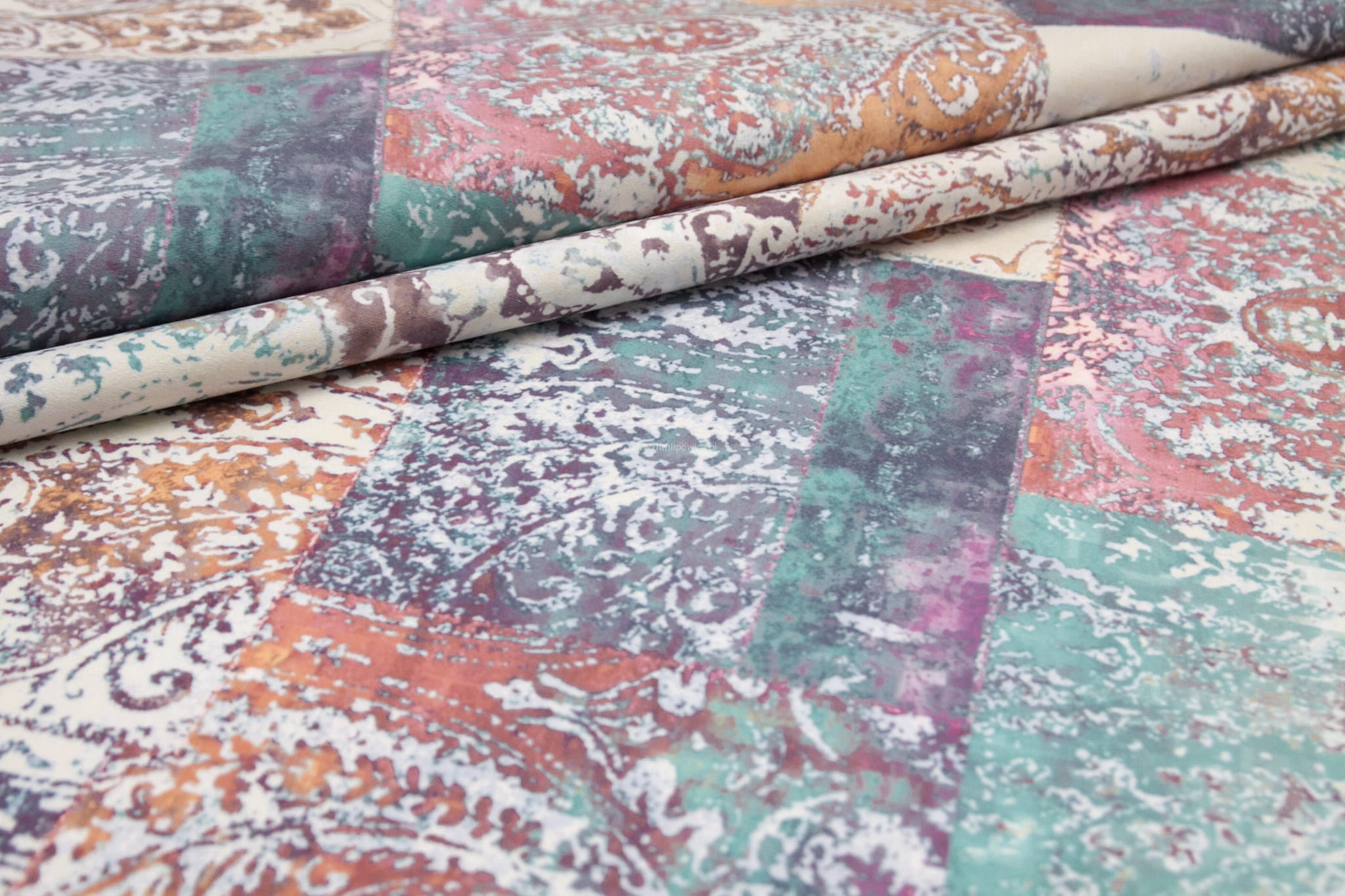 Tkanina Venezia to mocny i odporny na mechacenie welur z orientalnym, nadrukowanym wzorem w odcieniach różu, beżu, turkusu i fioletu.