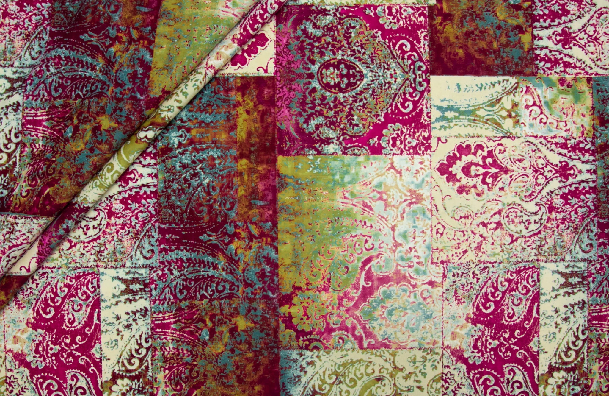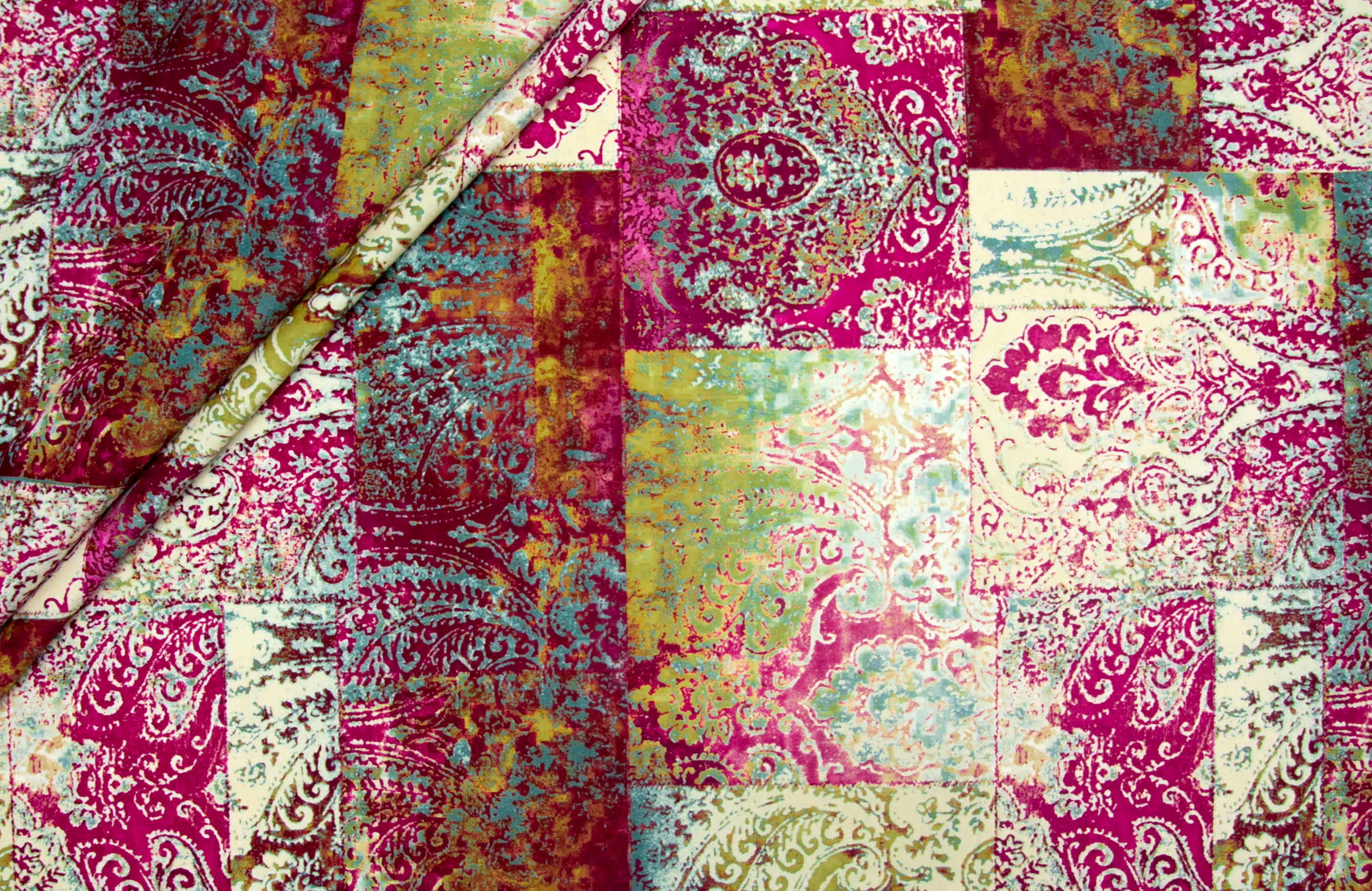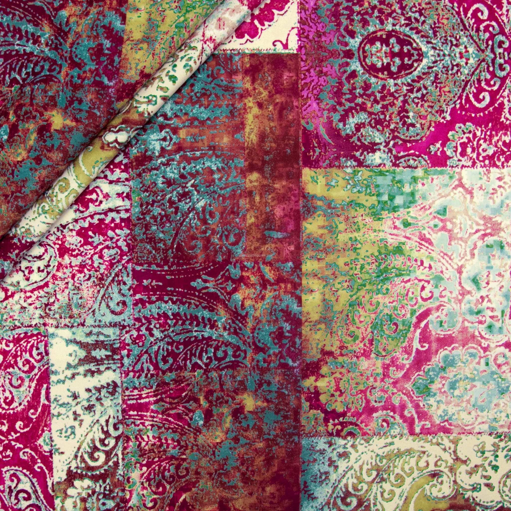 Tkanina Venezia to mocny i odporny na mechacenie welur z orientalnym, nadrukowanym wzorem w odcieniach różu, fuksji,turkusu i zielen.