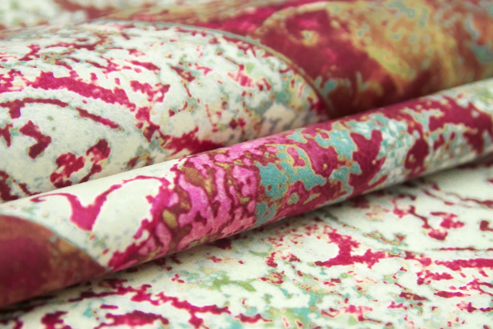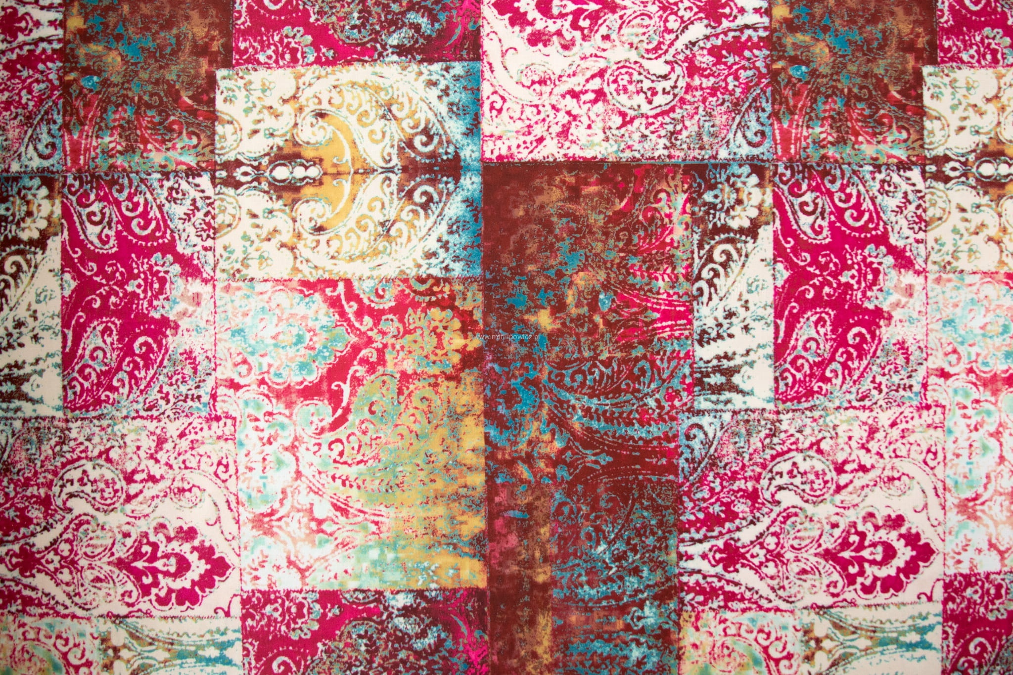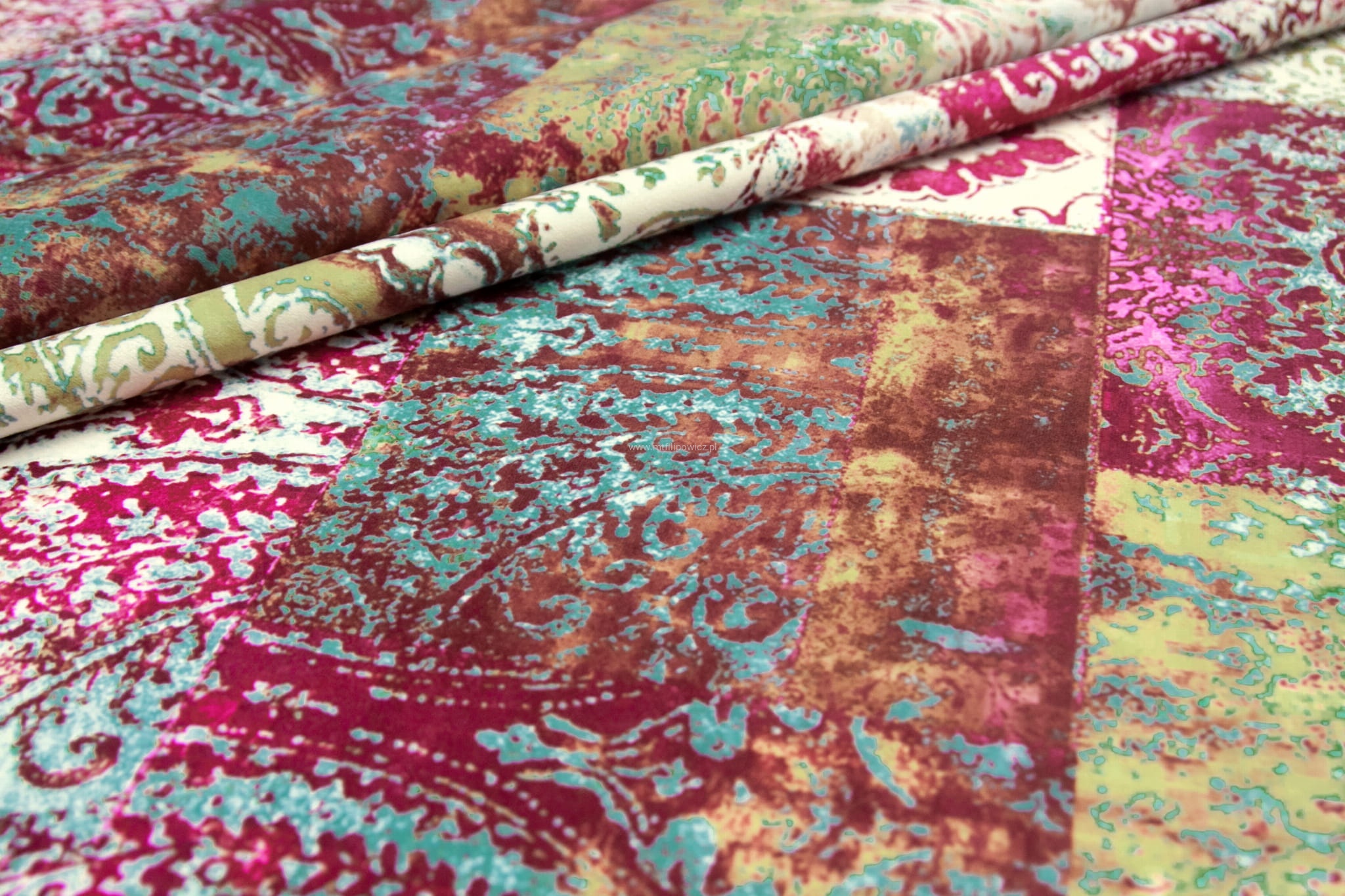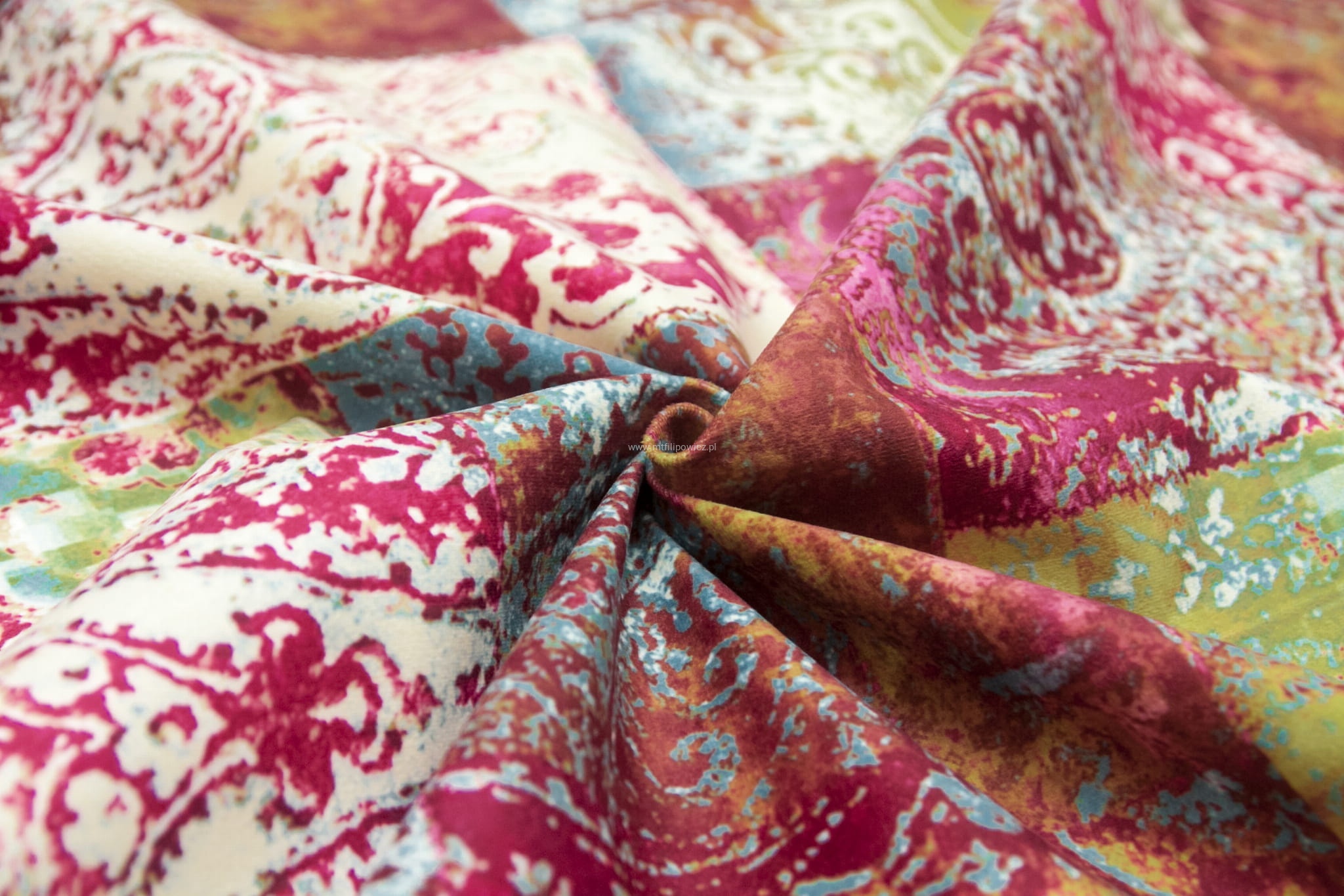 Tkanina Venezia to mocny i odporny na mechacenie welur z orientalnym, nadrukowanym wzorem w odcieniach różu, fuksji,turkusu i zielen.