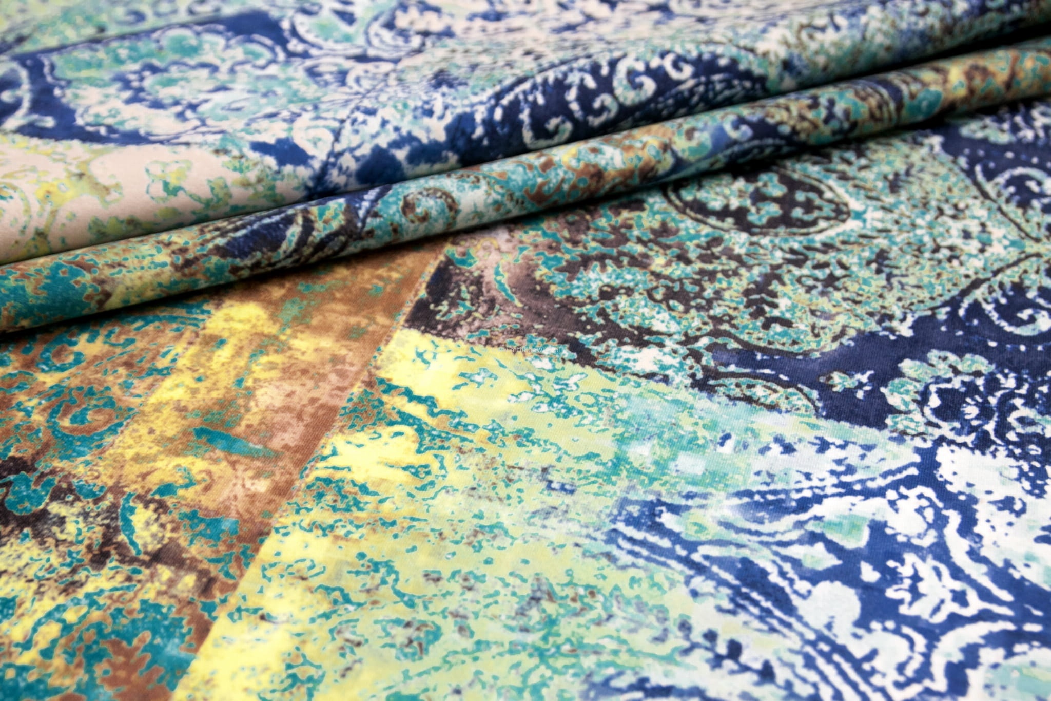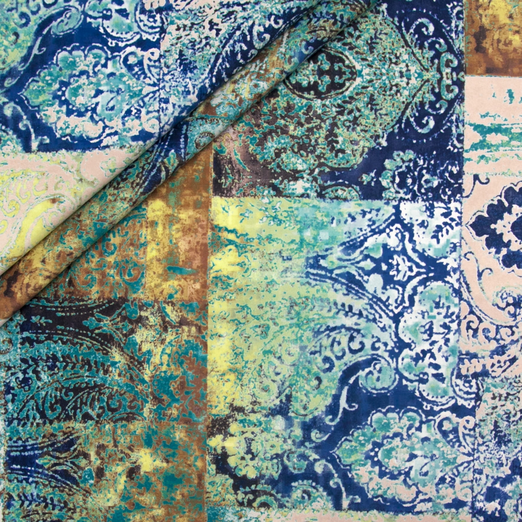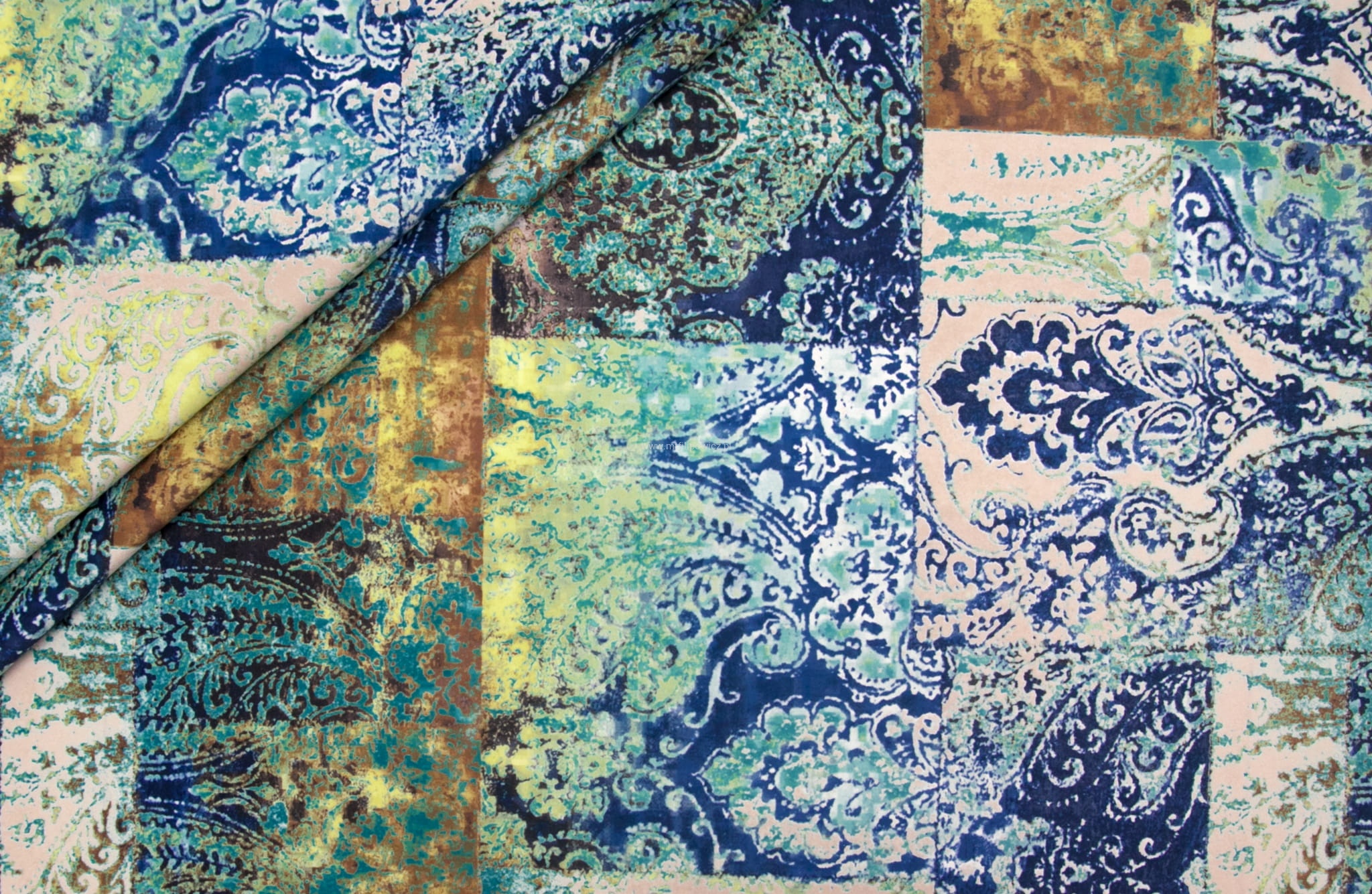 Tkanina Venezia to mocny i odporny na mechacenie welur z orientalnym, nadrukowanym wzorem w odcieniach turkusu, granatu, miedzi i beżu.