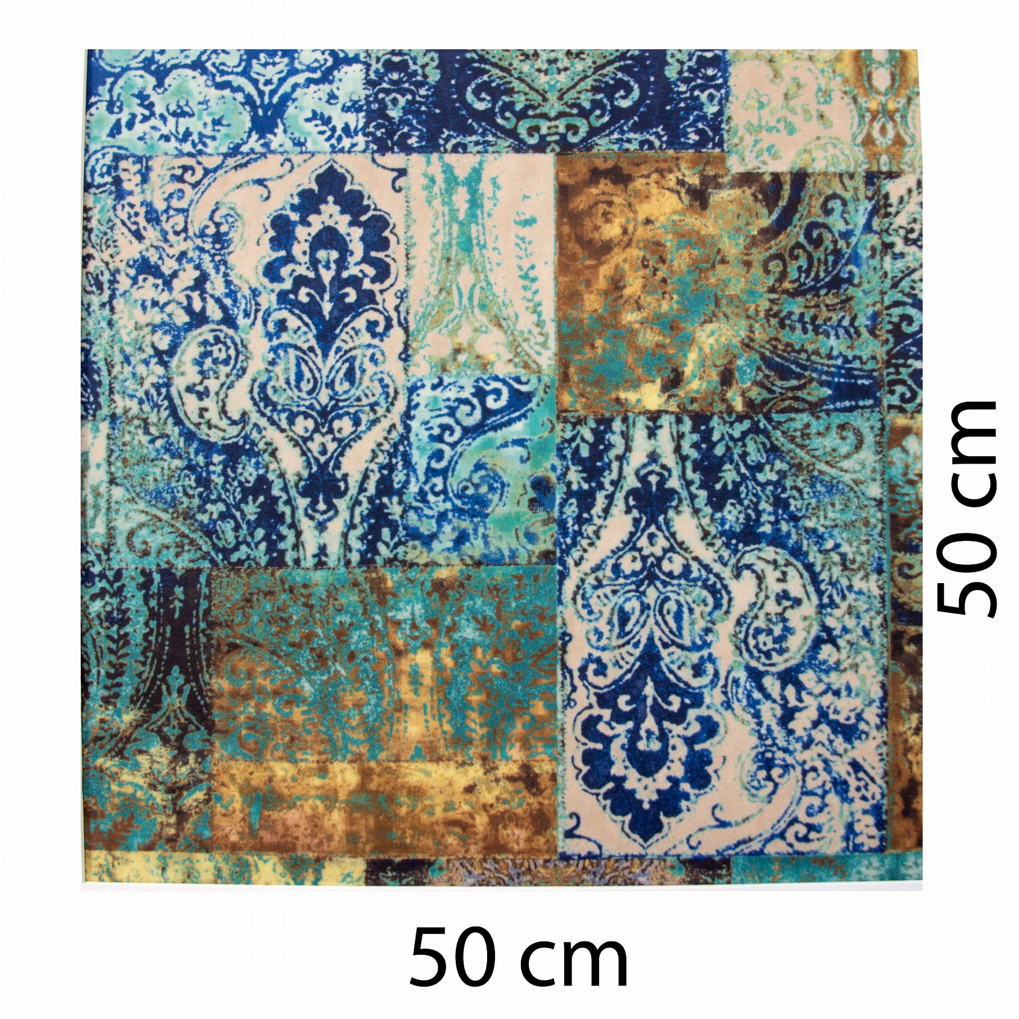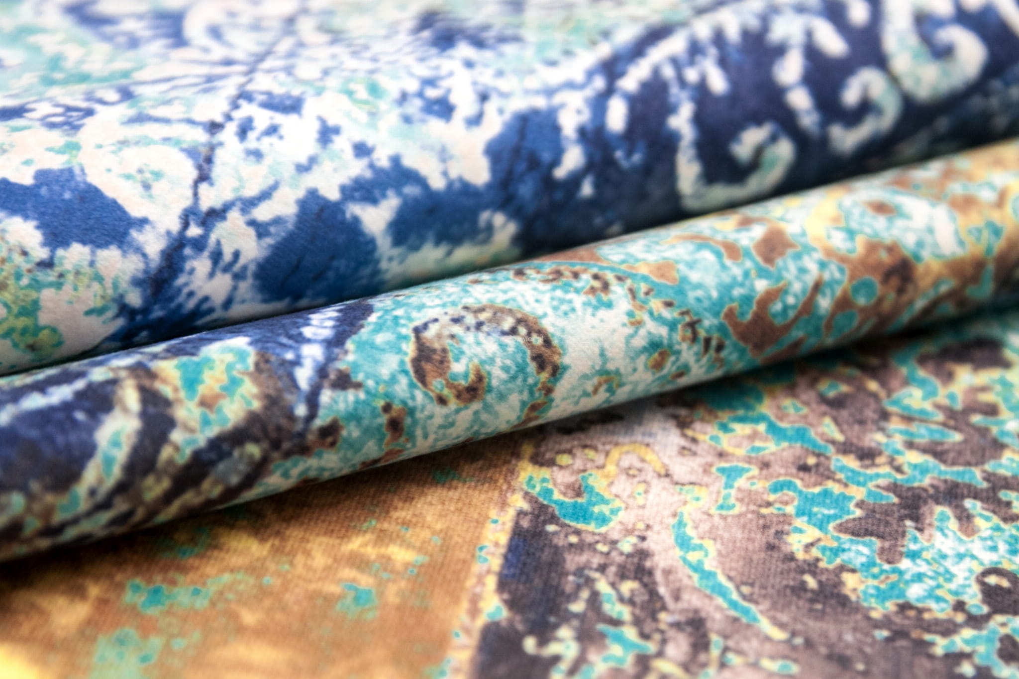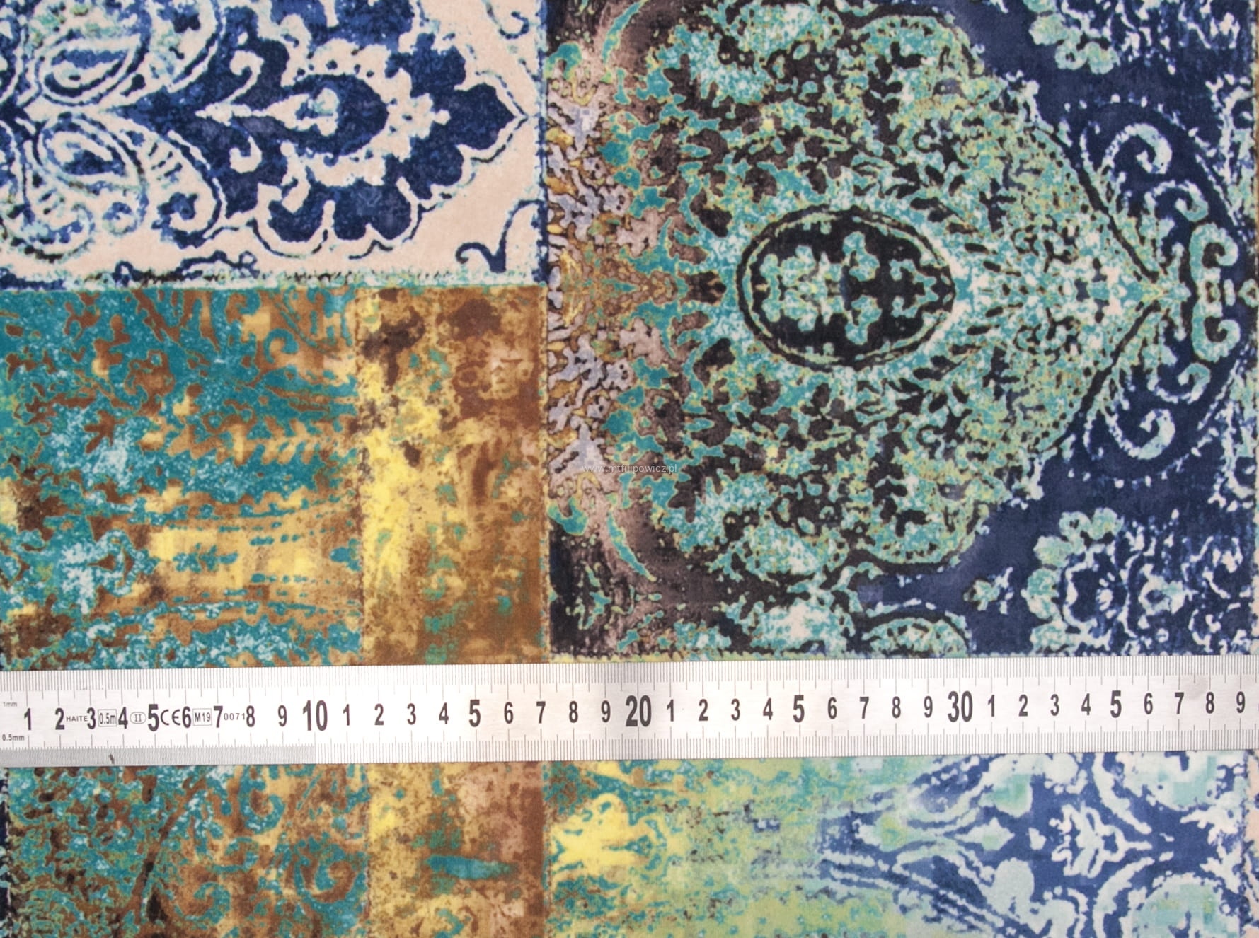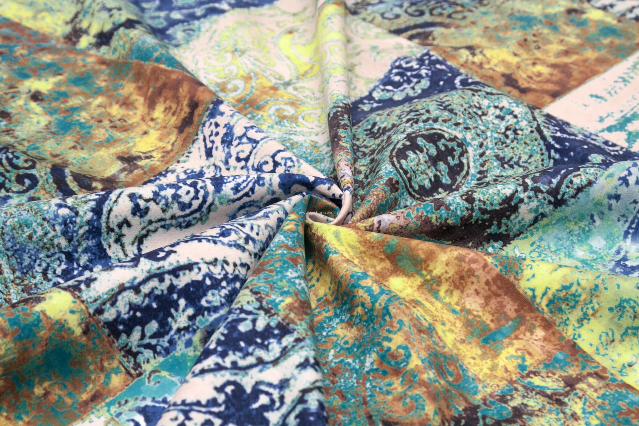 Tkanina Venezia to mocny i odporny na mechacenie welur z orientalnym, nadrukowanym wzorem w odcieniach turkusu, granatu, miedzi i beżu.