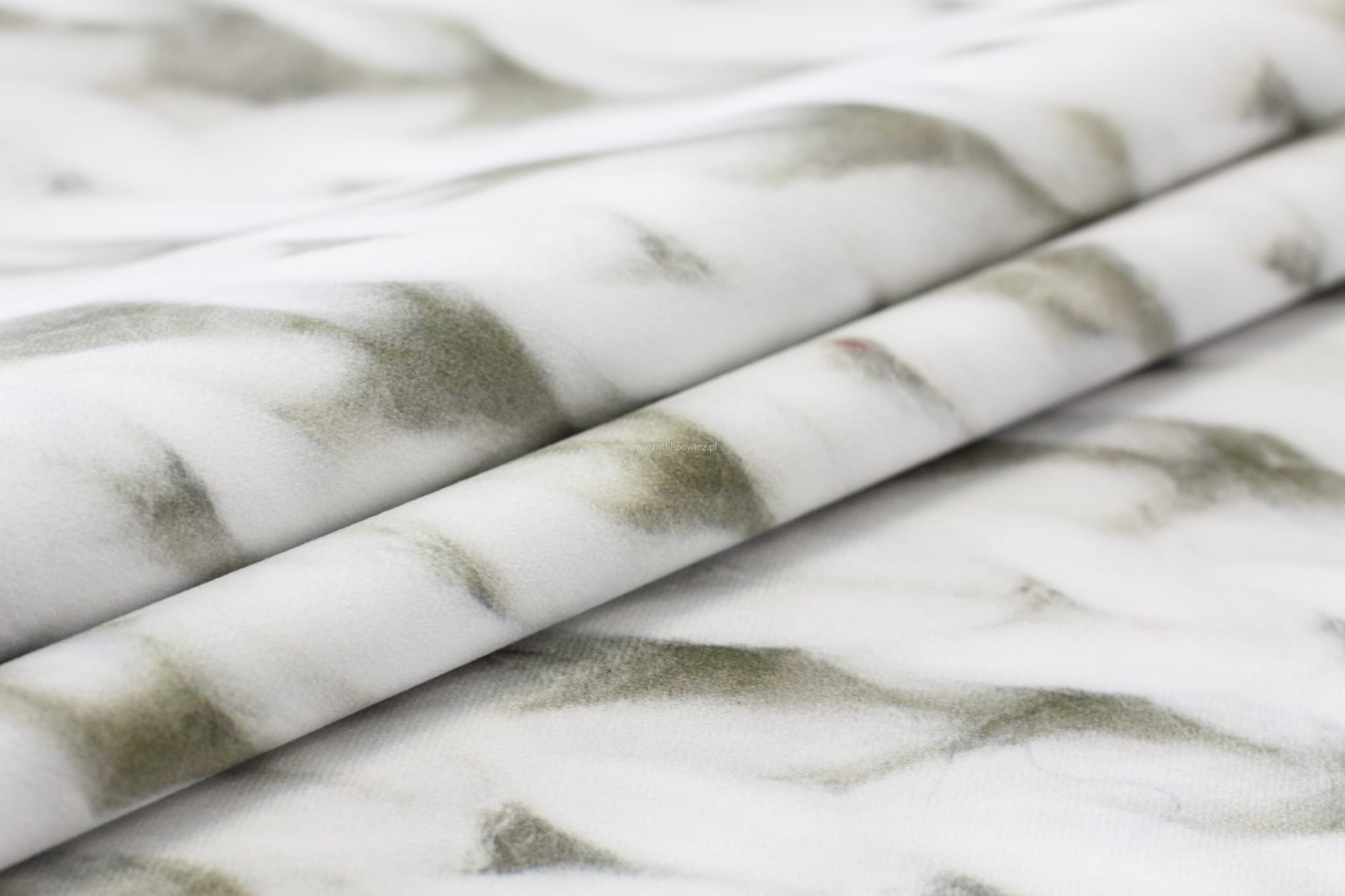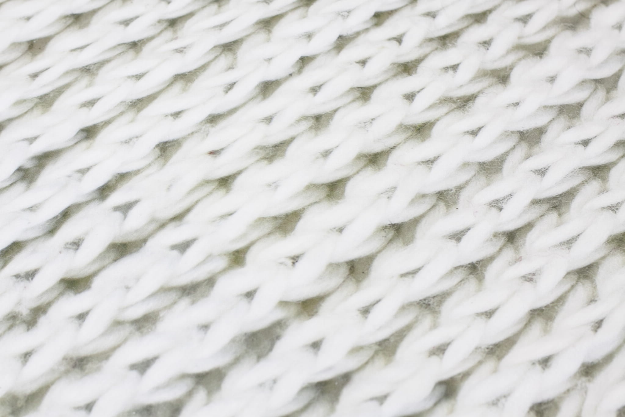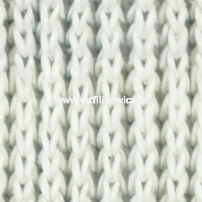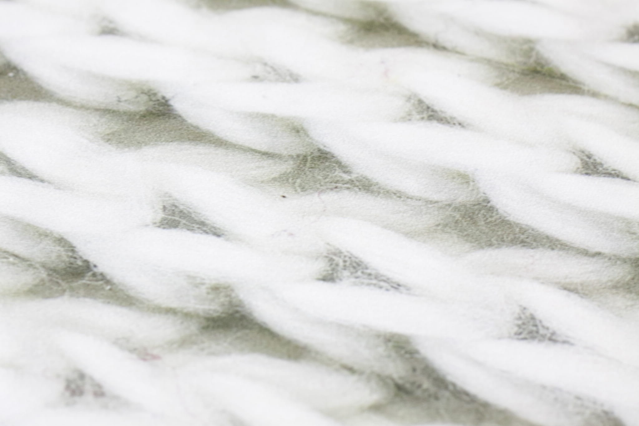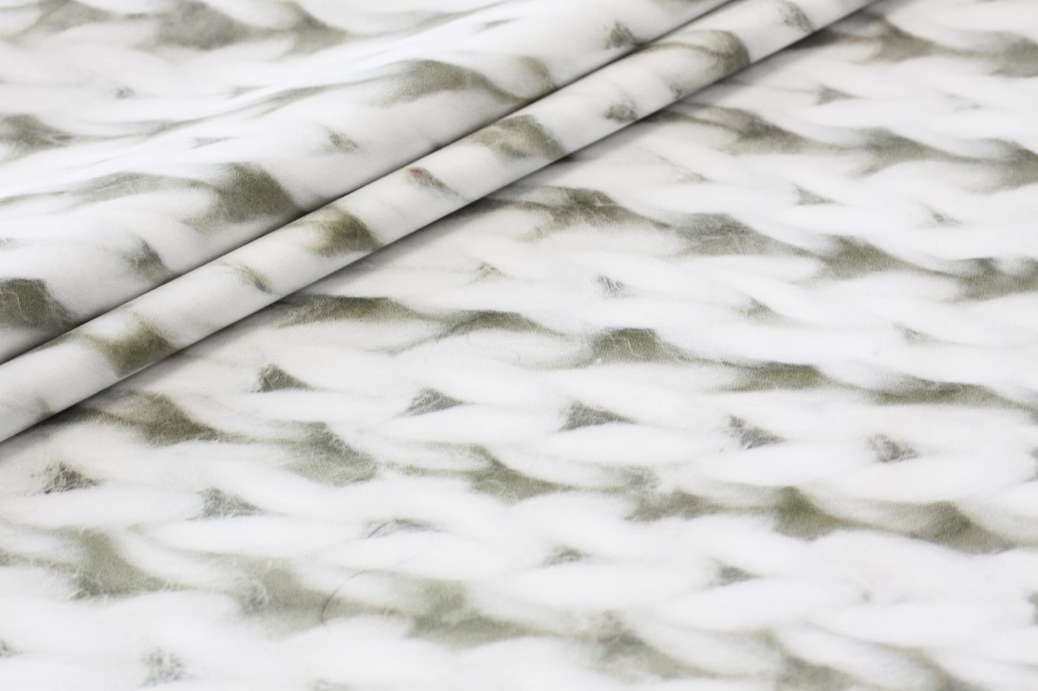Wełniany splot to duży wzór warkocza wełny nadrukowany na mocnym, gęstym welurze. Tkanina w odcieniach naturalnej bieli i beżu.