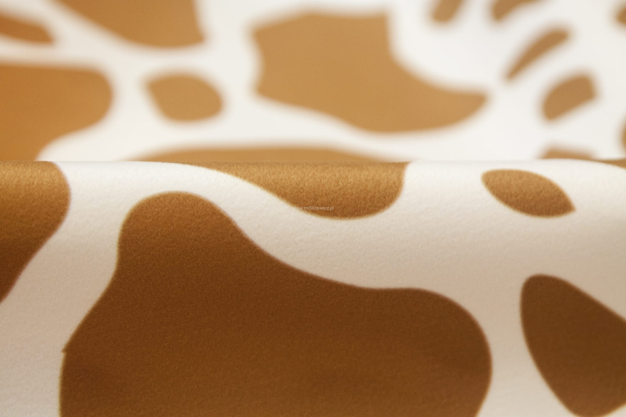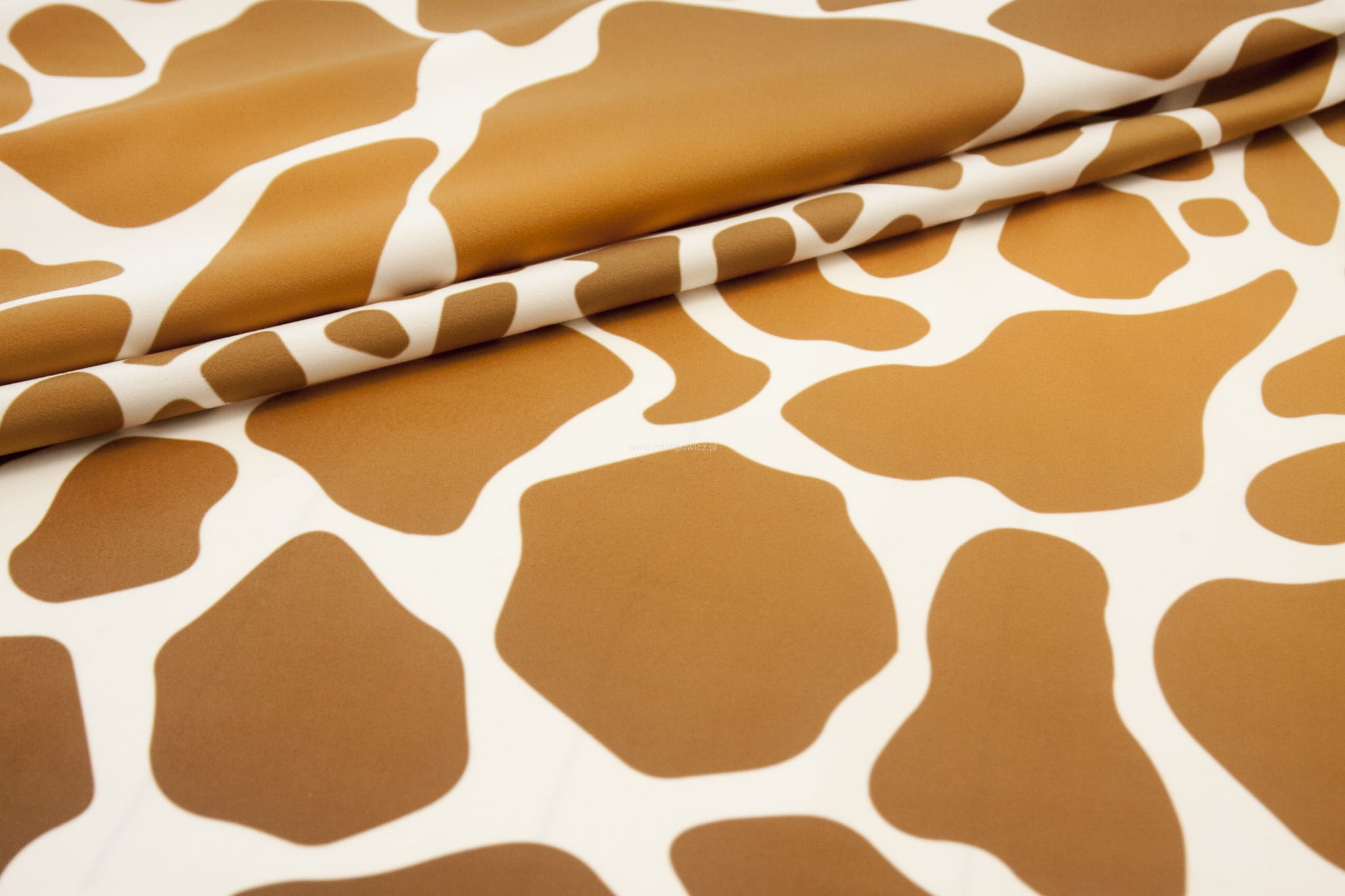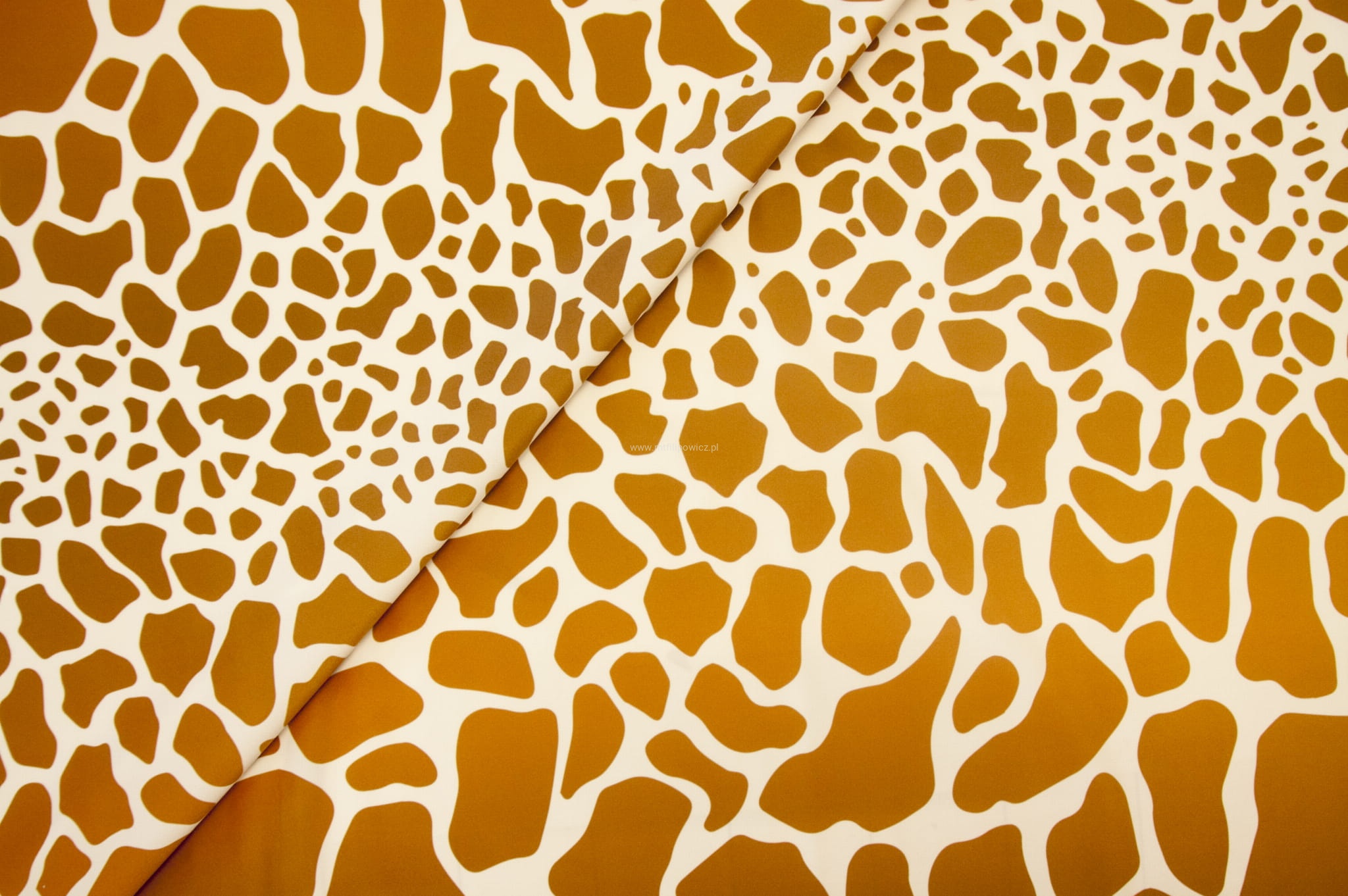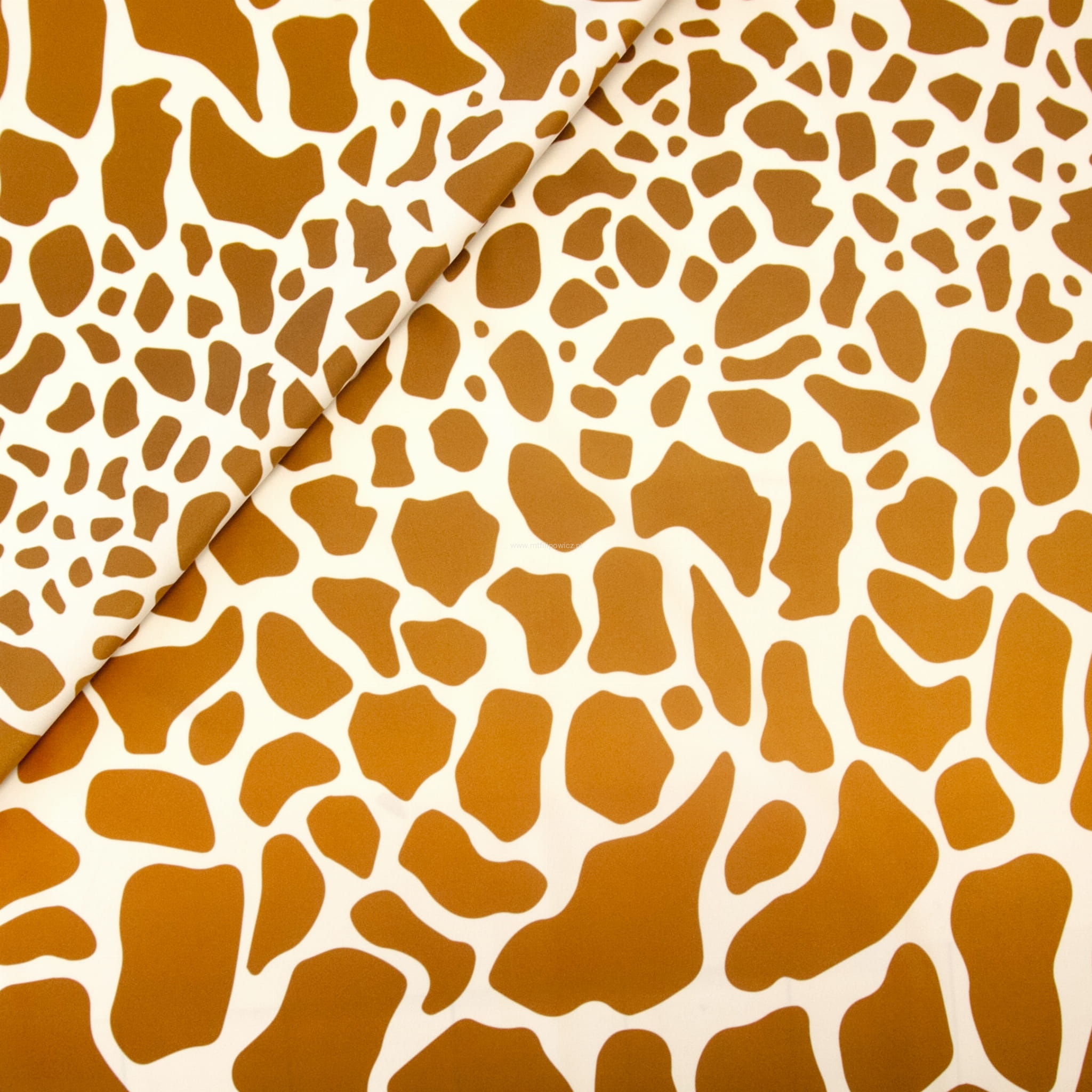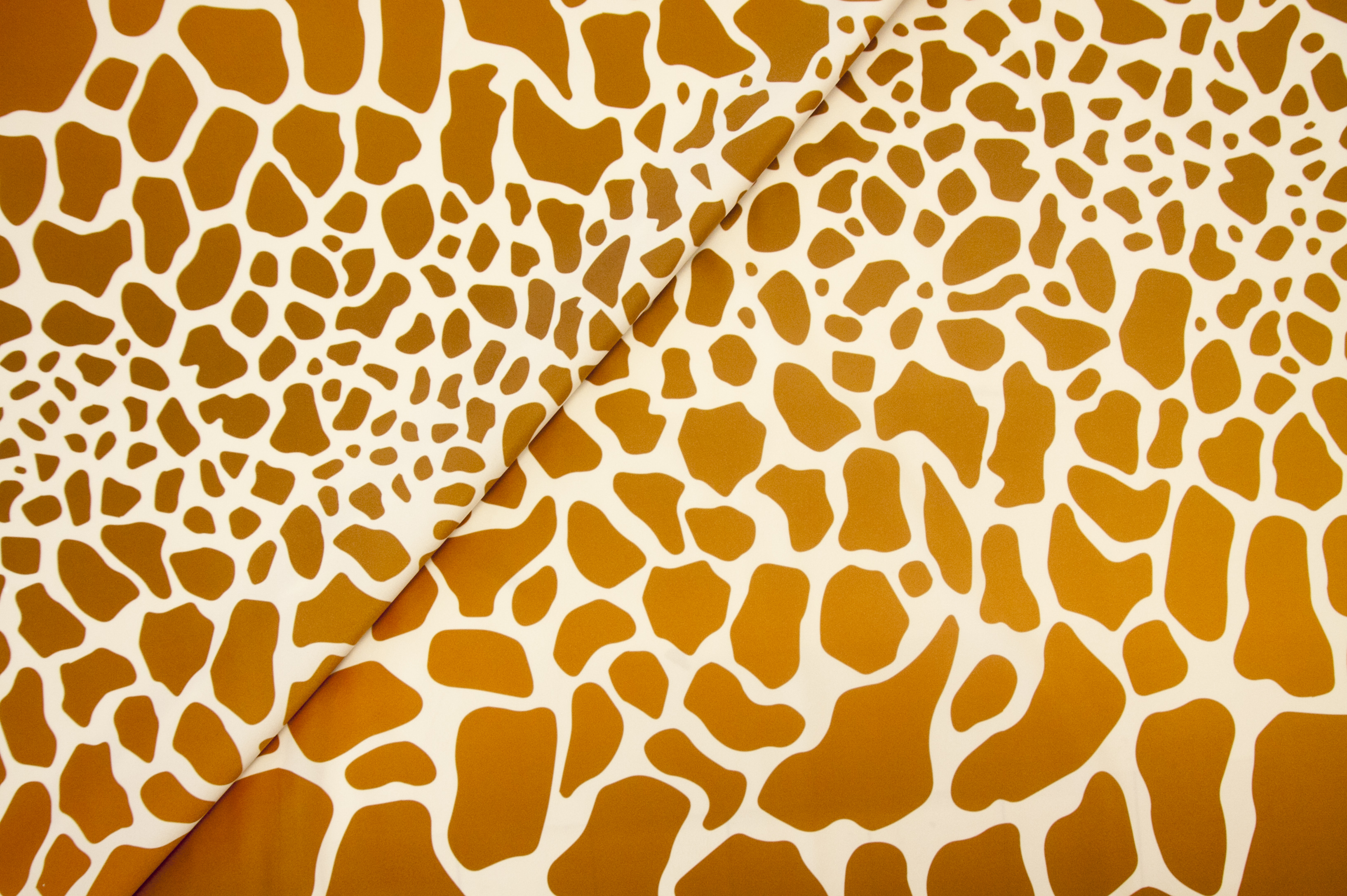 Tkanina tapicerska z oryginalnym wzorem żyrafich łat w kolorach jasnego brązu i pomarańczu na jasno kremowym tle.