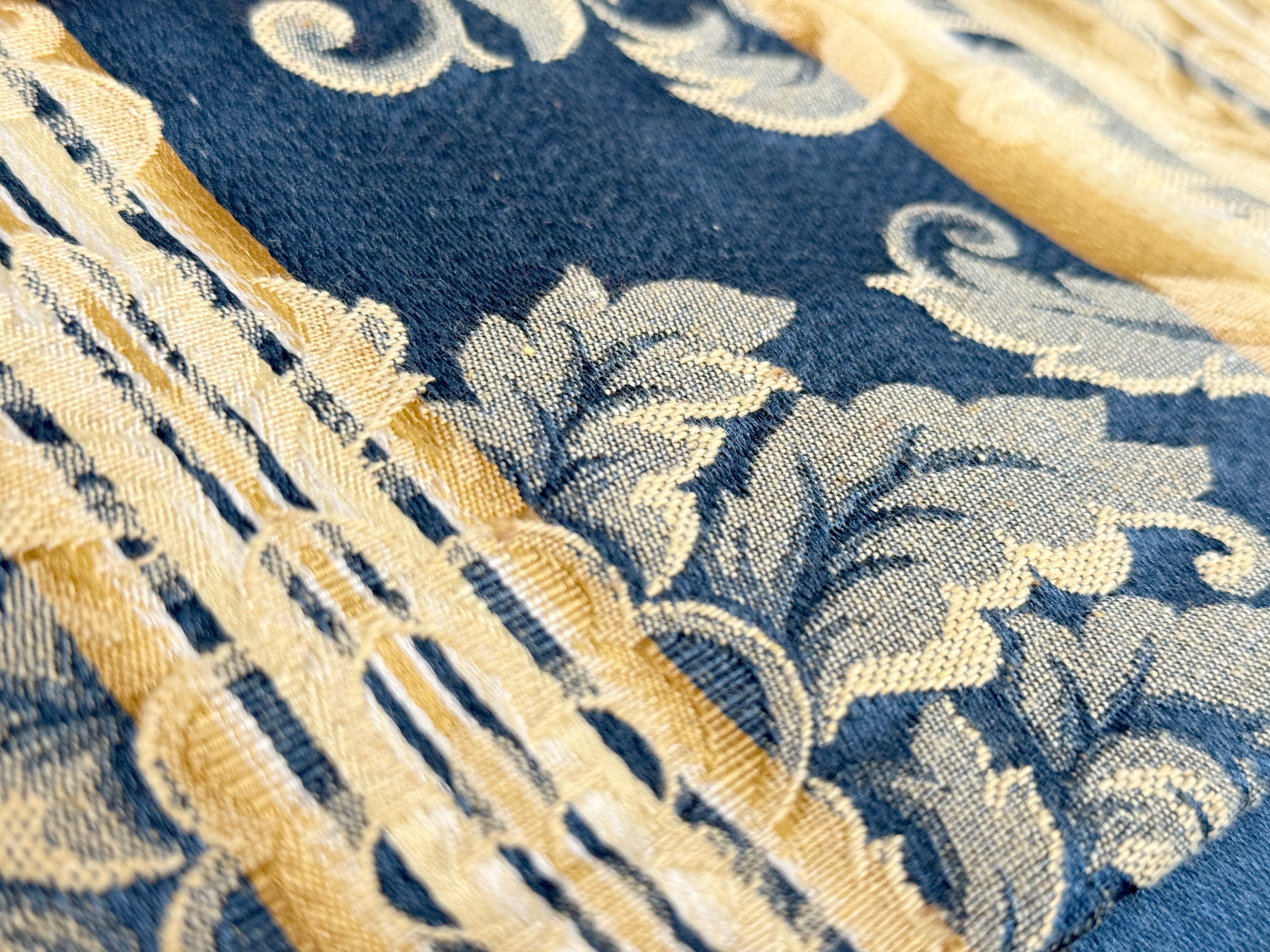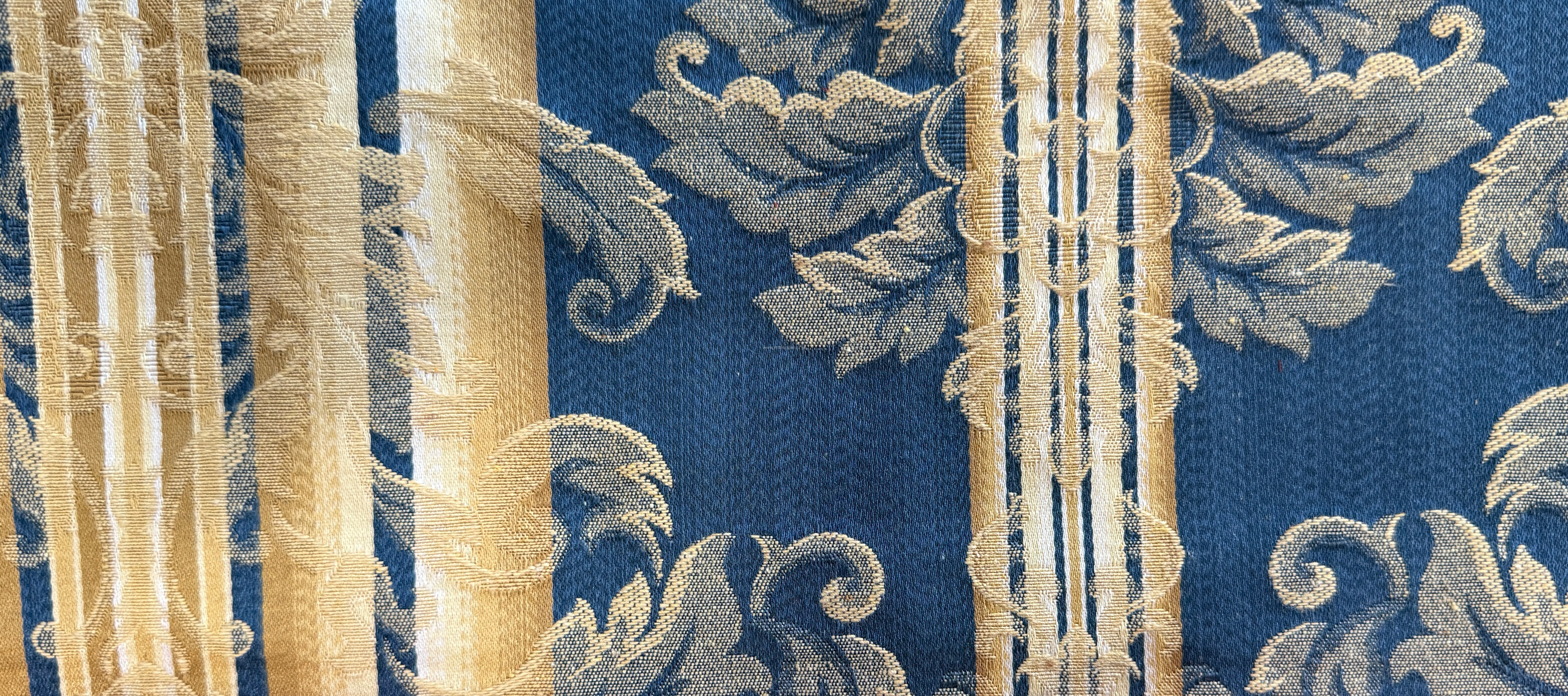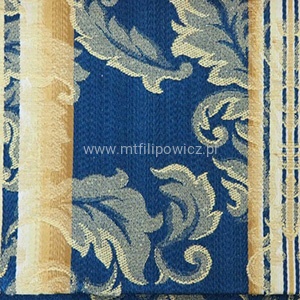 Włoski materiał Castello to elegancka tkanina tapicerska o wyrazistym, klasycznym charakterze. Zgaszony niebieski połączony ze złotymi, ornamentalnymi zdobieniami tworzy efekt luksusu inspirowanego stylami pałacowymi i secesyjnymi. Subtelne pasy dodają harmonii i podkreślają dekoracyjny rytm wzoru, sprawiając, że materiał pięknie układa się na meblach.