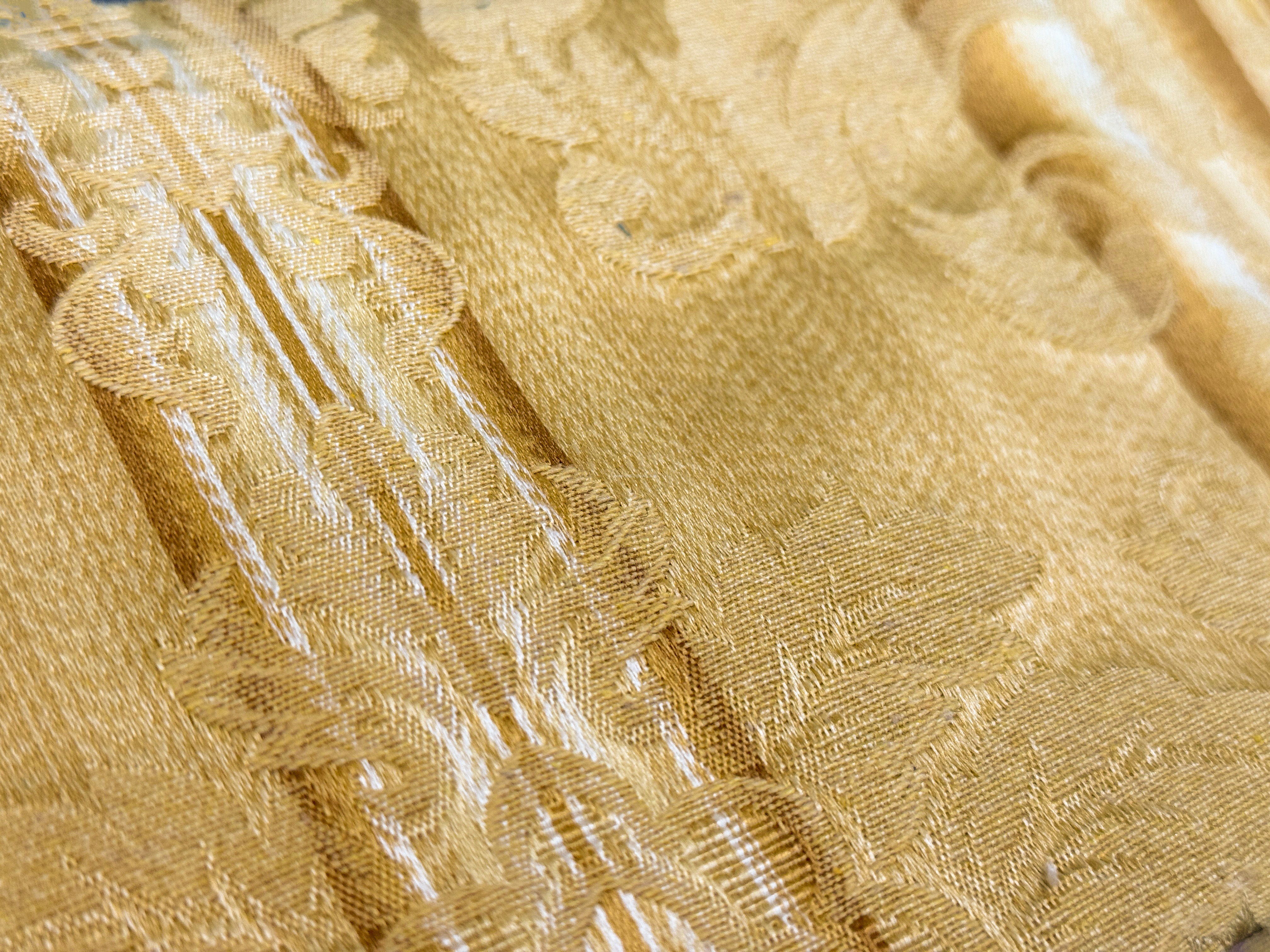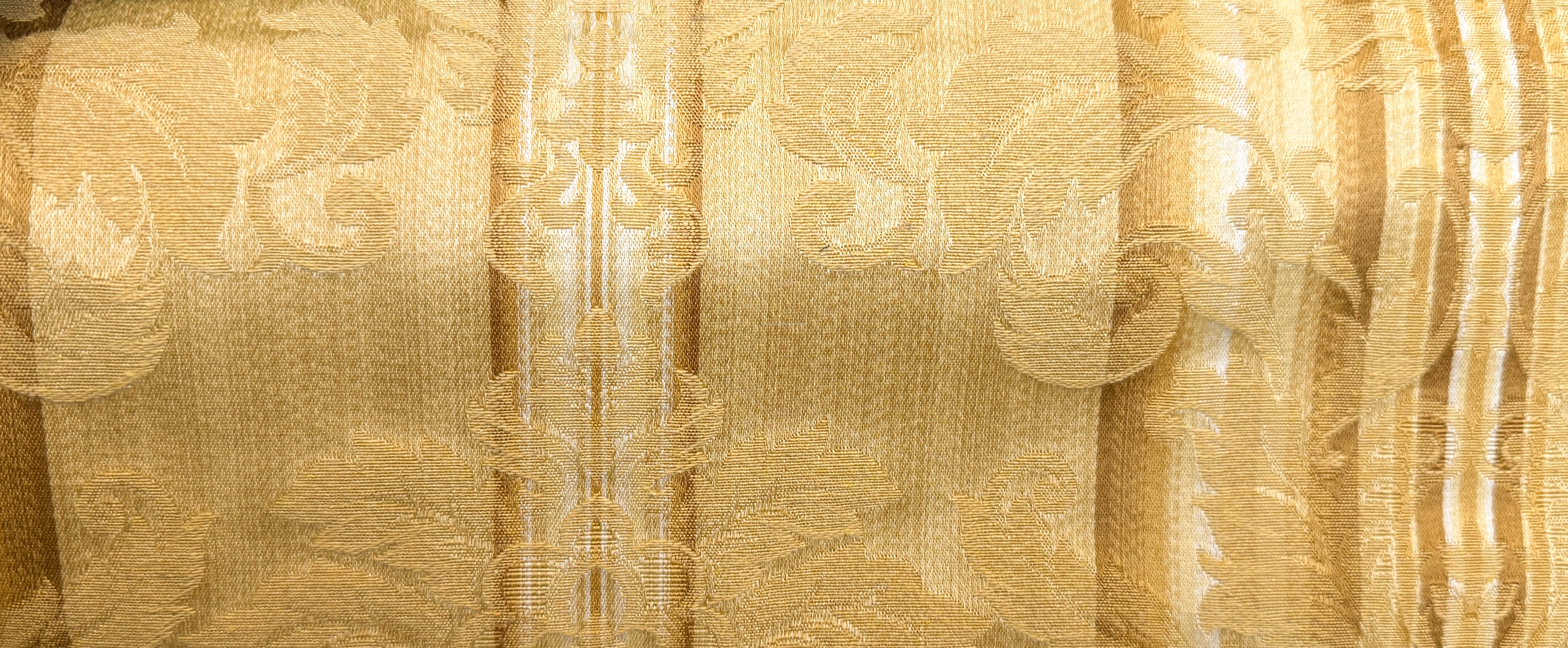 Włoski materiał Castello to elegancka tkanina tapicerska o wyrazistym, klasycznym charakterze. Złoty połączony ze złotymi, ornamentalnymi zdobieniami tworzy efekt luksusu inspirowanego stylami pałacowymi i secesyjnymi. Subtelne pasy dodają harmonii i podkreślają dekoracyjny rytm wzoru, sprawiając, że materiał pięknie układa się na meblach.