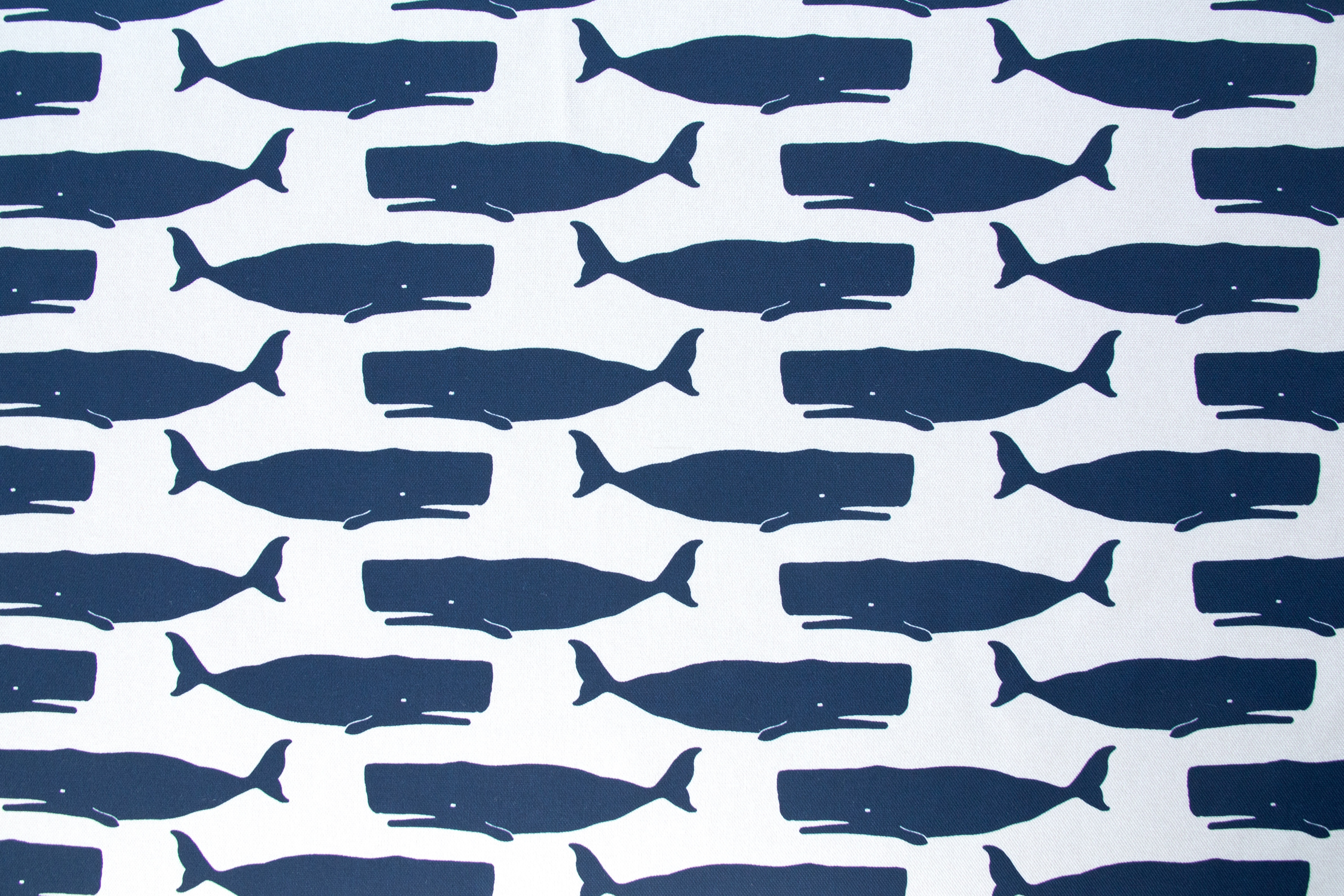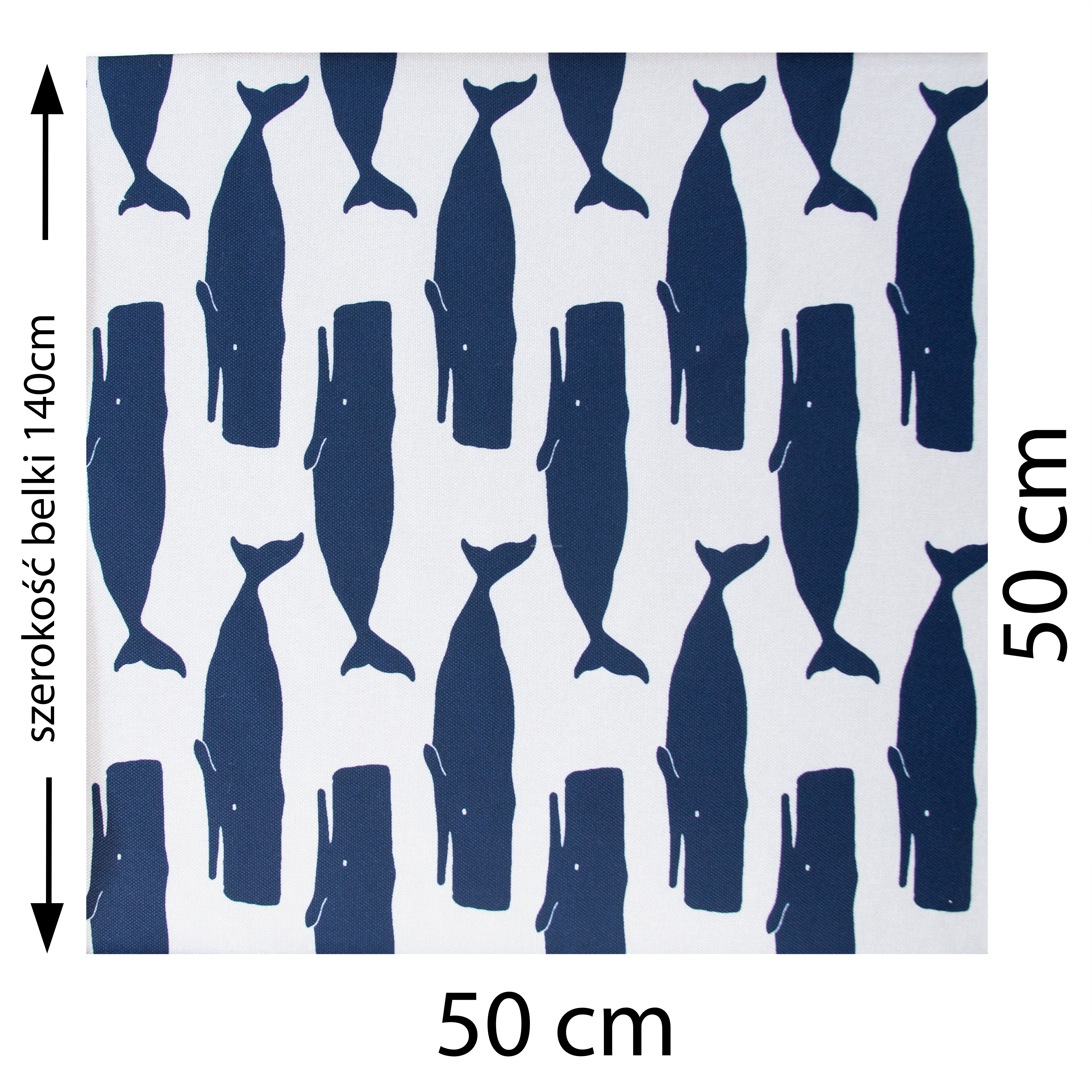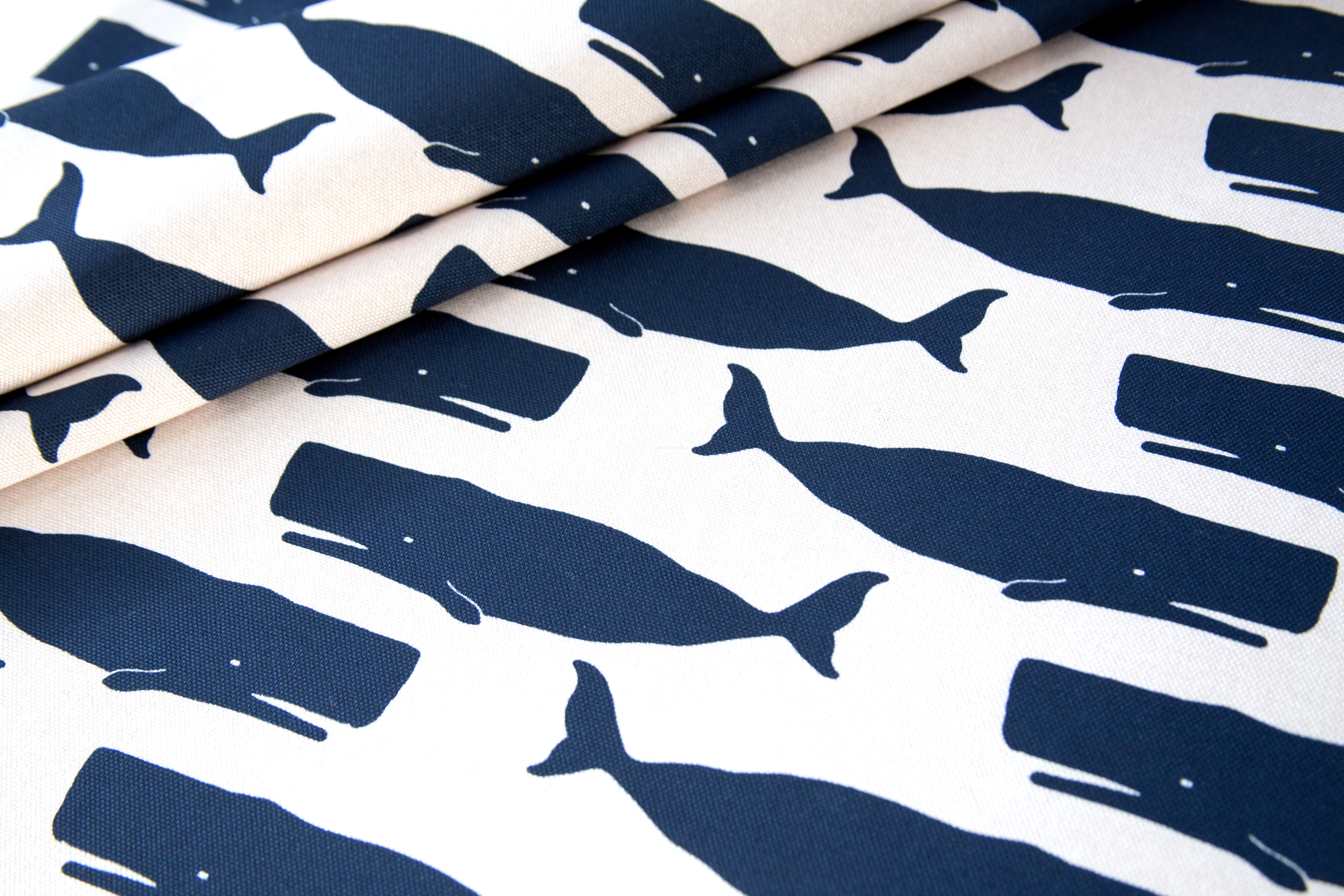 Tkanina Wieloryby to materiał o drobnym, gęstym splocie z zachwycającym wzorem granatowych wielorybów. Delikatna w dotyku, a jednocześnie mocna, trwała i odporna na codzienne użytkowanie, doskonale sprawdzi się w rozmaitych aranżacjach nie tylko inspirowanych morzem i naturą.