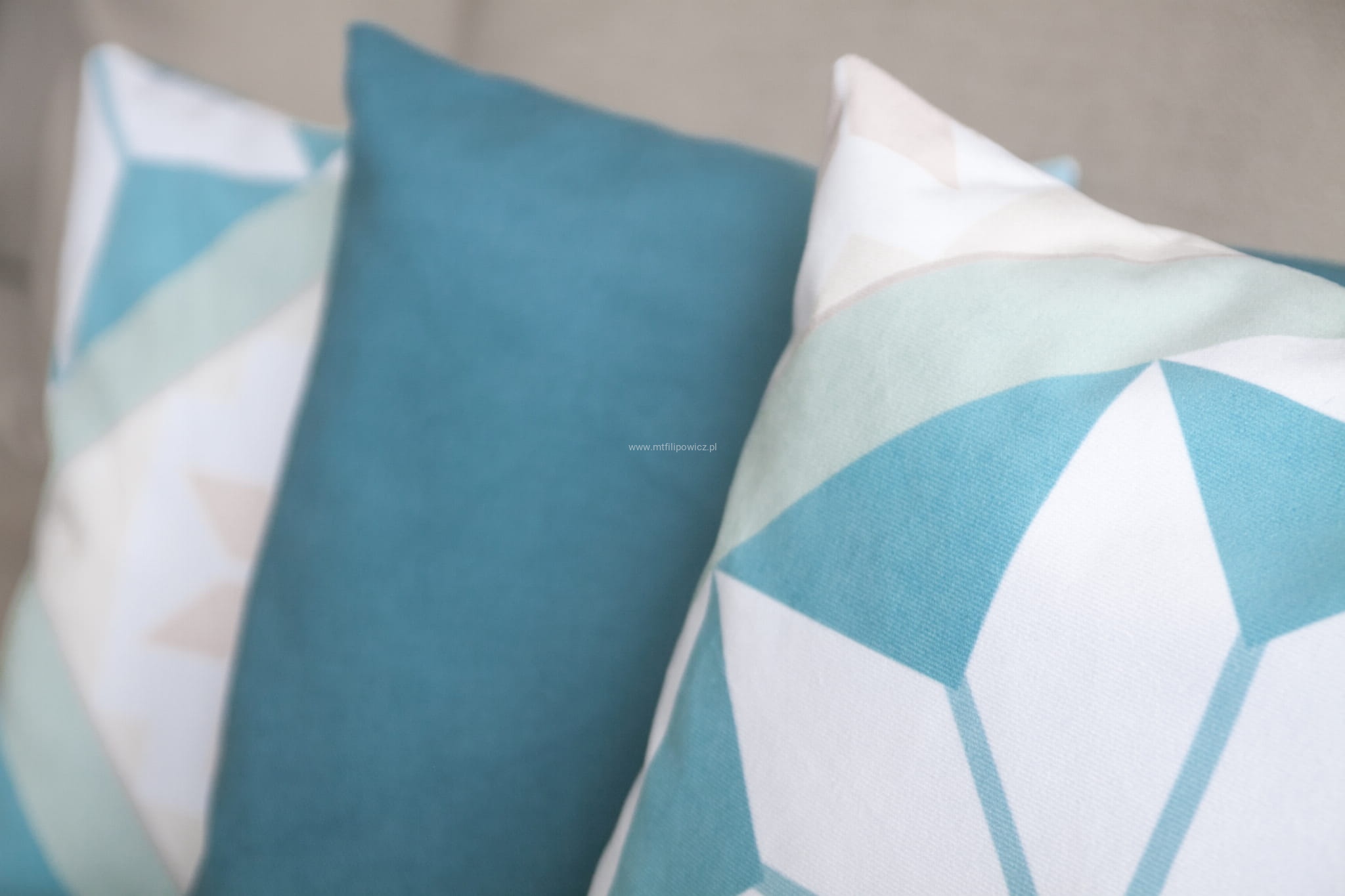 Trzy poduszki dekoracyjne w odcieniach bieli, beżu i turkusu.